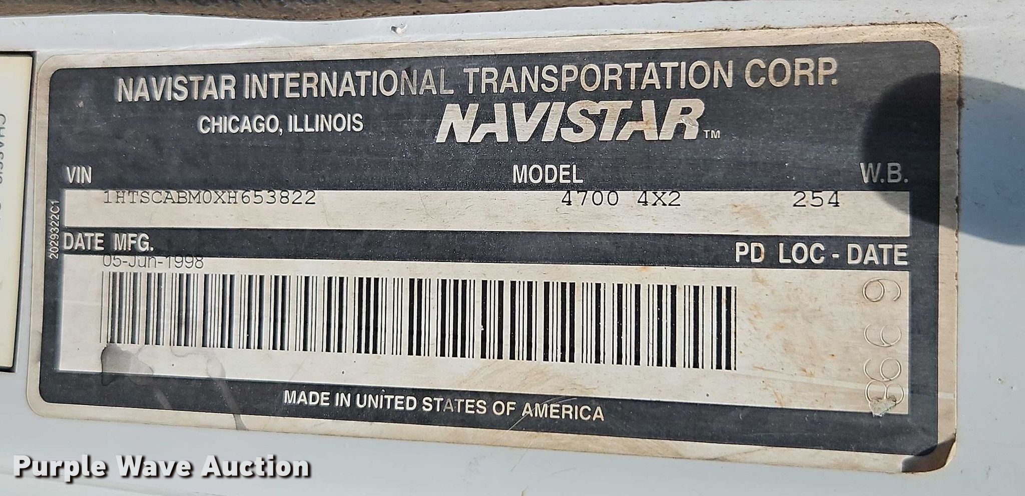 Purple Wave is selling a used Flat Bed Truck in Kansas. This item is a 1999 International 4700 flatbed truck with crash attenuator with the following: Miles: 120,369 on odometer, VIN: 1HTSCABM0XH653822, Unit #: 5-033