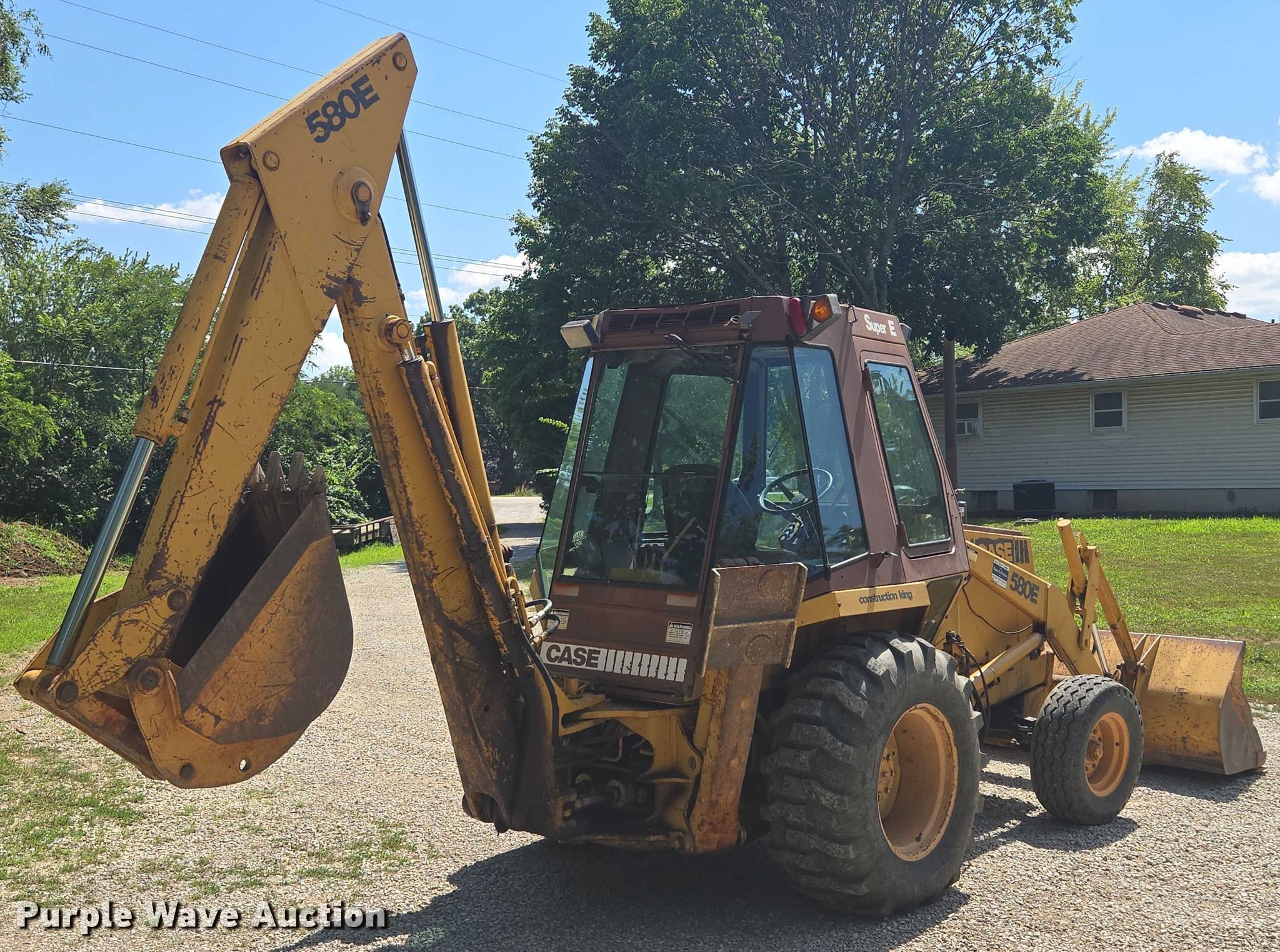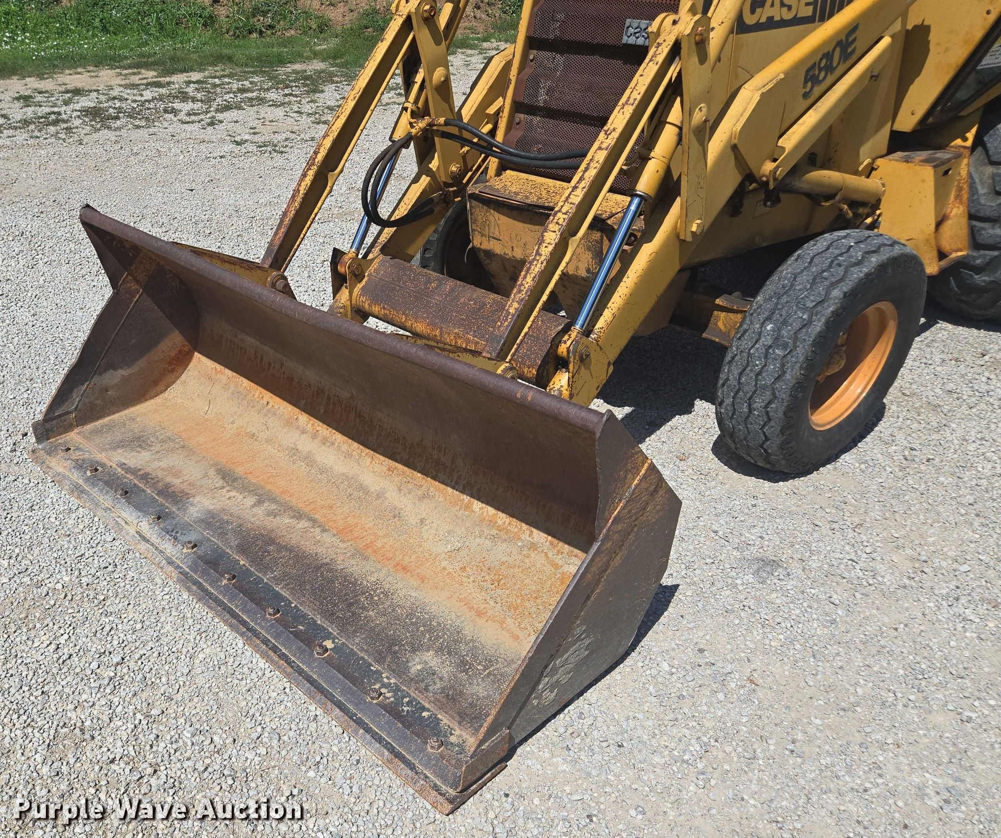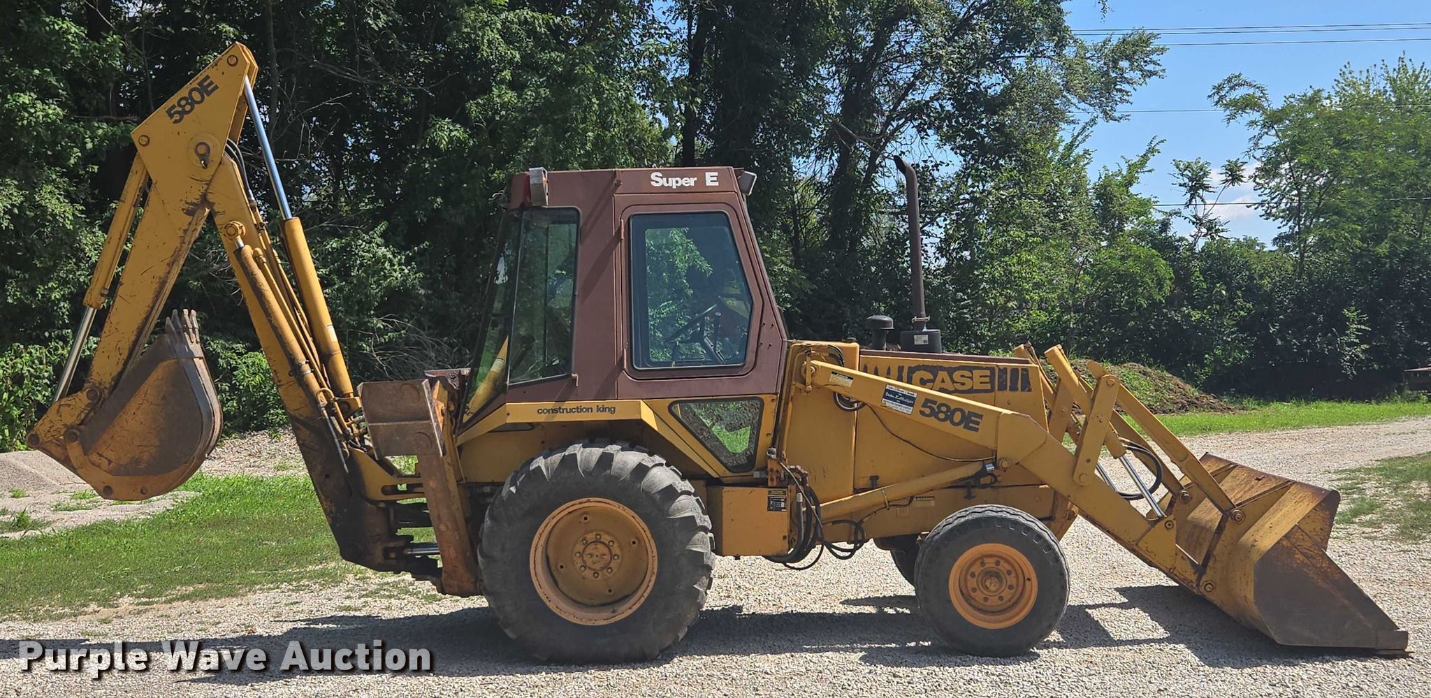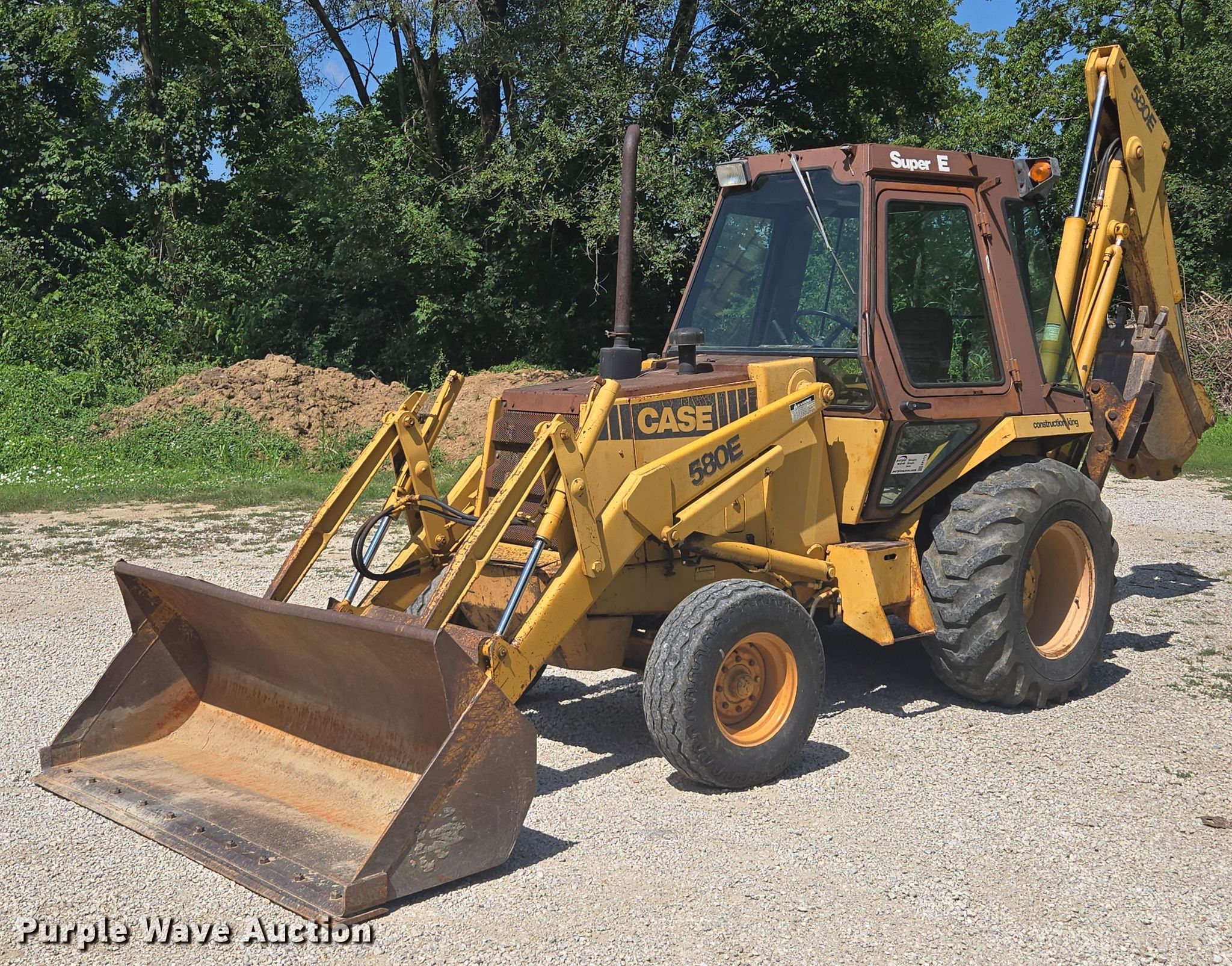 1984 Case 580E backhoe. Hours: 2,311 on meter, Serial: 5481637. Engine Case, Cylinders: 4, Fuel type: Diesel. Transmission Shuttle shift, 3F - 3R. Chassis Differential lock. Operators station Enclosed cab, Heat, Backhoe controls: Wobble stick / two stick. Features Loader Bucket Width: 82", Cutting edge: Bolt-on, Backhoe Bucket Width: 18", Cutting edge: Weld-on, Teeth: 4.. Tires Front: 11L-16SL, Rear: 17.5L-24. Notes (4) additional buckets, Left outrigger issue, hydraulic cylinder leak. Independence, MO 64057