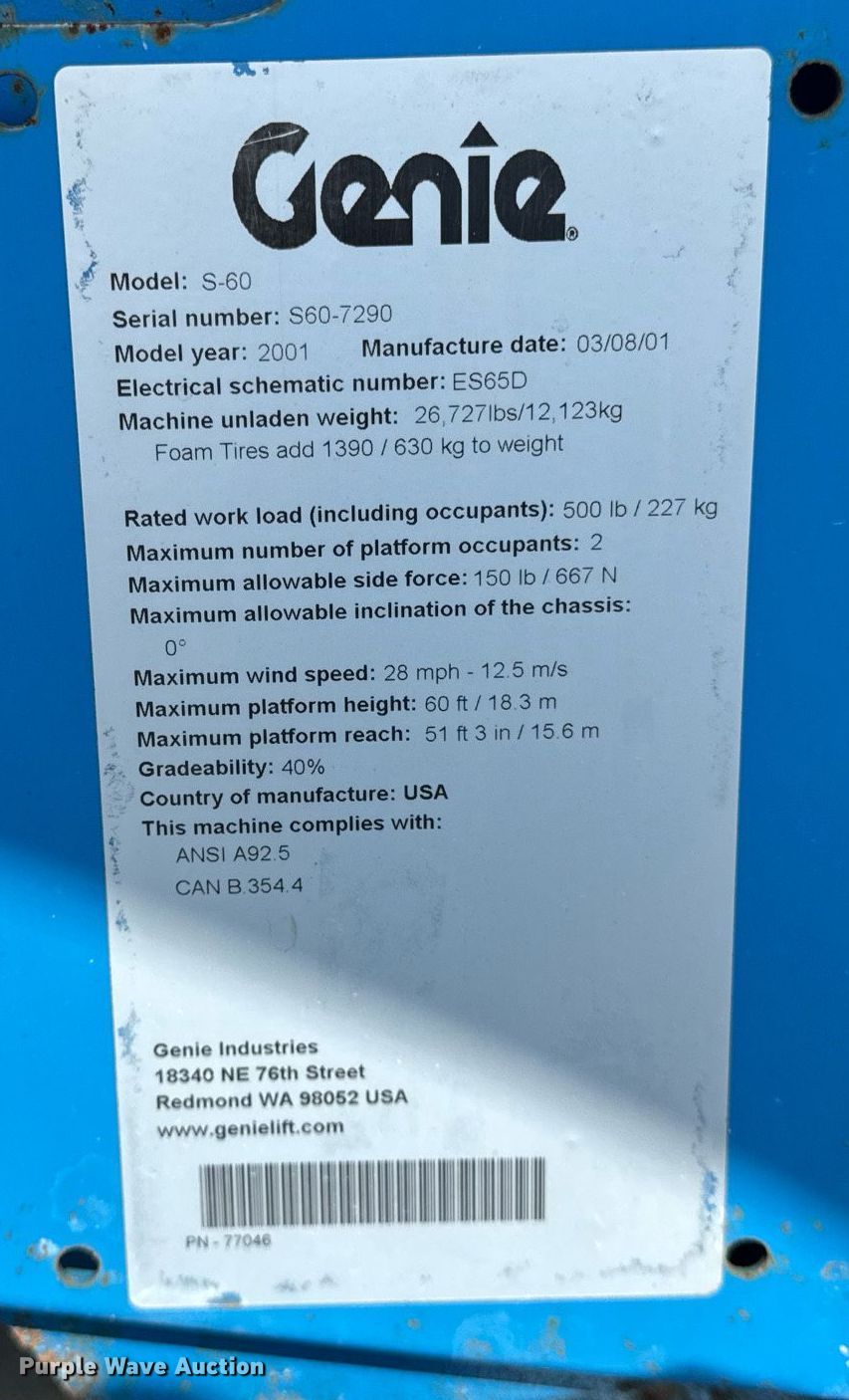 Purple Wave is selling a used Boom Lift in Illinois. This item is a 2001 Genie S60 boom lift with the following: Hours: 2,001 on meter, Serial: S60-7290