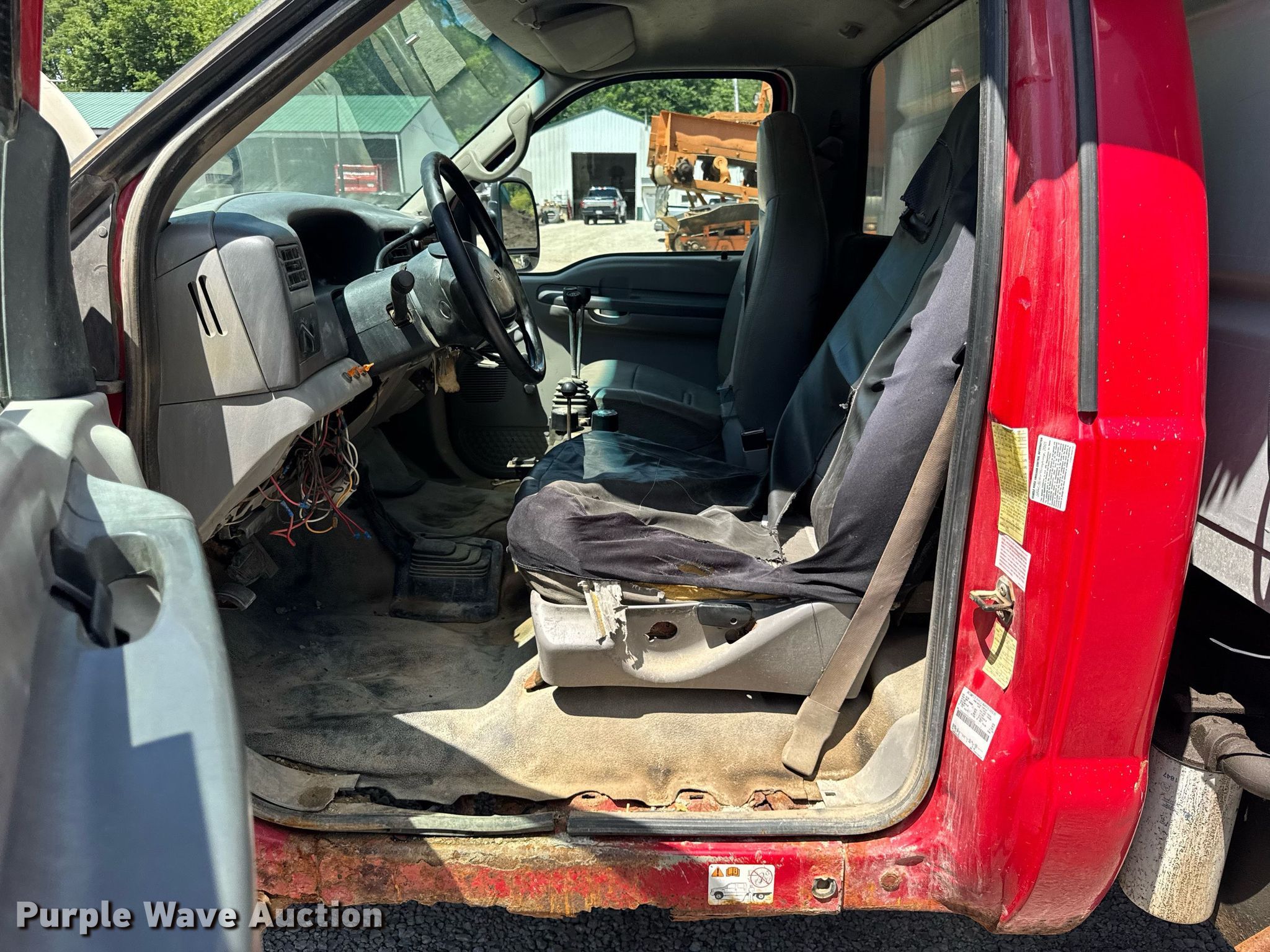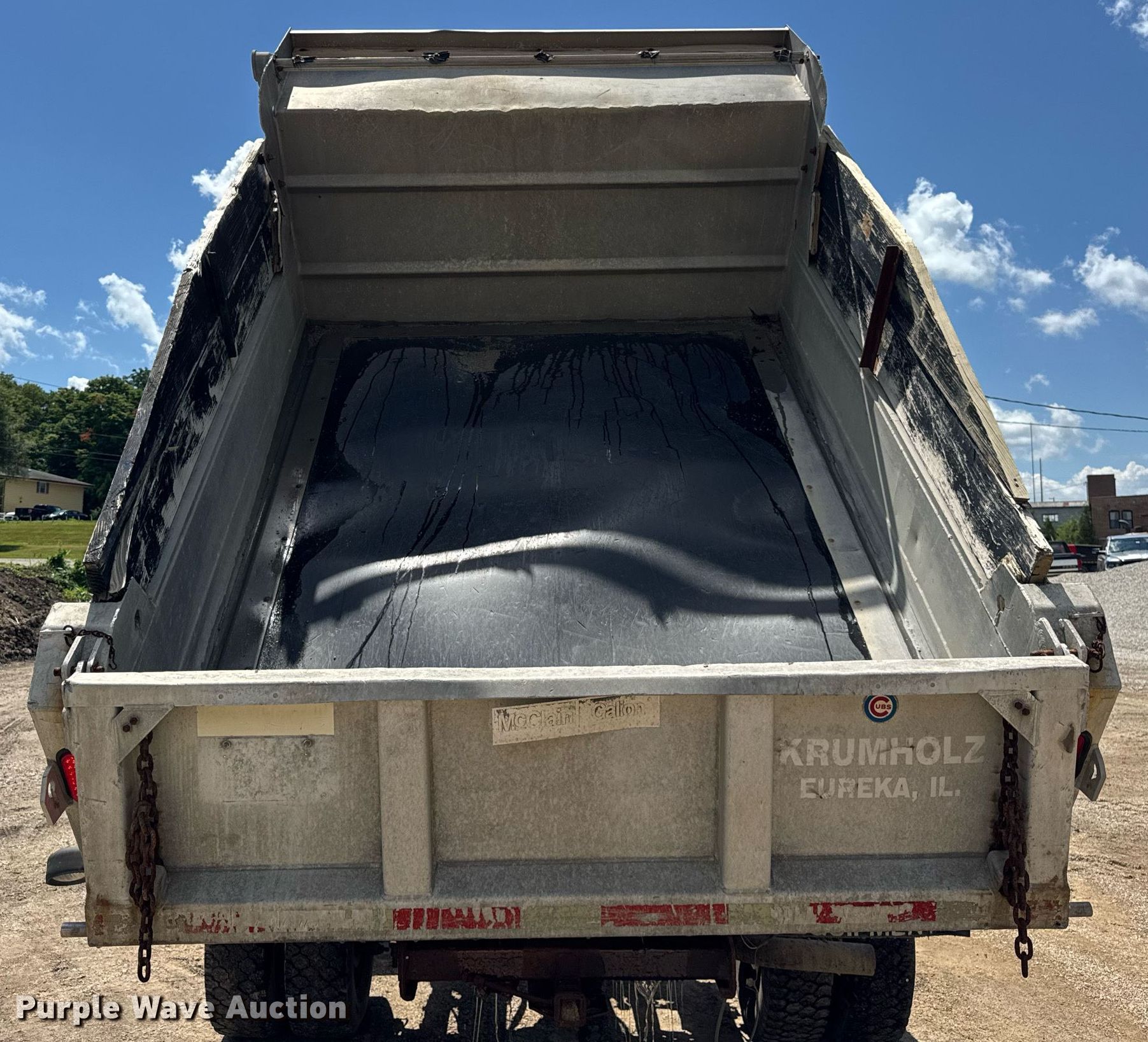 2001 Ford F550 dump truck. Miles: 183,527 on odometer, VIN: 1FDAF57F91EC85503. Engine Displacement: 7.3L, Cylinders: 8, Fuel type: Diesel, HP: 215. Transmission Automatic. Chassis Axles: Single, Suspension: Spring, Brakes: Hydraulic, PTO, Four wheel drive. Interior AC, Heat. Features Dump bed McClain Galion, 9' L x 96" W, Side height: 19", Side board height: 18", Bed type: Steel. Tires Size: 245/70R19.5. Notes Passenger door latch issues, Dash warning indicator: ABS, Rear tire flat. Illinois title. Title distribution may be delayed up to 14 days from verification of funds. Krumholz Trucking Inc. Eureka, IL 61530