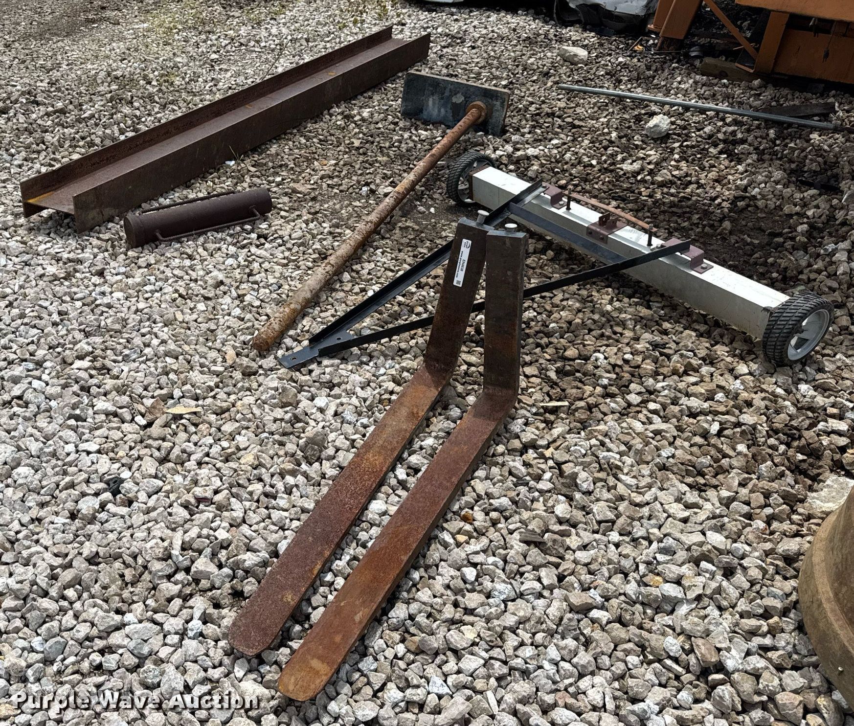 Purple Wave is selling a used Forklift Attach. in Missouri. This item is a Fork lift attachments with the following: Forklift carpet roll attachment, Forklift forks, Fork Length: 48", I-beam: 11' 7", Pull type magnet, Width: 60"
