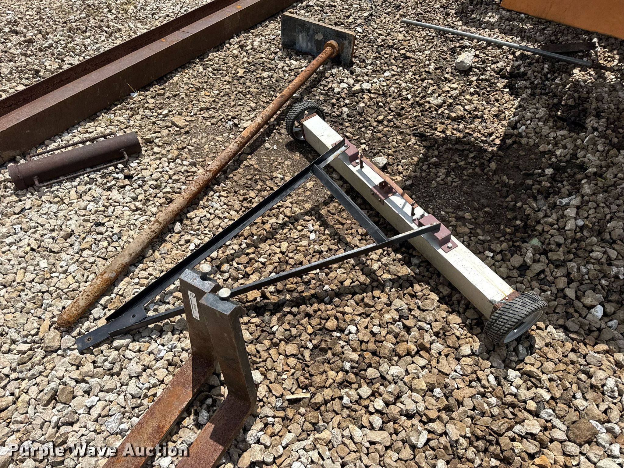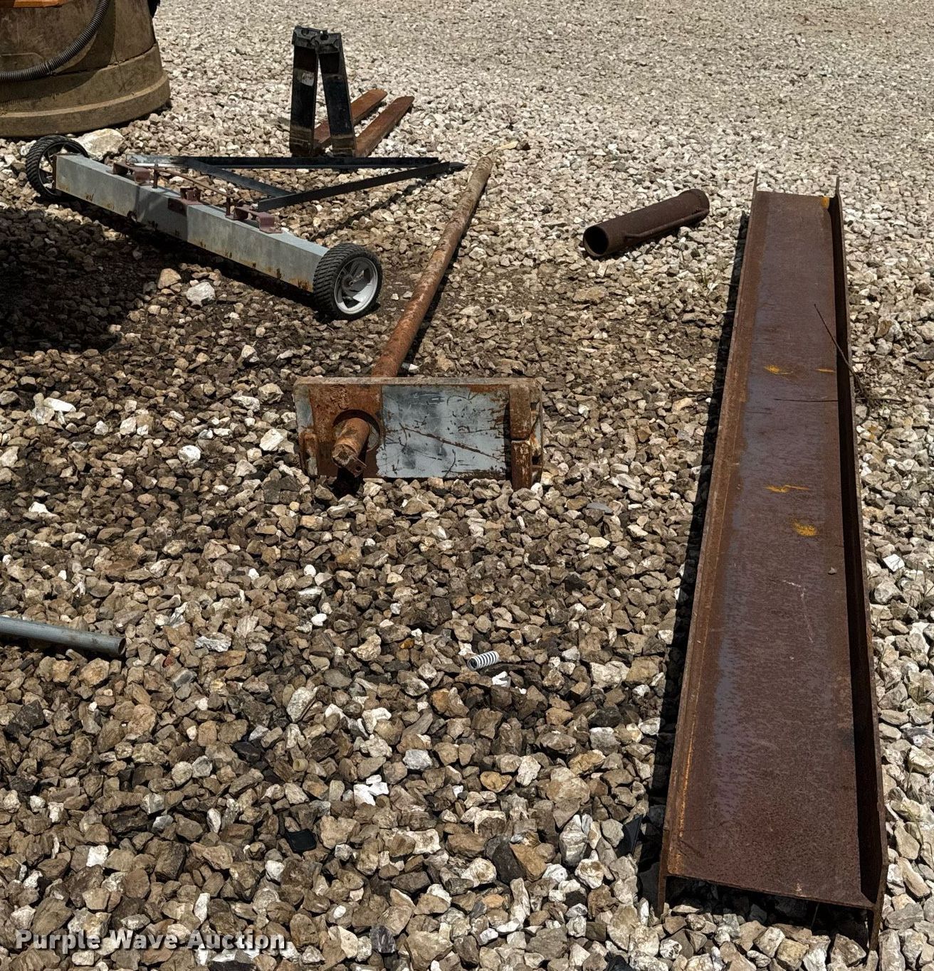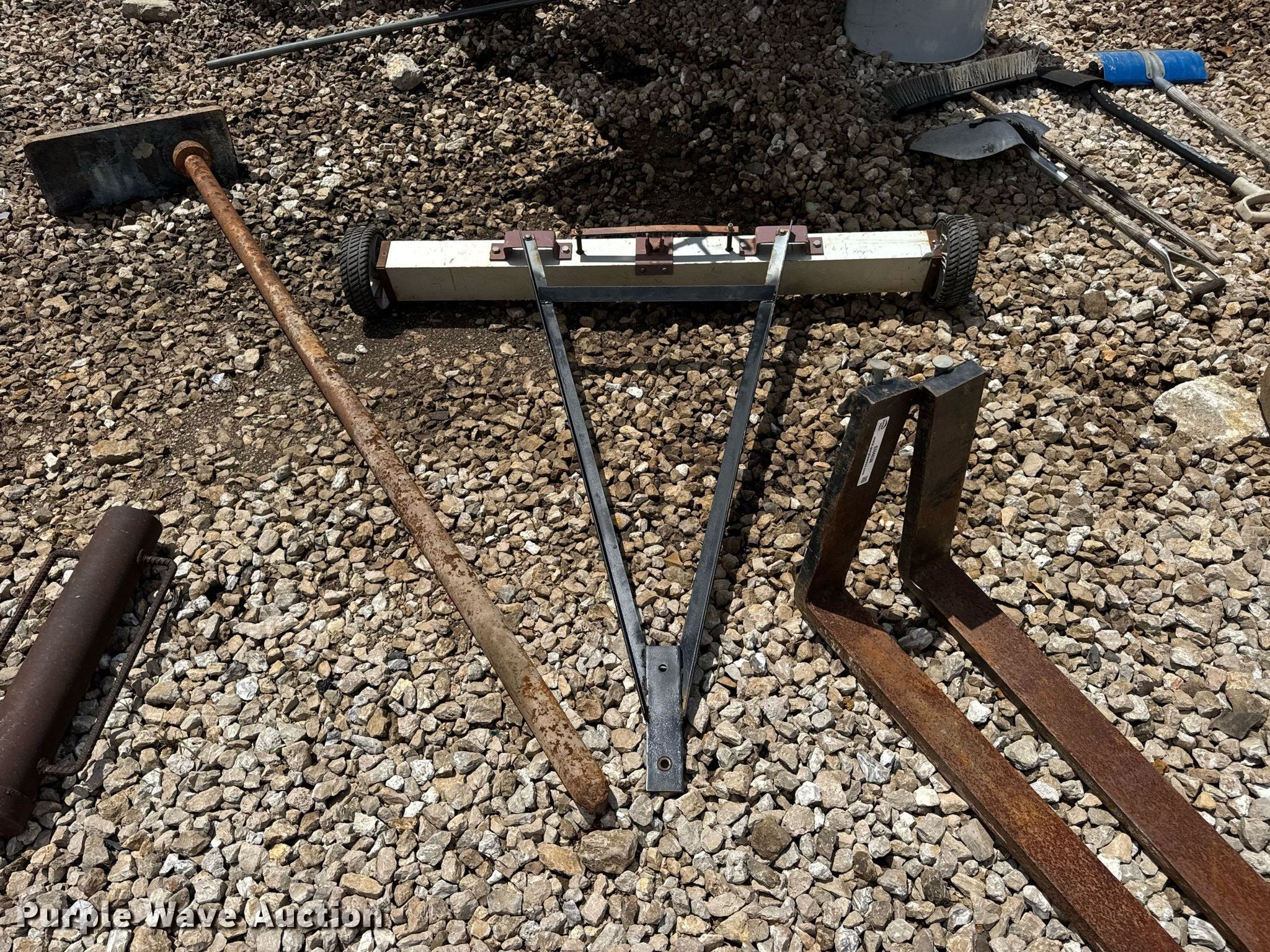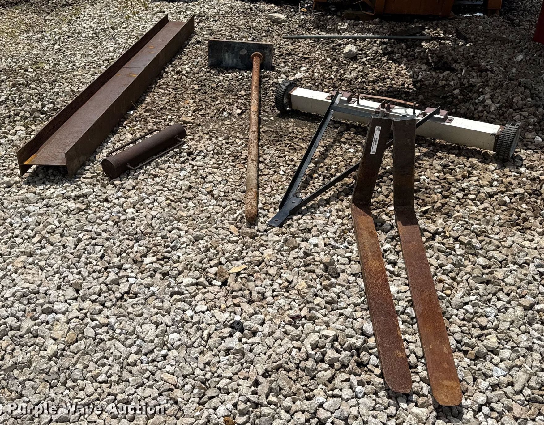 Fork lift attachments. Forklift carpet roll attachment, Forklift forks, Fork Length: 48", I-beam: 11' 7", Pull type magnet, Width: 60". Reed's Automotive. Eldon, MO 65026