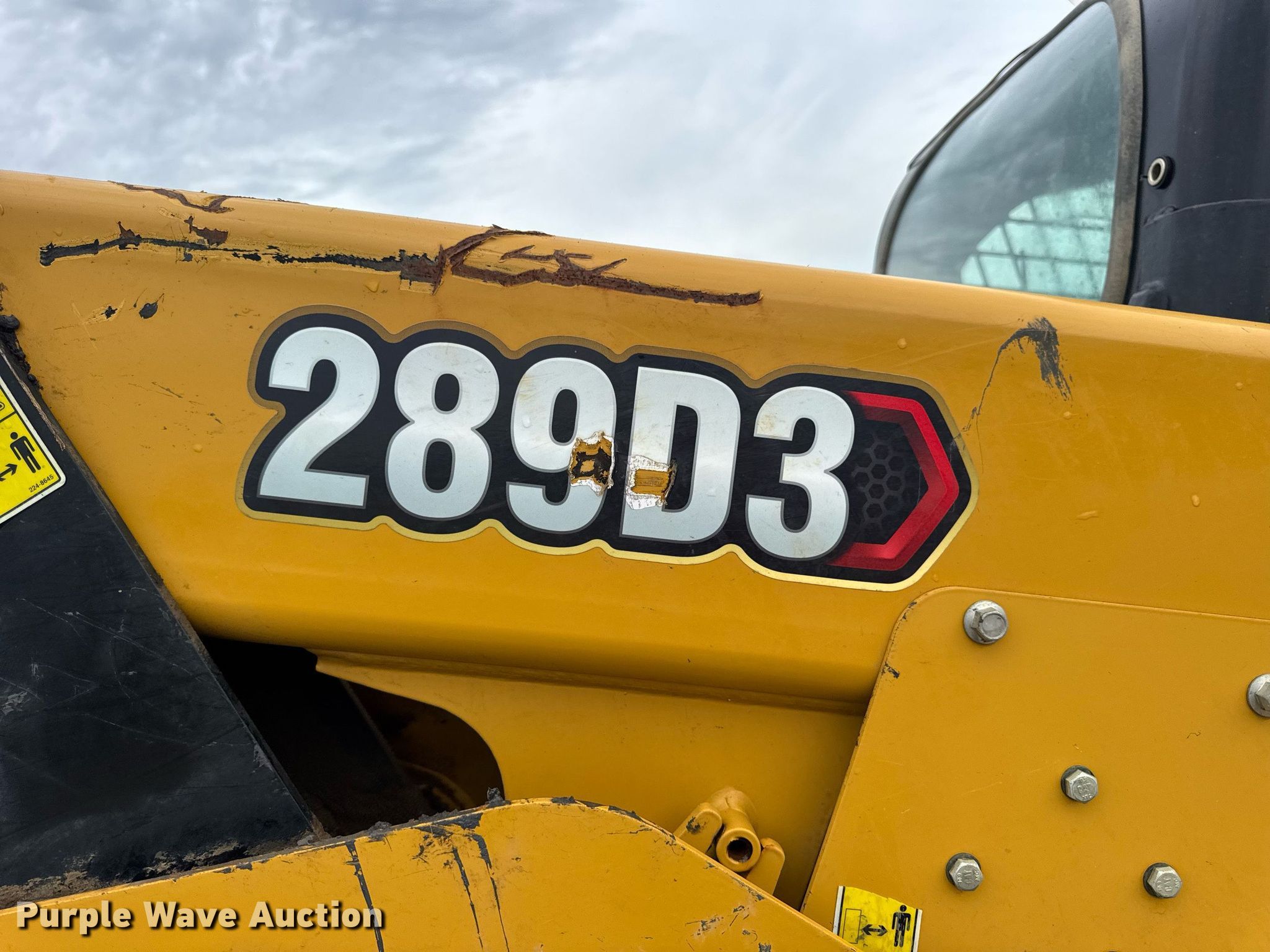 2022 Caterpillar 289D3 tracked skid steer loader. Hours: 2,943 on meter, Serial: CAT0289DEJX910359, Unit #: 7114. Engine Caterpillar C3.3B, Serial: 8PG4143, Displacement: 3.3L, Cylinders: 4, Fuel type: Diesel. Transmission Hydrostatic, Two speed travel. Operators station Enclosed cab, AC, Heat, Bucket control: Hand, Electronic Monitoring System panel. Features Auxiliary hydraulics, Auxiliary electrical outlet, Quick coupler: Hydraulic, Counter weights, Bucket Caterpillar, Width: 86", Cutting edge: Bolt-on, Forks Length: 45". Tracks Width: 18". Notes Door seal issues, Tracks damaged, need replaced. Hardy Holding Group. Boonville, MO 65233