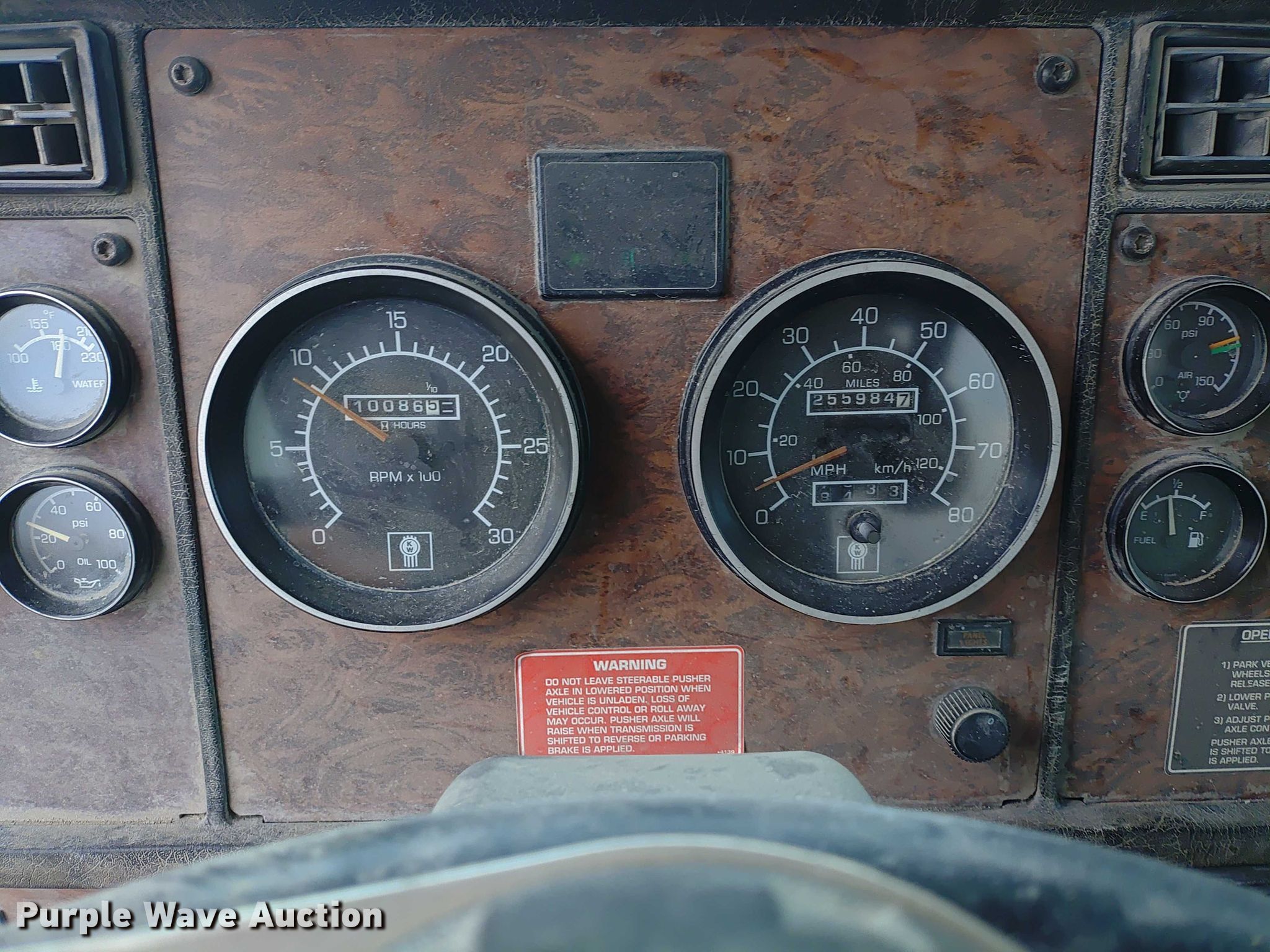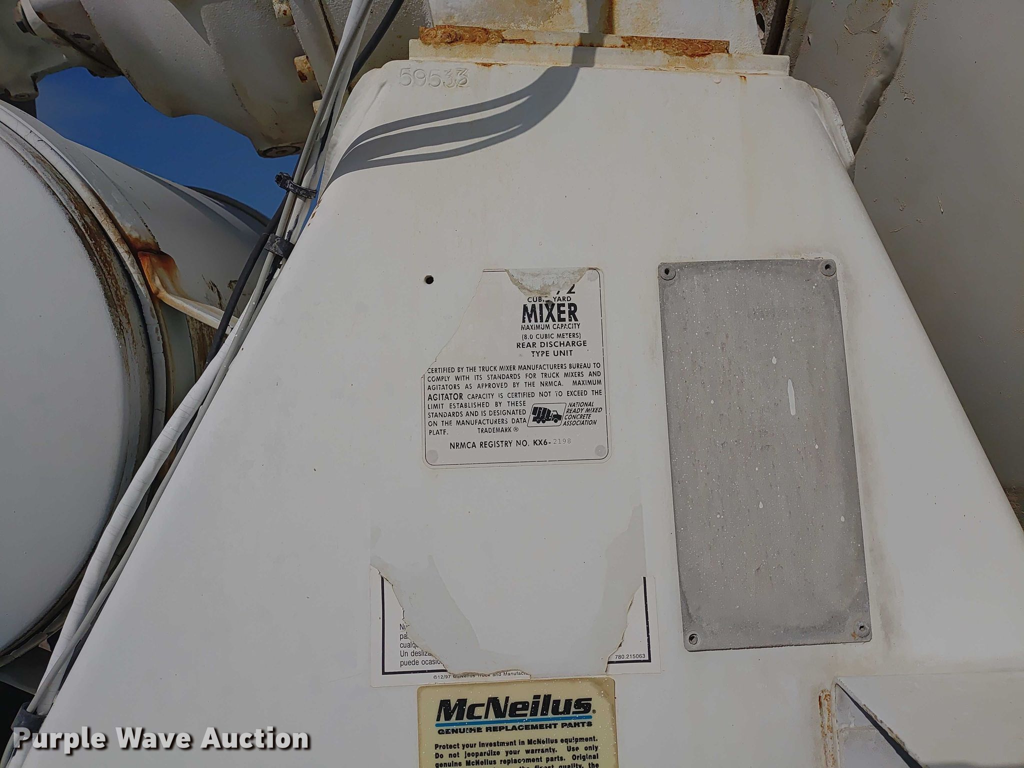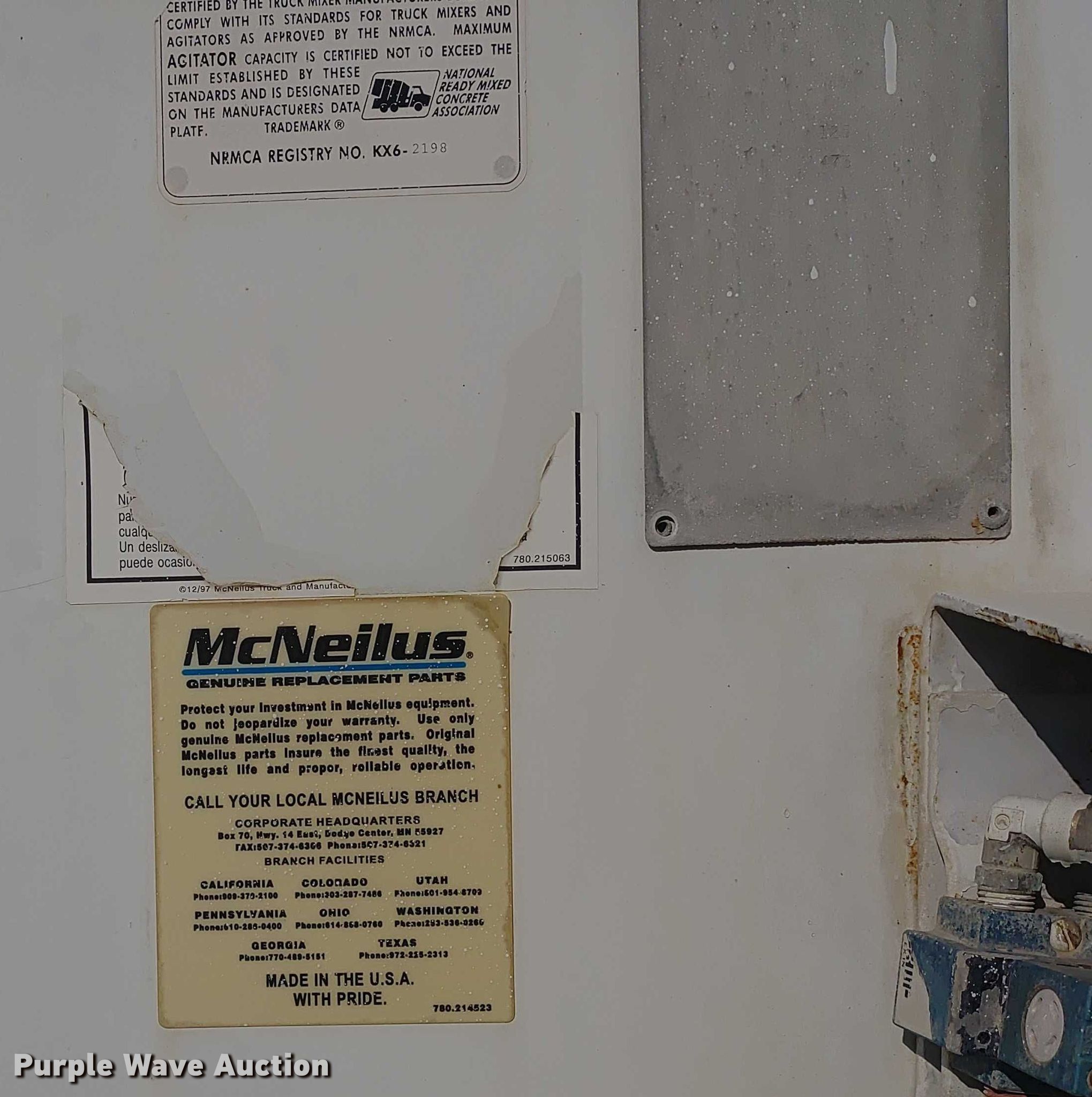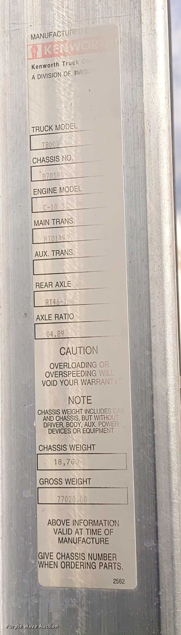 2001 Kenworth T800 ready mix truck. Miles: 255,985 on odometer, Hours: 10,087 on meter, VIN: 1NKDXTEX21S878585. Engine Caterpillar C-10, Serial: 3CS19257, Displacement: 10.3L, Cylinders: 6, Fuel type: Diesel, HP: 335. Transmission Eaton Fuller, Manual, Speed: 11. Chassis Axles: Triple, Pusher axle Steerable, Differential lock: Full, Suspension: Spring over walking beam, Brakes: Air, PTO, GVWR: 77,020 lbs FAWR: 20,000 lbs, IAWR: 23,000 lbs, RAWR: 23,000 lbs, Lift axle GAWR: 11,020 lbs. Interior AC, Heat, Heated mirrors, Cruise control. Features Mixer McNeilus, Capacity: 10.5 cu.yd., Discharge: Rear, In-cab controls, Rear drum controls, Water tank capacity: 125 gallons, Chute Extensions: 3, Chute type: Steel.. Tires Front: 425/65R22.5, Rear: 11R22.5, Lift axle: 255/70R22.5. Kansas title. Title distribution may be delayed up to 14 days from verification of funds. Midwest Concrete Materials, Inc.. Manhattan, KS 66502