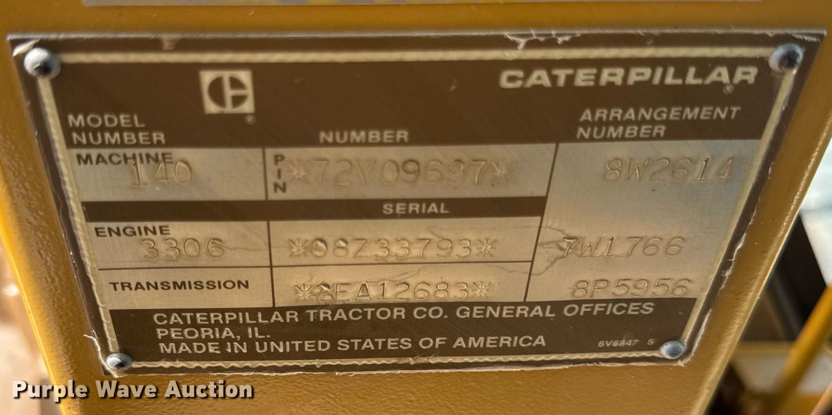 Purple Wave is selling a used Motor Grader in Illinois. This item is a 1986 Caterpillar 140G motor grader with the following: Hours: 6,719 on meter, Serial: 72V09697