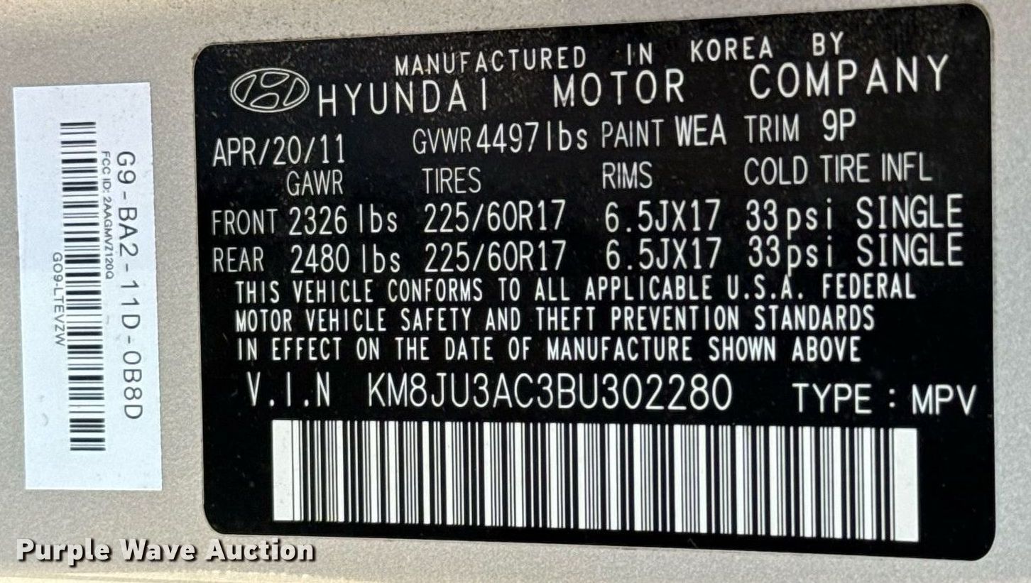 Purple Wave is selling a used Passenger Vehicle in Oklahoma. This item is a 2011 Hyundai Tucson SUV with the following: Miles: 93,695 on odometer, VIN: KM8JU3AC3BU302280