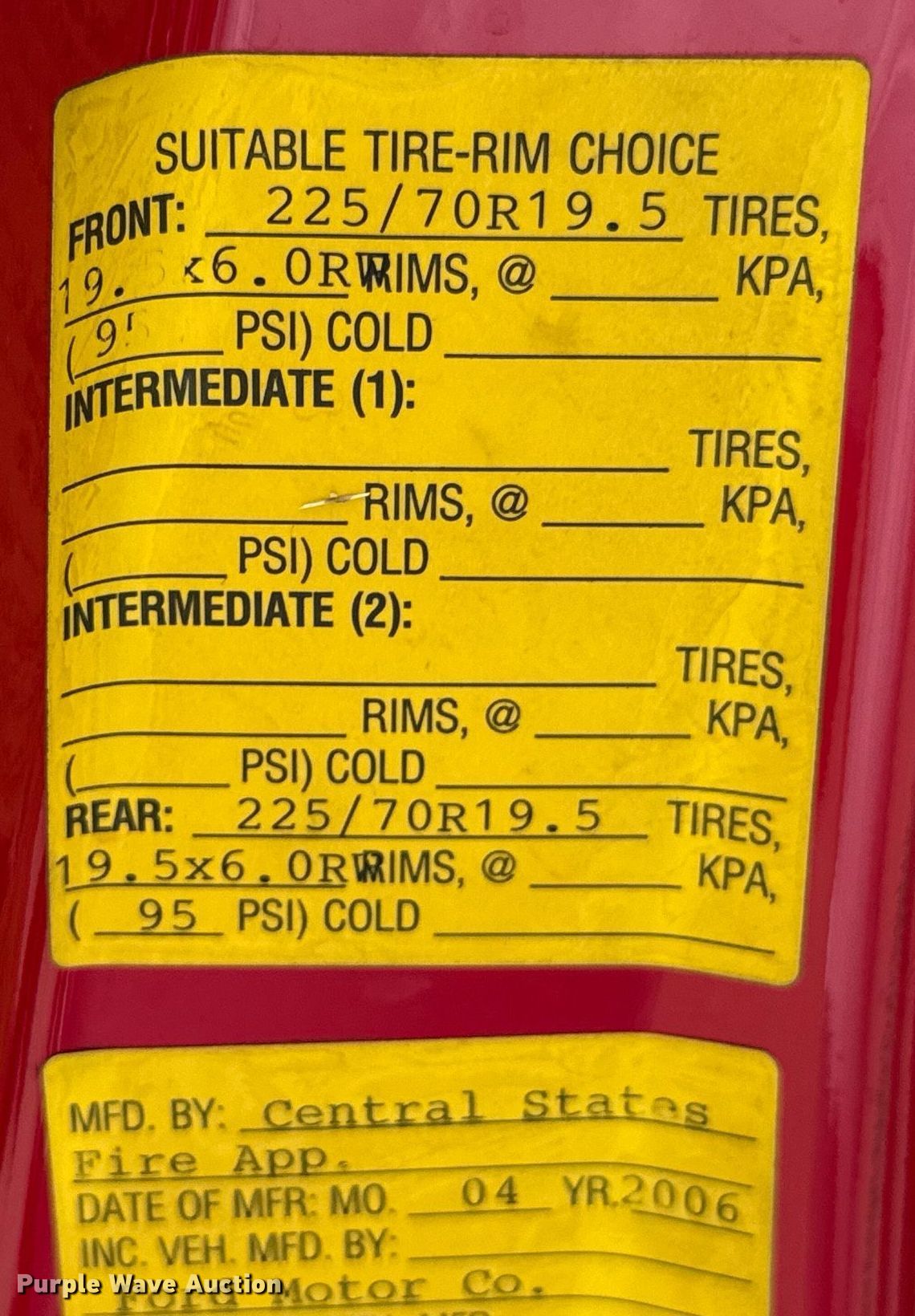 2006 Ford F550 pumper fire truck. Miles: 61,935 on odometer, VIN: 1FDAF57P16EB61760. Engine Displacement: 6.0L V8 SOHC, Cylinders: 8, Fuel type: Diesel. Transmission Automatic. Chassis Four wheel drive, Axles: Single, Suspension: Spring, Brakes: Hydraulic, GVWR: 17,950 lbs, Wheelbase: 165". Interior AC, Heat, Power windows, Power locks, Cruise control, Auxiliary controls. Features Fire truck body Tank, Pump 400 gpm, PA/ siren controls. Tires Size: 225/70R19.5. Notes Dead battery. Kansas title. Title distribution may be delayed up to 14 days from verification of funds. City of Pittsburg. Pittsburg, KS 66762
