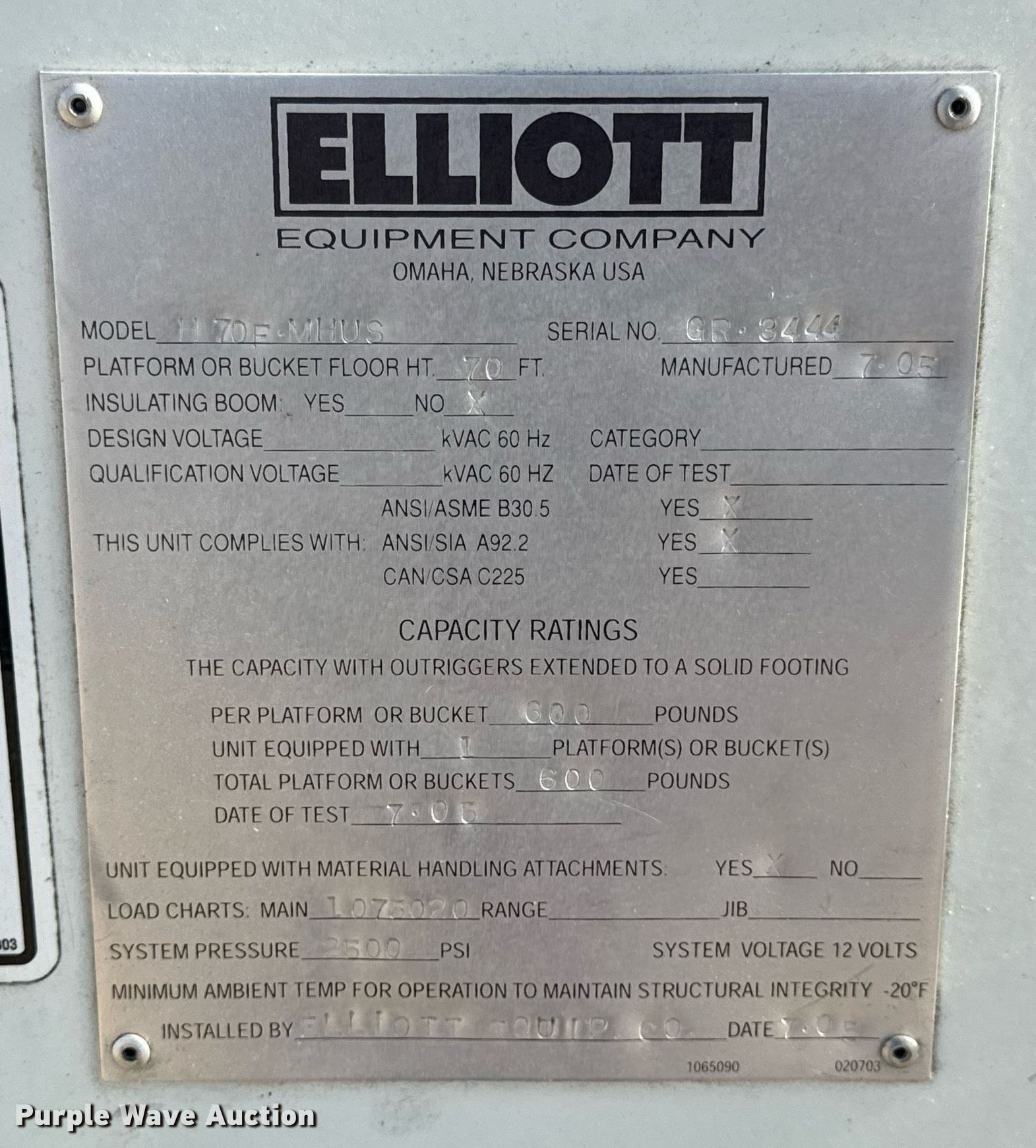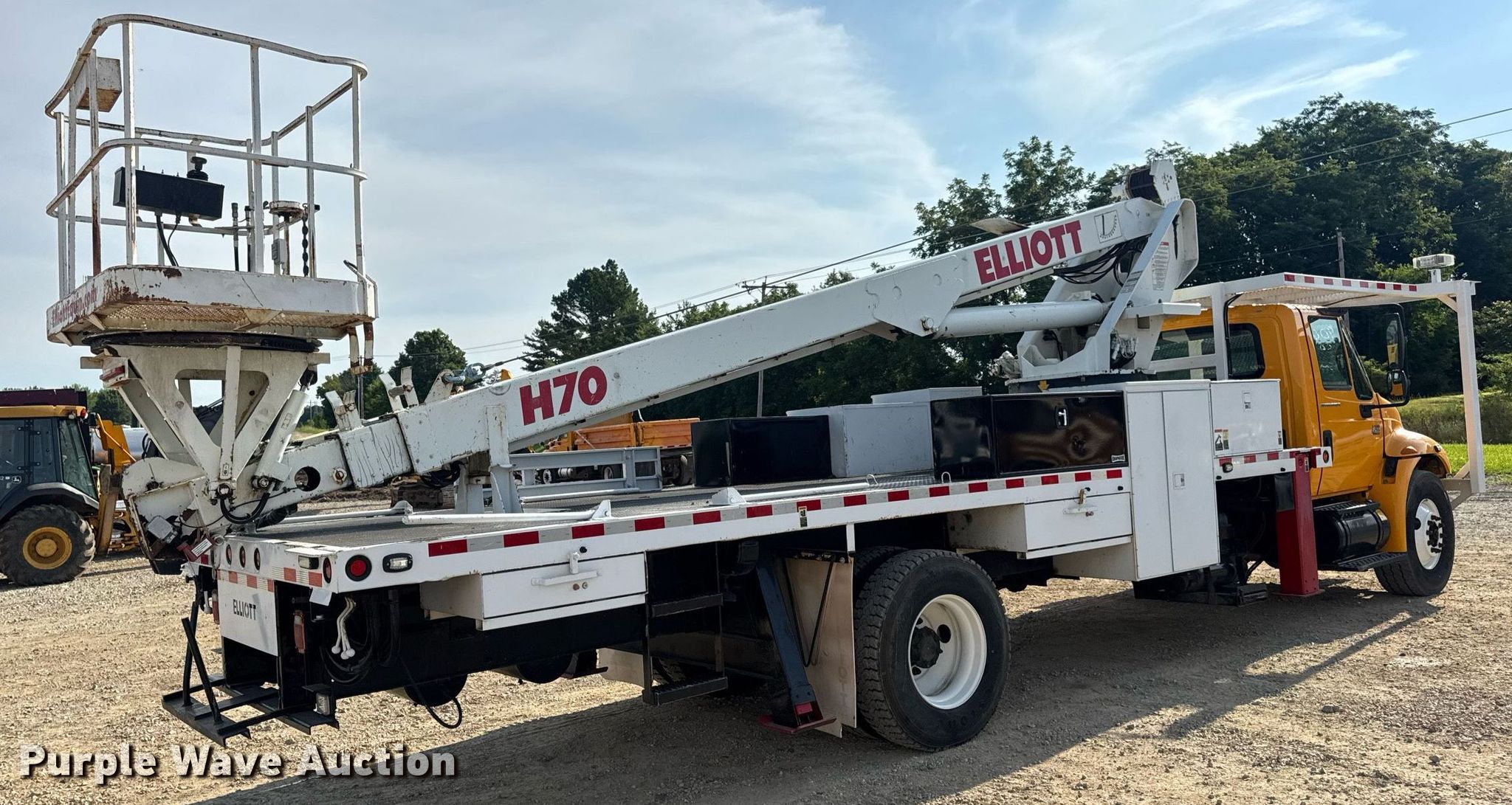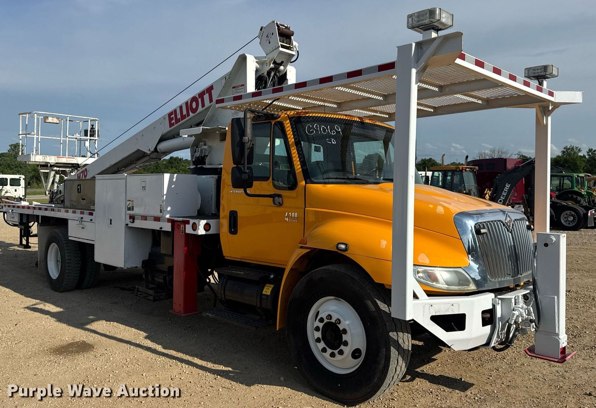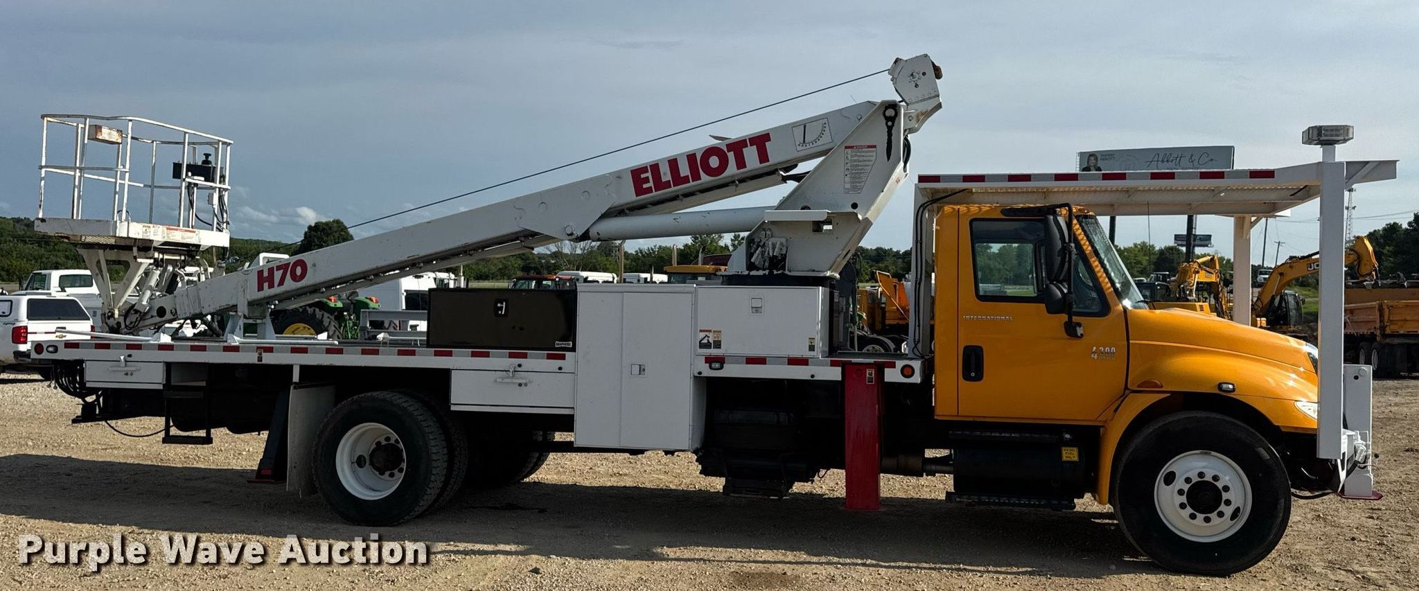2006 International 4300 forestry bucket truck. Miles: 135,072 on odometer, Hours: 8,548 on meter, VIN: 1HTMMAAR36H183075, Unit #: G9069. Engine International DT466, Displacement: 7.6L, Cylinders: 6, Fuel type: Diesel. Transmission Automatic. Chassis Axles: Single, Suspension: Spring, Brakes: Air, PTO, GVWR: 35,000 lbs. Interior AC, Heat, Heated mirrors, Power windows, Power locks, Cruise control, Auxiliary controls. Features Bed Omaha Service Bodies, Serial: 40552, Length: 24' 3", Width: 98", Boom 2005 Elliot H70F-MHUS, Serial: GR-3444, Maximum lift capacity: 600 lbs, Maximum lift height: 70', Boom type: Telescopic, Man basket, Boom controls Ground, Platform/ basket, Material handler. Tires Front: 315/80R22.5, Rear: 11R22.5. Notes Unknown operating condition of platform/ basket controls. Missouri title. Title distribution may be delayed up to 14 days from verification of funds. Missouri Department of Transportation. New Bloomfield, MO 65063