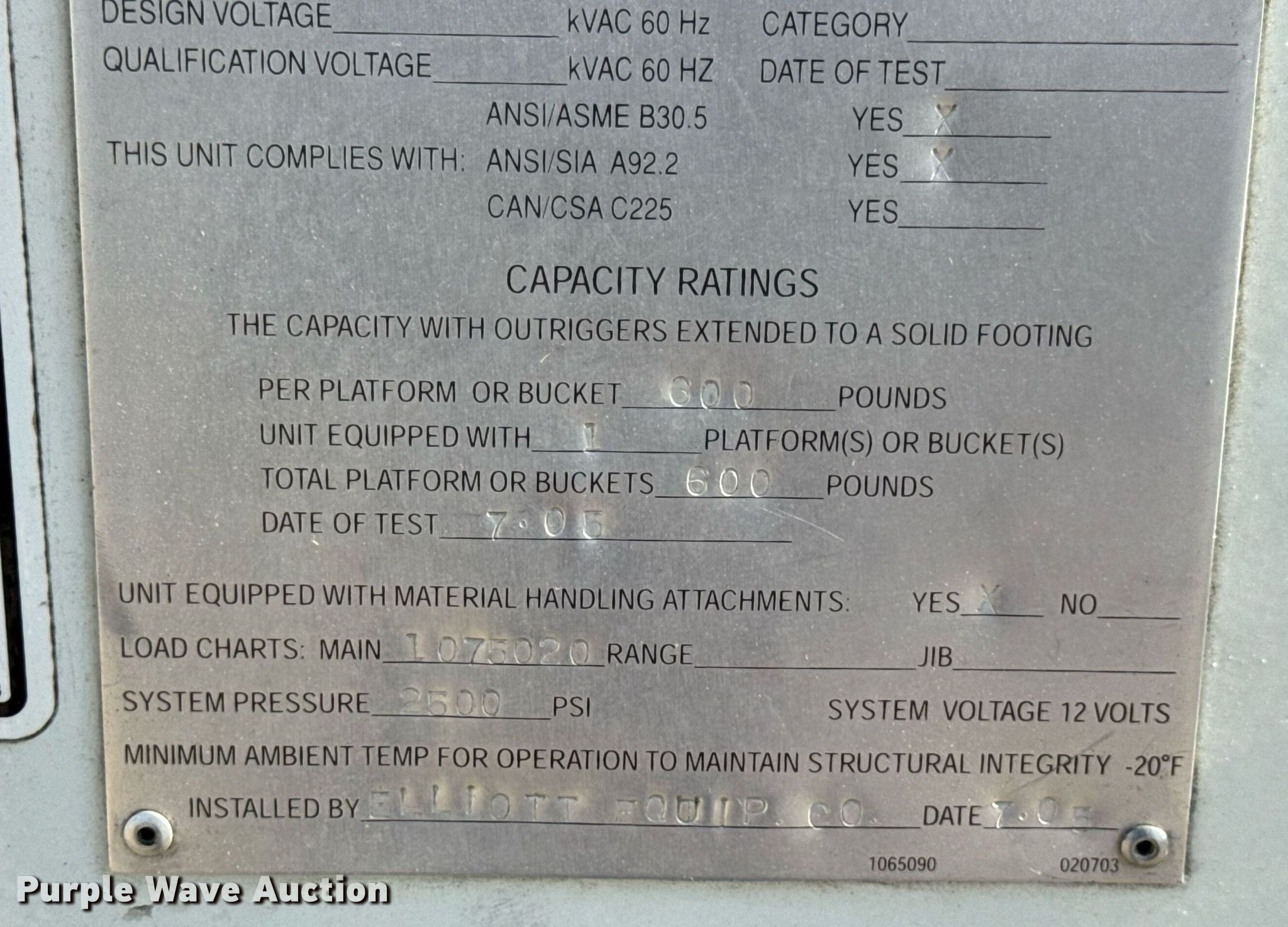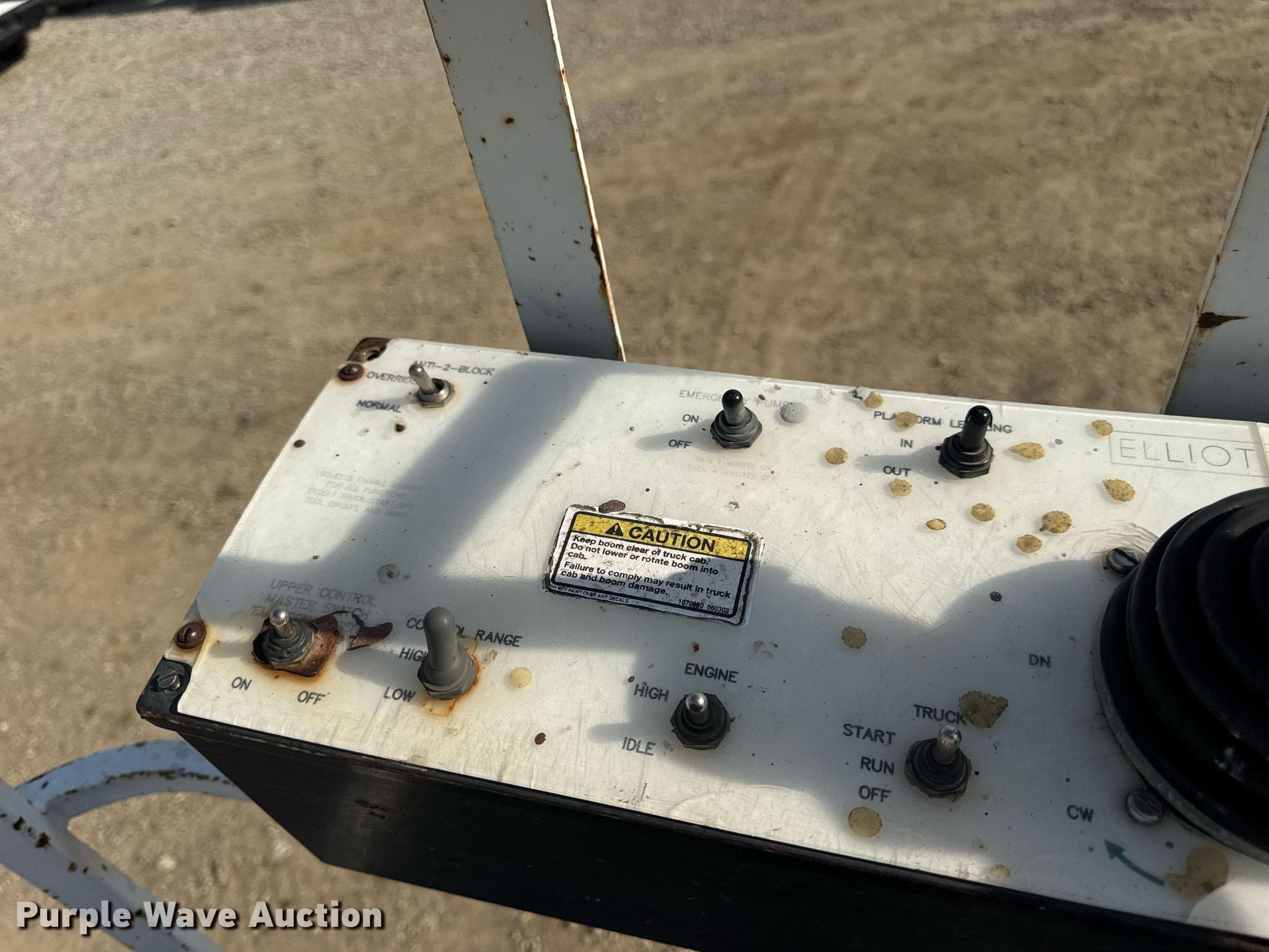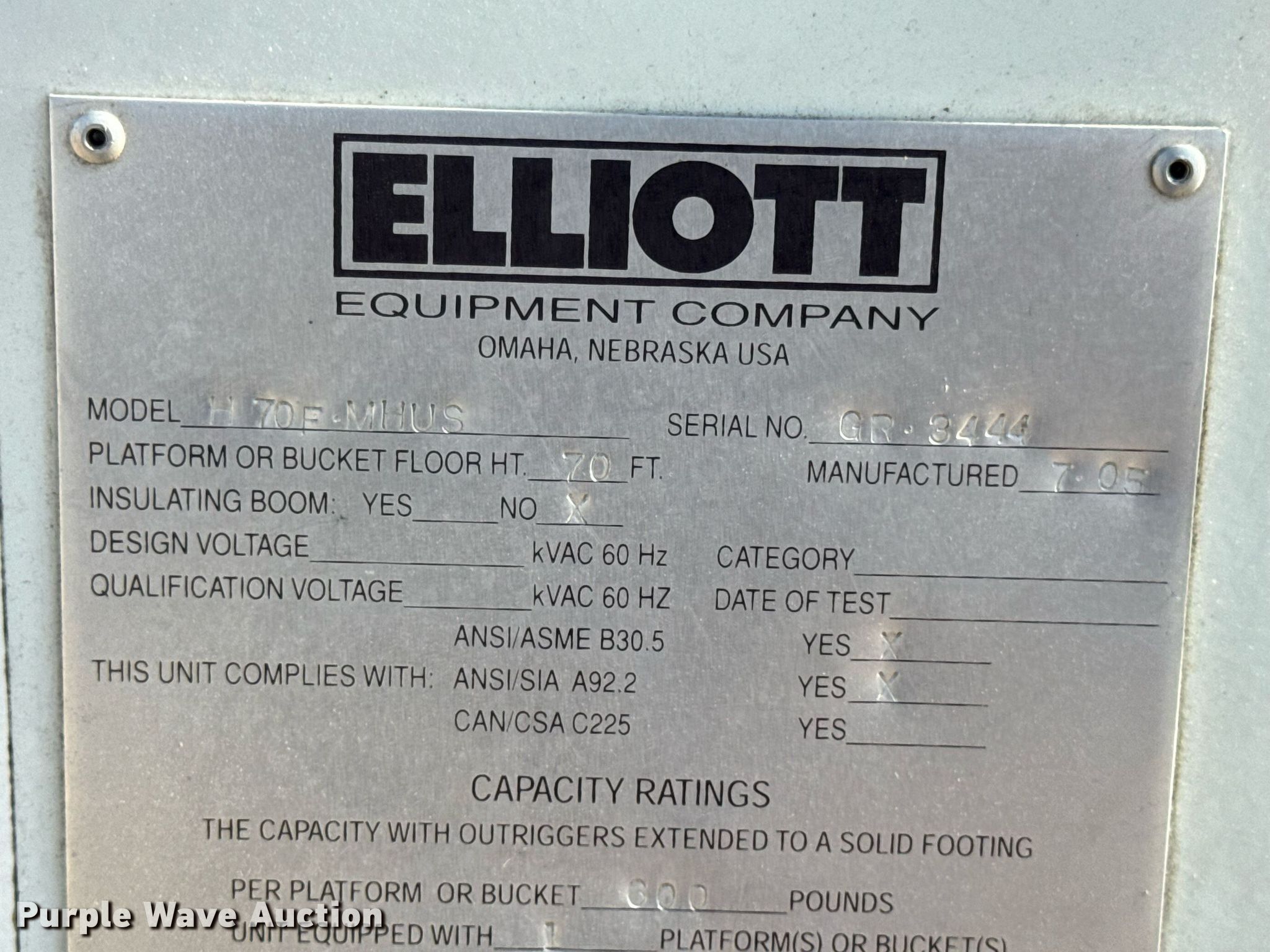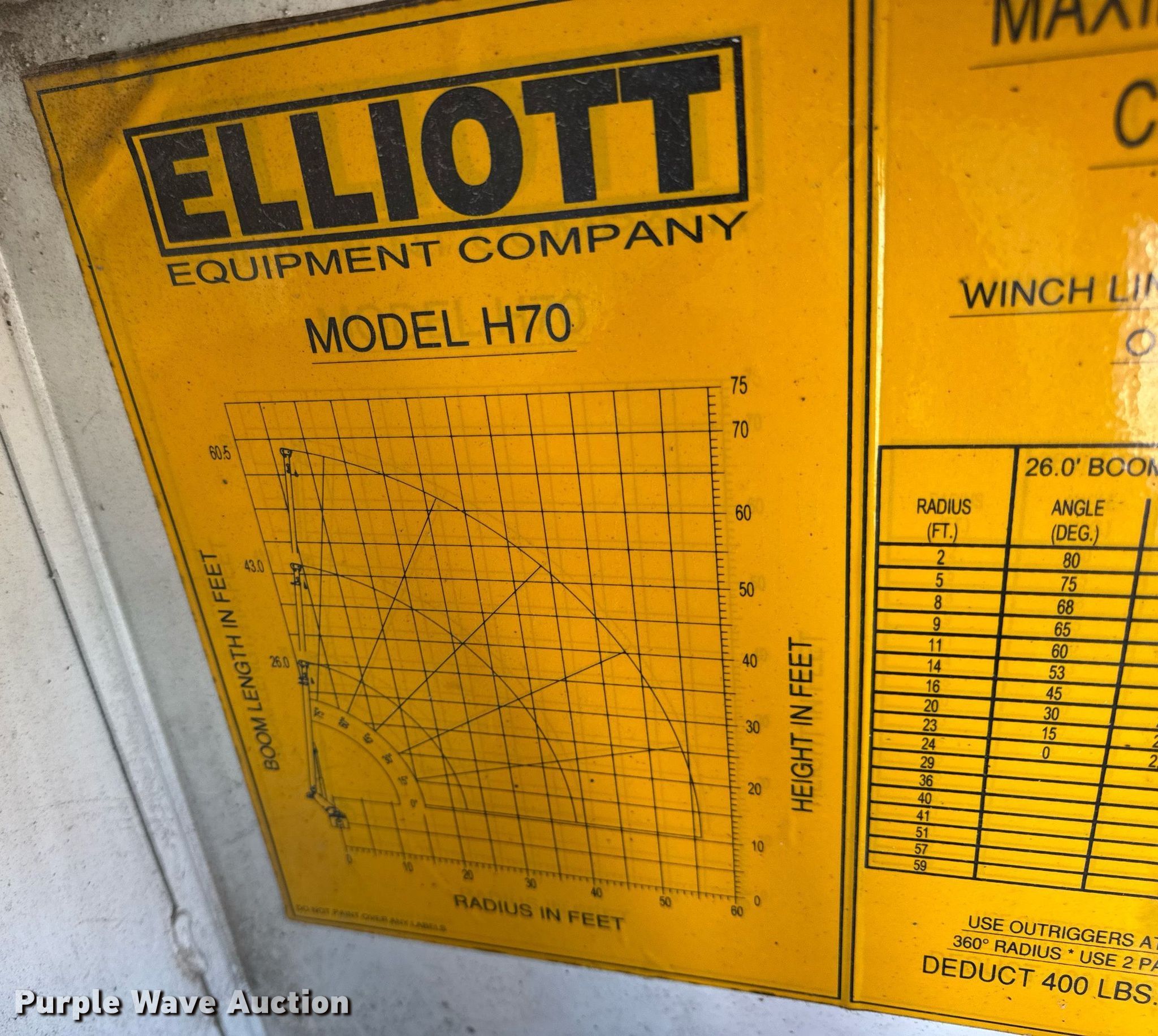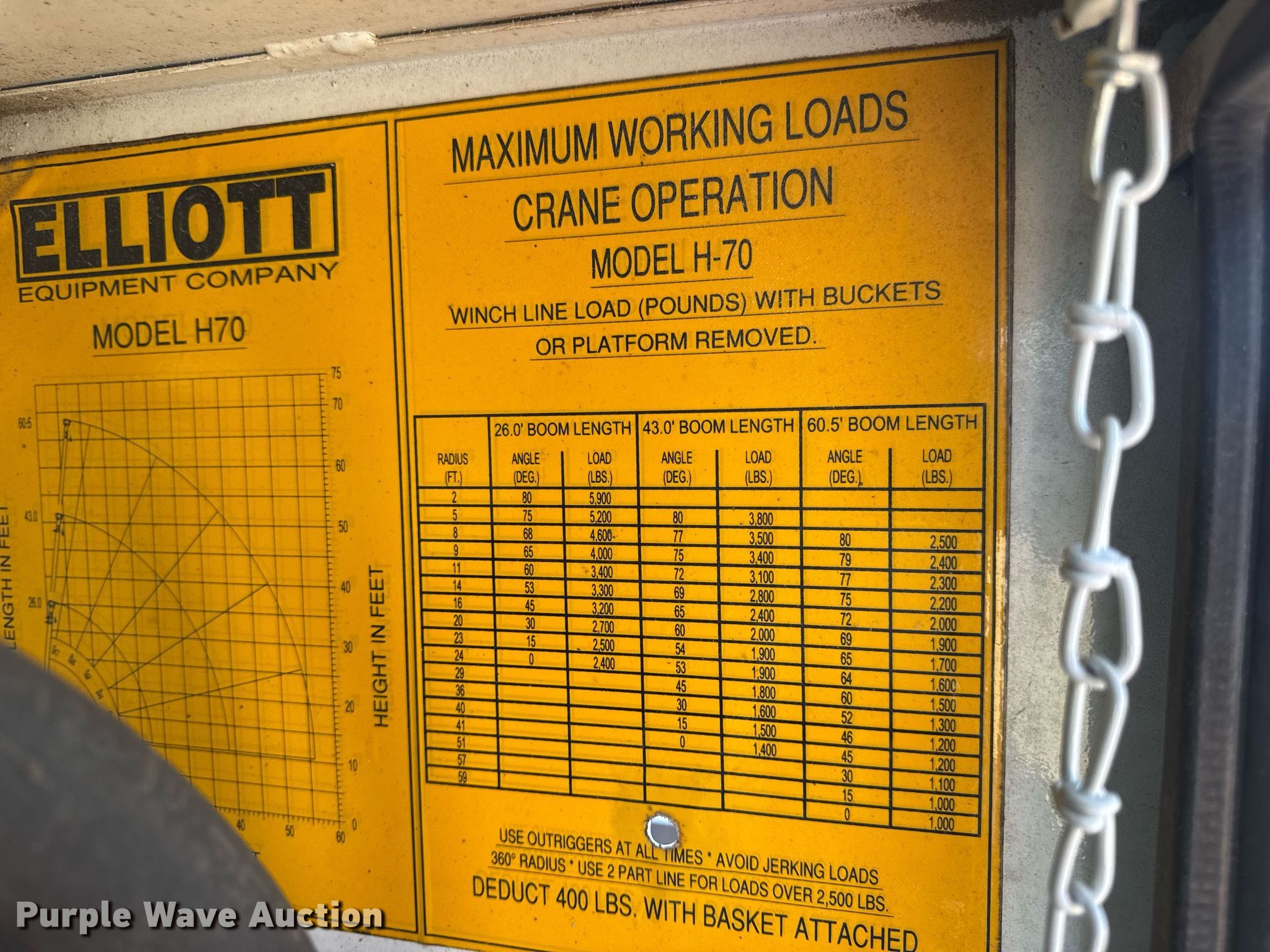 2006 International 4300 forestry bucket truck. Miles: 135,072 on odometer, Hours: 8,548 on meter, VIN: 1HTMMAAR36H183075, Unit #: G9069. Engine International DT466, Displacement: 7.6L, Cylinders: 6, Fuel type: Diesel. Transmission Automatic. Chassis Axles: Single, Suspension: Spring, Brakes: Air, PTO, GVWR: 35,000 lbs. Interior AC, Heat, Heated mirrors, Power windows, Power locks, Cruise control, Auxiliary controls. Features Bed Omaha Service Bodies, Serial: 40552, Length: 24' 3", Width: 98", Boom 2005 Elliot H70F-MHUS, Serial: GR-3444, Maximum lift capacity: 600 lbs, Maximum lift height: 70', Boom type: Telescopic, Man basket, Boom controls Ground, Platform/ basket, Material handler. Tires Front: 315/80R22.5, Rear: 11R22.5. Notes Unknown operating condition of platform/ basket controls. Missouri title. Title distribution may be delayed up to 14 days from verification of funds. Missouri Department of Transportation. New Bloomfield, MO 65063