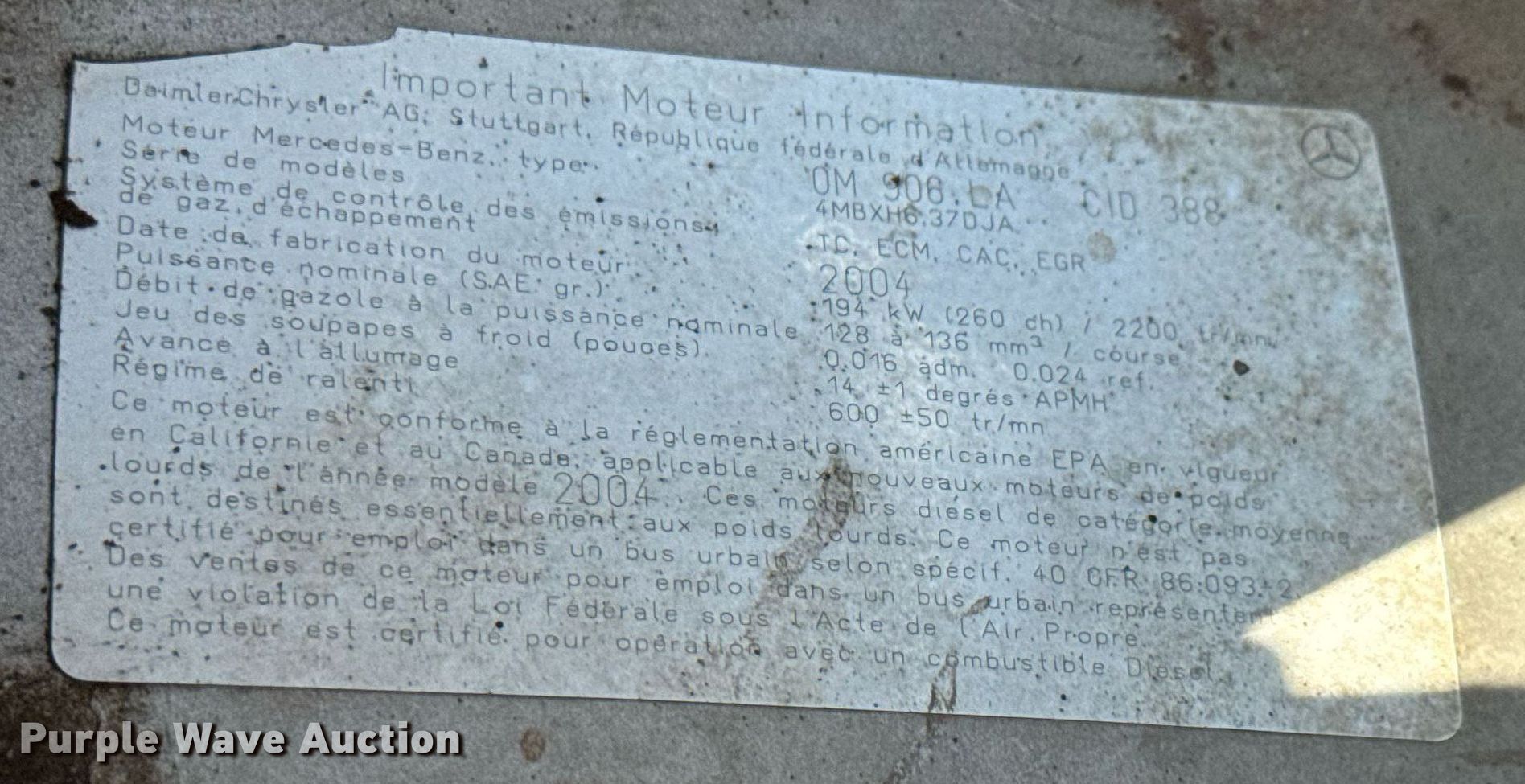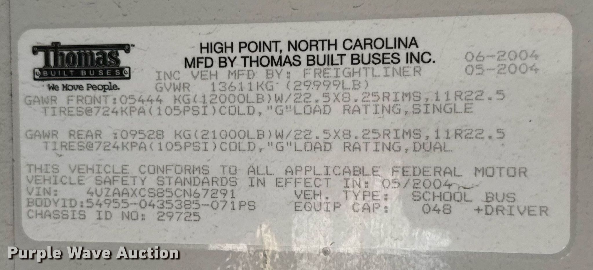 2005 Freightliner FS65 school bus. Miles: 155,545 on odometer, Hours: 6,688 on meter, VIN: 4UZAAXCS85CN67291, Unit #: 10-020. Engine Mercedes Benz OM 906 LA, Displacement: 6.4L, Cylinders: 6, Fuel type: Diesel, Gas, HP: 260. Transmission Automatic. Chassis Axles: Single, Suspension: Air, Brakes: Air, GVWR: 29,999 lbs. Interior Heat, Heated mirrors, Cruise control, Passengers: 48. Tires Size: 11R22.5. Notes Windshield chipped or cracked. Kansas title. Title distribution may be delayed up to 14 days from verification of funds. Fairfield USD 310. Turon, KS 67583