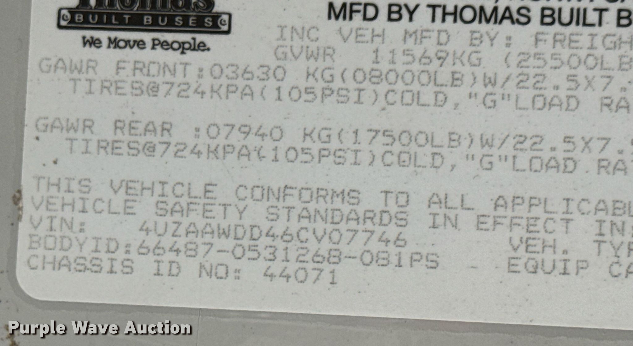 2006 Thomas Built school bus. Miles: 208,552 on odometer, Hours: 8,547 on meter, VIN: 4UZAAWDD46CV07746, Unit #: 15. Engine Caterpillar C7, Serial: KAL90613, Displacement: 7.2L, Cylinders: 6, Fuel type: Diesel. Transmission Automatic. Chassis Axles: Single, Suspension: Spring, Brakes: Hydraulic, GVWR: 25,500 lbs. Interior Heat, Heated mirrors, Cruise control, Passengers: 53. Tires Size: 11R22.5. Kansas title. Title distribution may be delayed up to 14 days from verification of funds. Fairfield USD 310. Turon, KS 67583