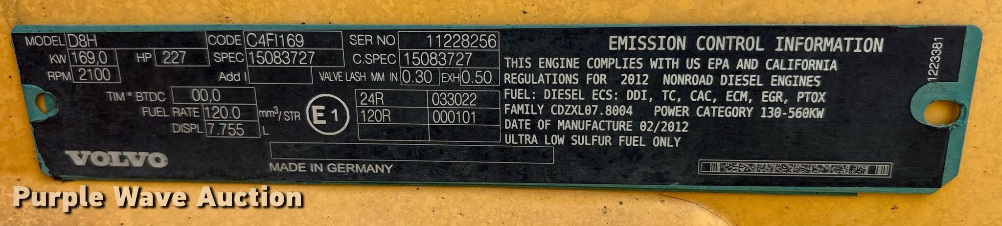 2012 Volvo G930B motor grader. Hours: 5,944 on meter, Serial: VCEG930BC0S575232. Engine Volvo D8H, Serial: 11228256, Displacement: 7.755L, Cylinders: 6, Fuel type: Diesel, HP: 227. Transmission Powershift, 8F - 4R. Chassis Differential lock. Operators station Enclosed cab, AC, Heat, Backup camera, Hydraulic control valves: 10. Features Moldboard: Tip control, Side shift, Moldboard total width: 14', Rear ripper Ripper shanks: 3, Scarifier teeth: 5. Tires Size: 14.00-24. Notes Warning indicator: Water in fuel. Wood County Precinct 1. Quitman, TX 75783