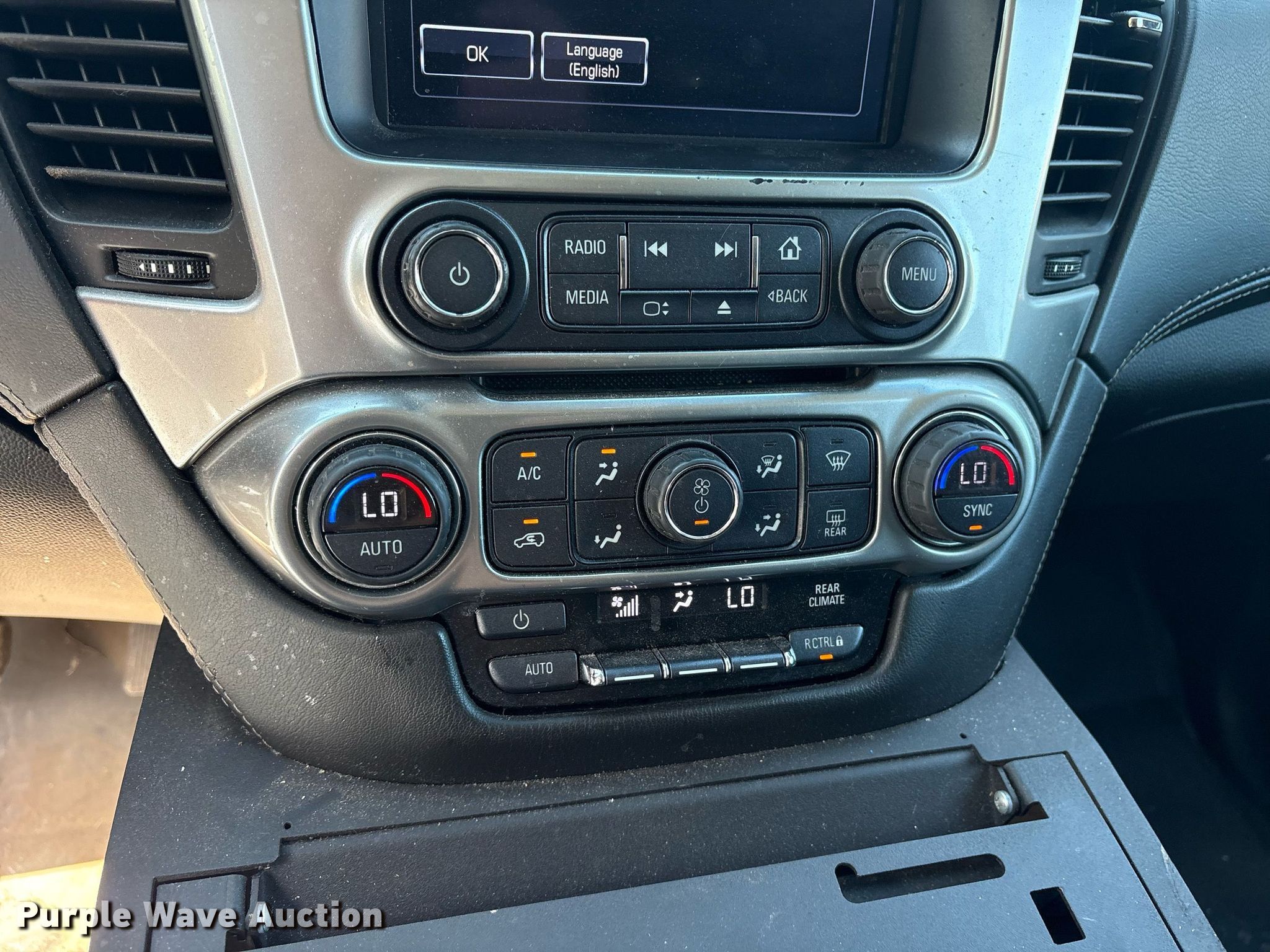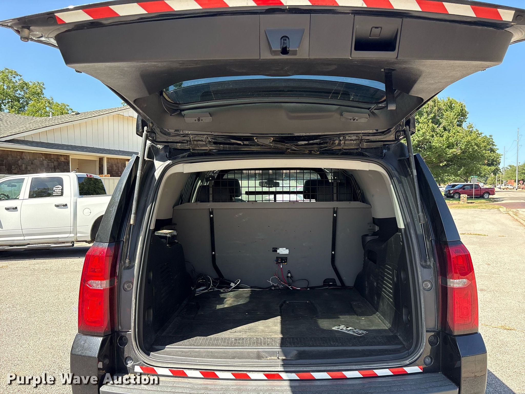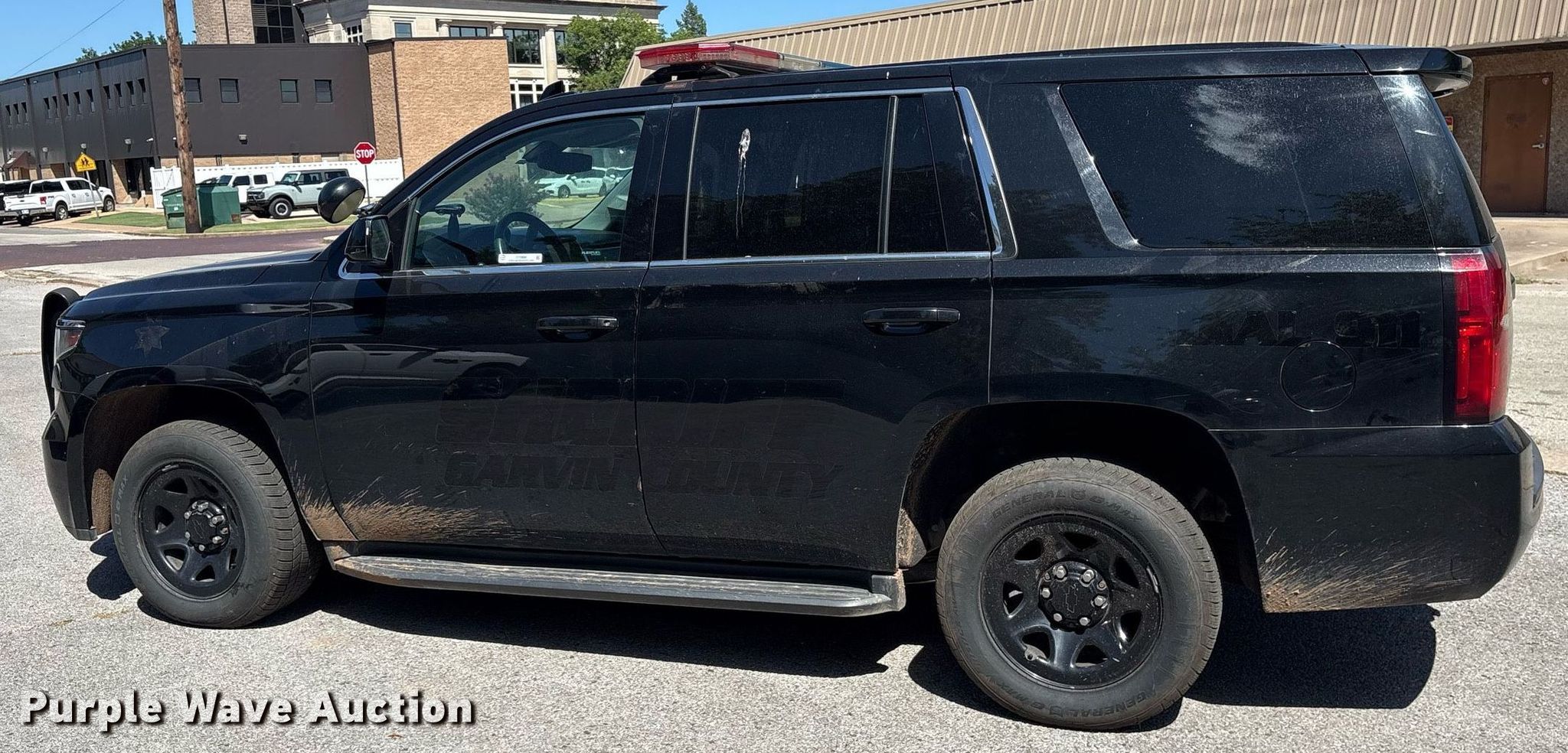 2018 Chevrolet Tahoe Police SUV. Miles: 74,873 on odometer, VIN: 1GNSKDEC9JR367948, Unit #: B331070. Engine Displacement: 5.3L V8 OHV, Cylinders: 8, Fuel type: Gas. Transmission Automatic, Four wheel drive. Interior AC, Heat, Seat: Power driver, Power passenger, Power windows, Power locks, Cruise control, Backup camera. Tires Size: 265/60R17. Notes Dash warning indicator: Check engine, Windshield chipped or cracked. Oklahoma title. Title distribution may be delayed up to 14 days from verification of funds. Garvin County Sheriff's Office. 201 W Grant Ave. Pauls Valley, OK 73075