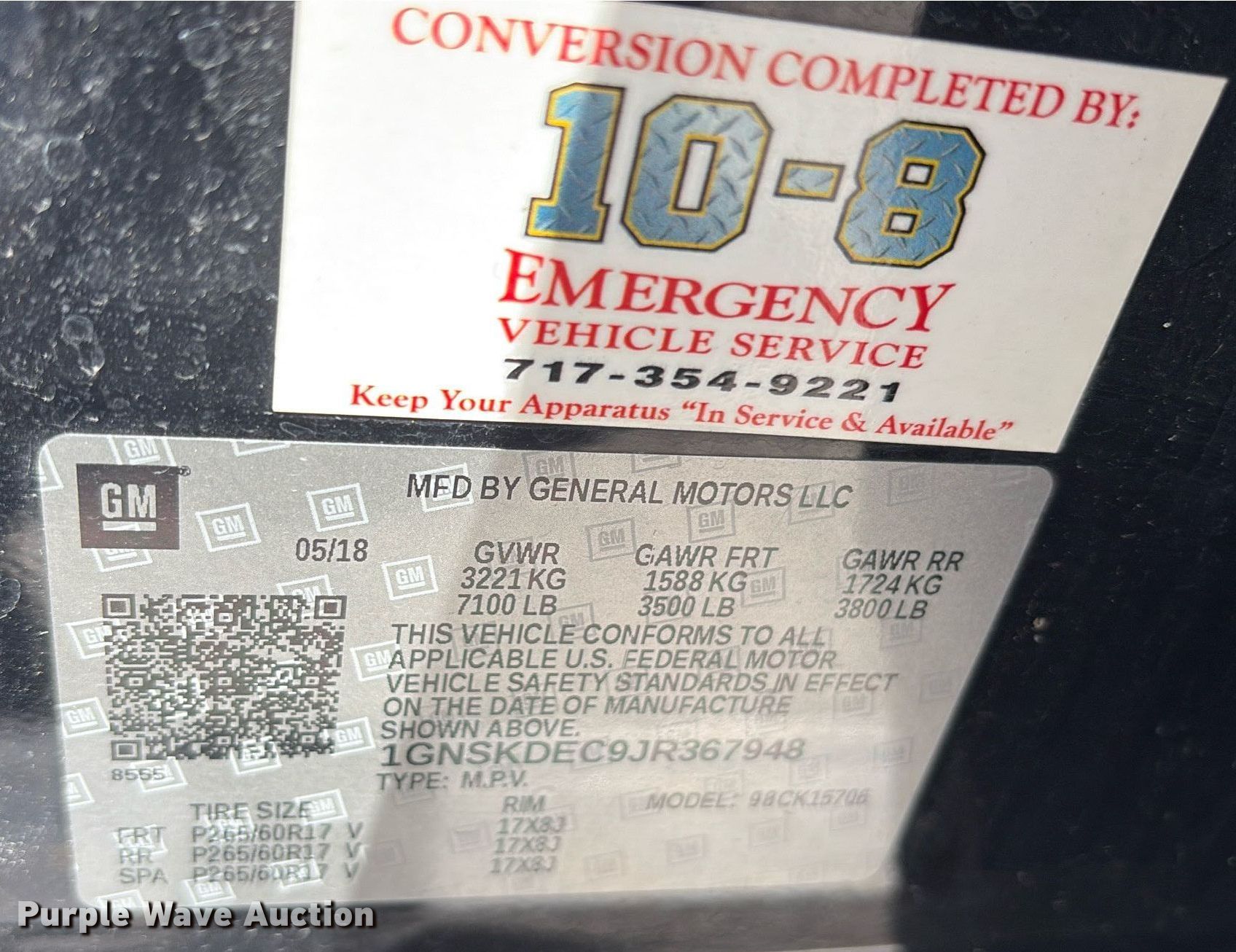 Purple Wave is selling a used Passenger Vehicle in Oklahoma. This item is a 2018 Chevrolet Tahoe Police SUV with the following: Miles: 74,873 on odometer, VIN: 1GNSKDEC9JR367948, Unit #: B331070