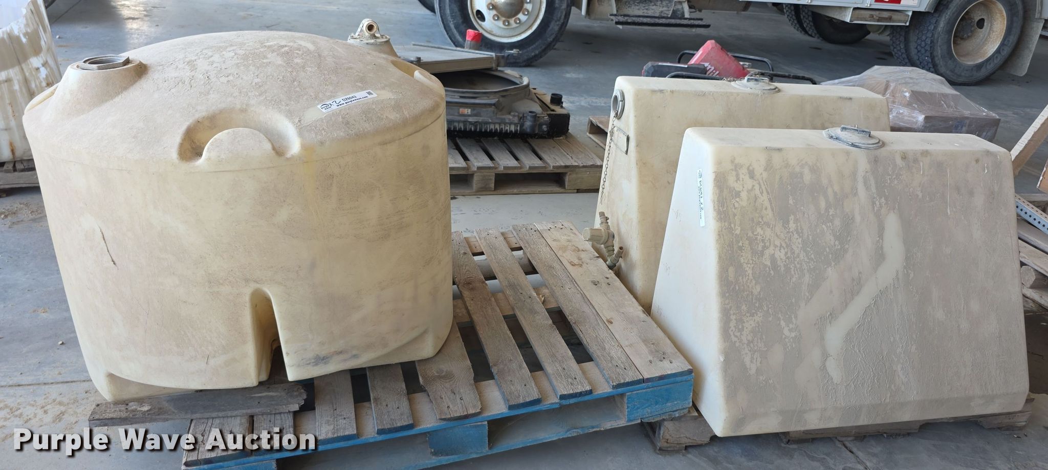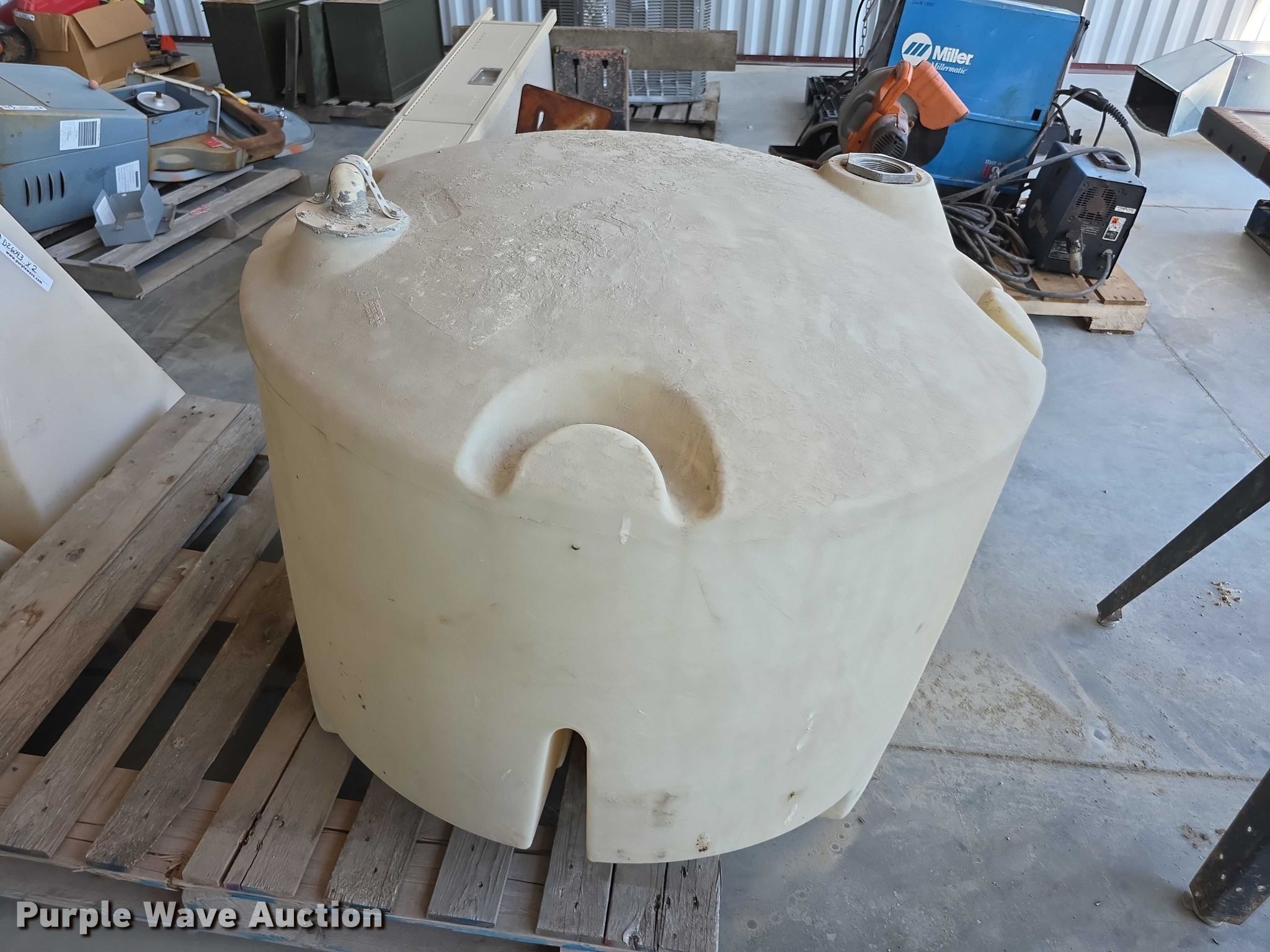 Purple Wave is selling a used Tanks in Kansas. This item is a (3) poly tanks with the following: Capacity, (2) 45 gallons, 100 gallons, Tornado damage