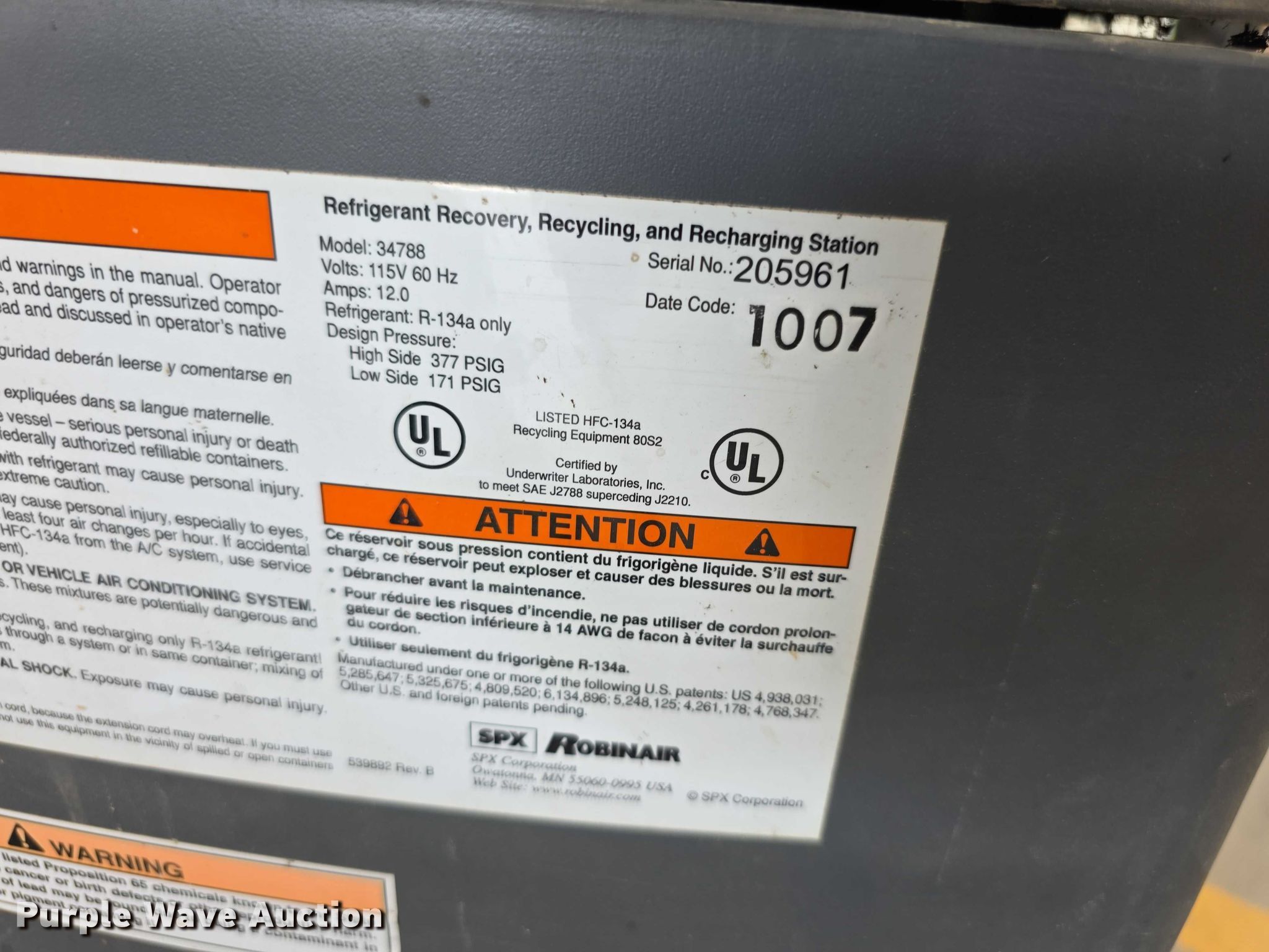 Purple Wave is selling a used Tools in Kansas. This item is a Robinair 34788 reclaimer with the following: Serial: 205961, Volts: 115, Amps: 12, Non-operational unit