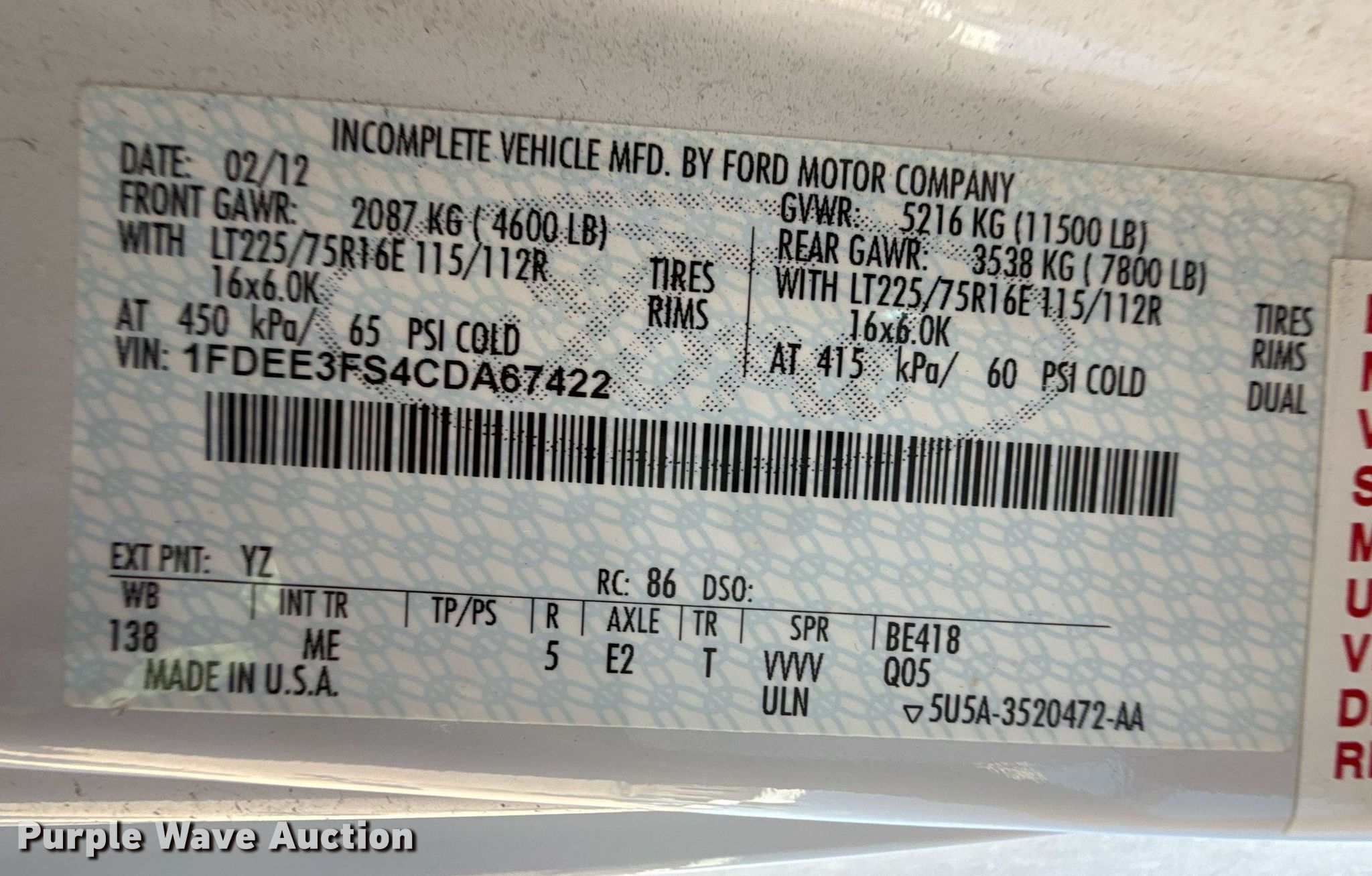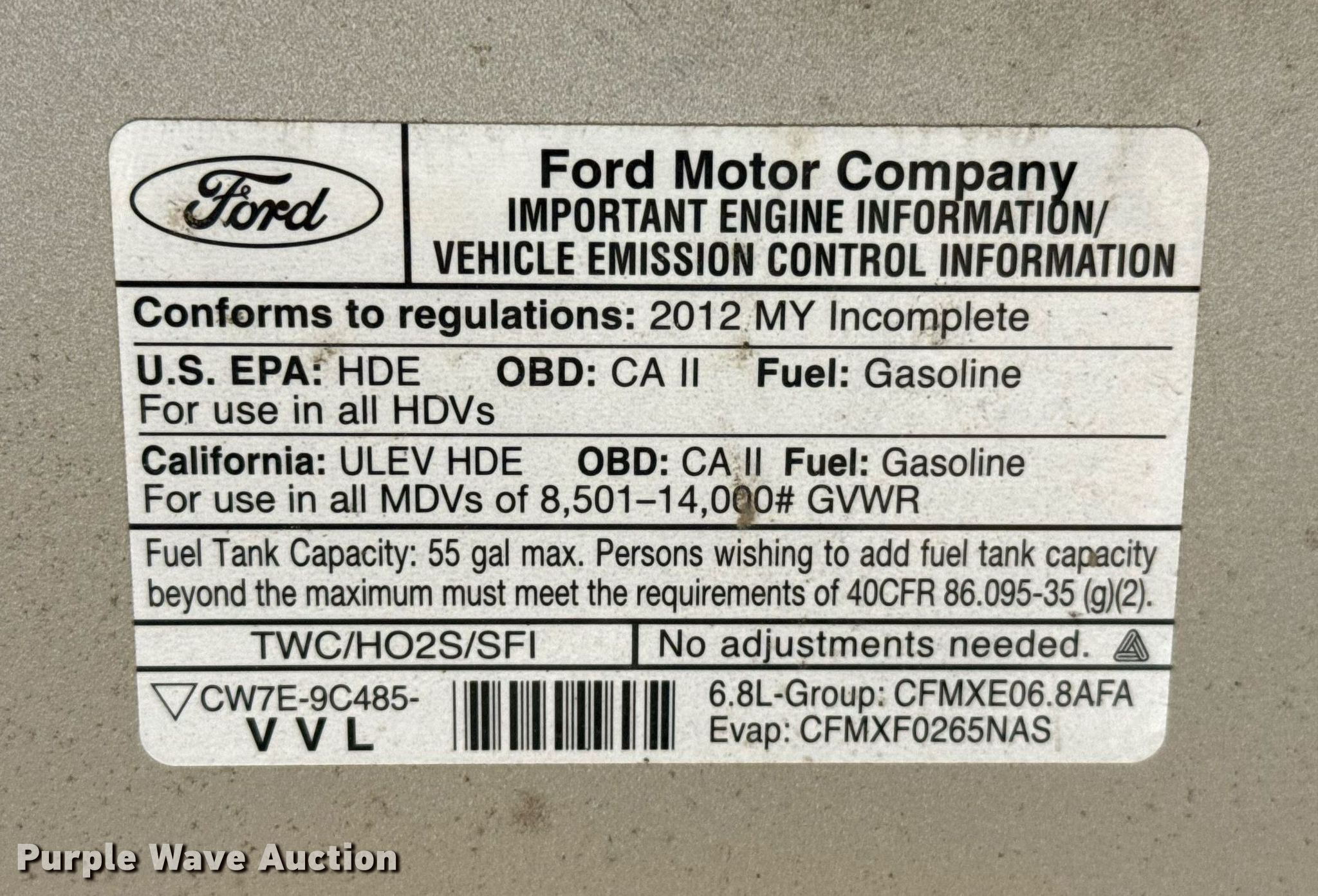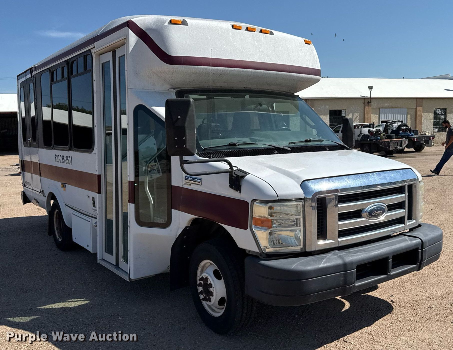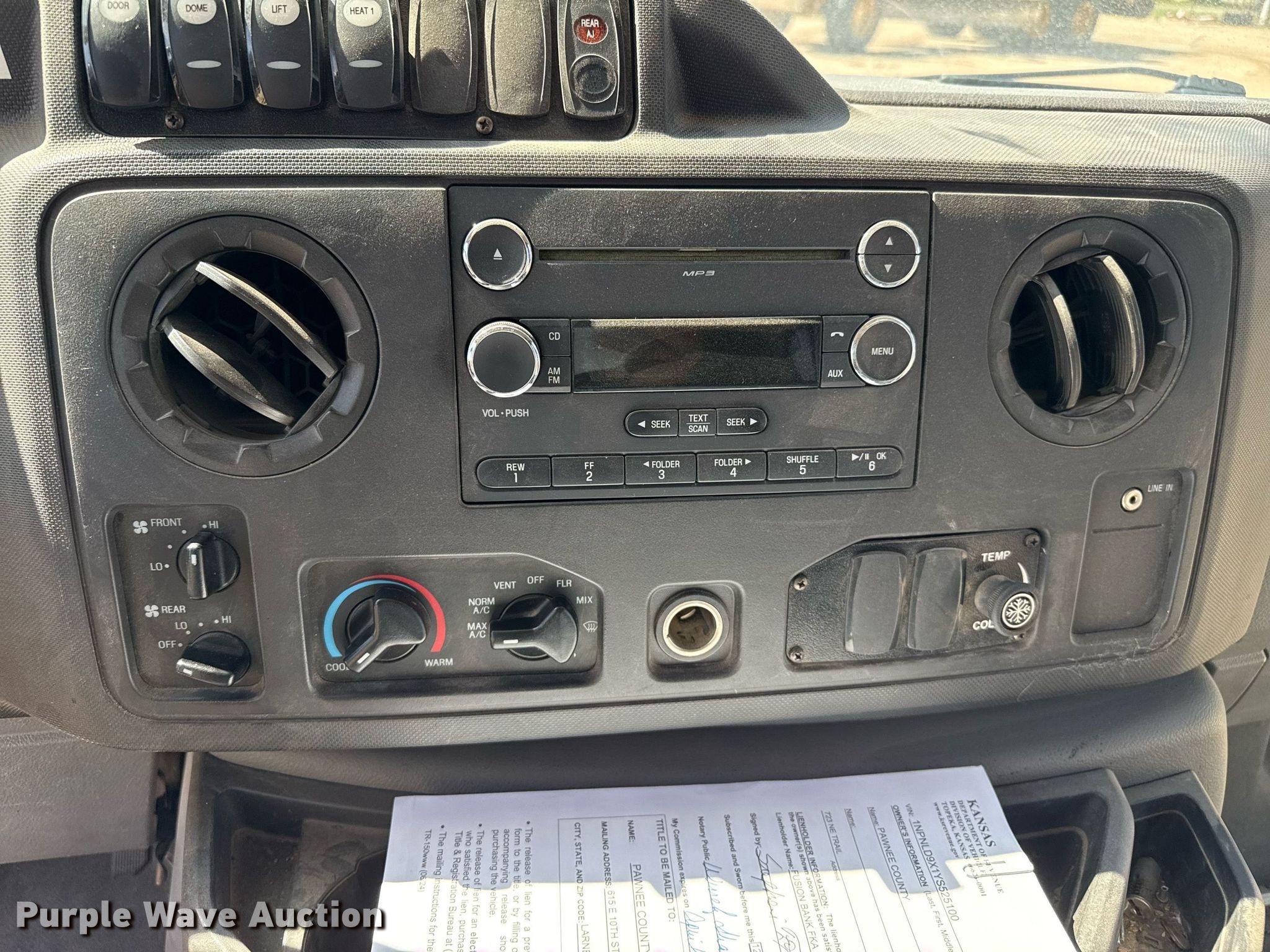 2012 Ford E350 shuttle bus. Miles: 98,317 on odometer, VIN: 1FDEE3FS4CDA67422. Engine Displacement: 6.8L, Cylinders: 10, Fuel type: Gas. Transmission Automatic. Chassis Axles: Single, Suspension: Spring, Brakes: Hydraulic. Interior AC, Heat, Cruise control, Passengers: 10. Tires Size: 225/75R16. Kansas title. Title distribution may be delayed up to 14 days from verification of funds. Pawnee County. Larned, KS 67550