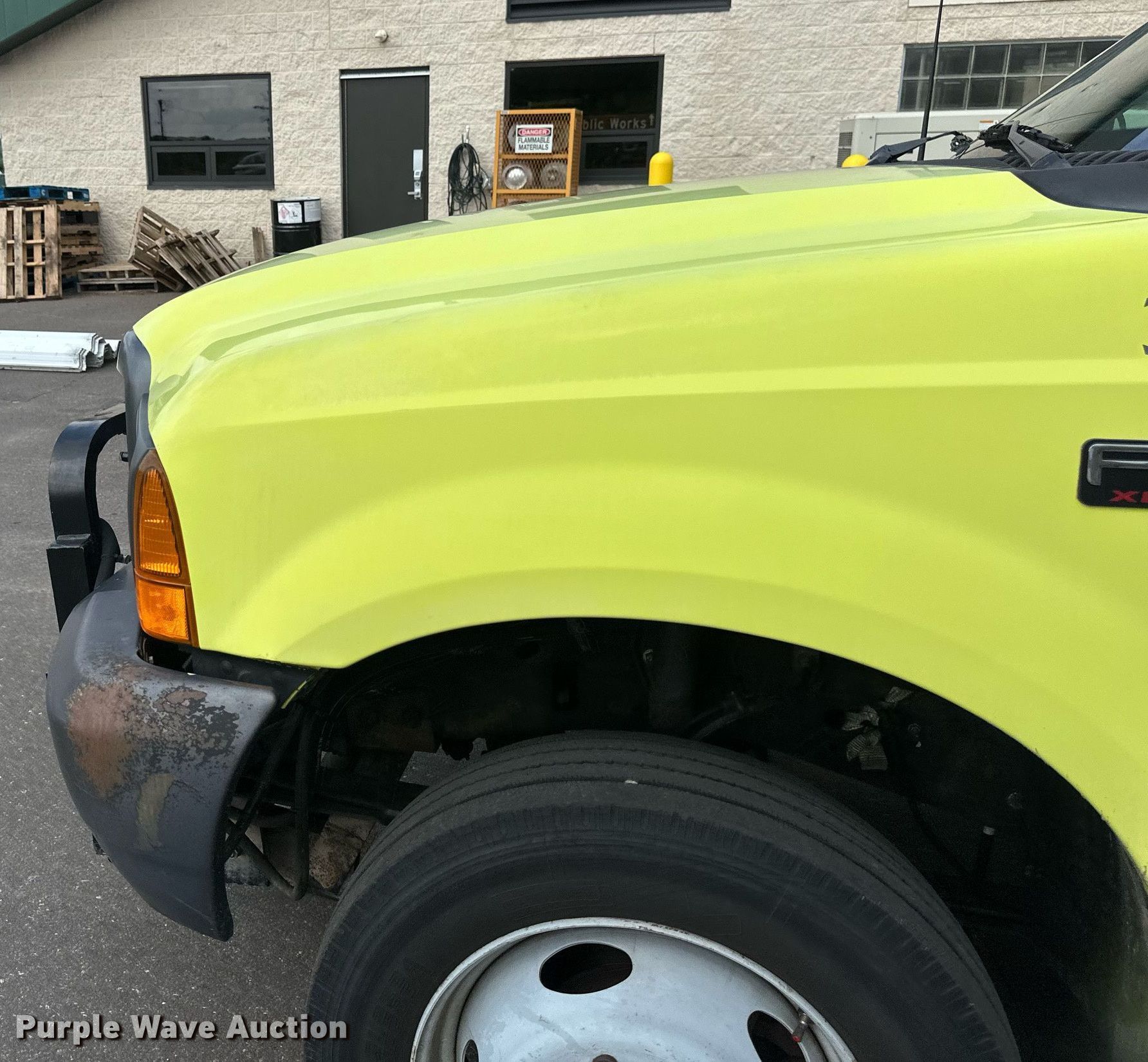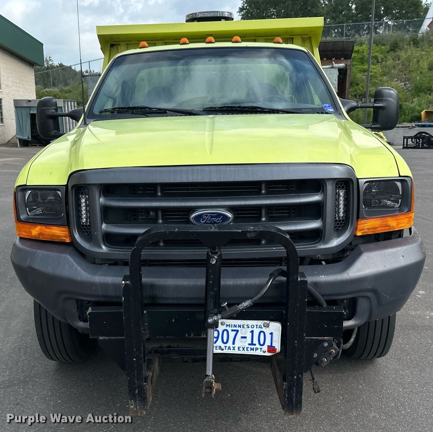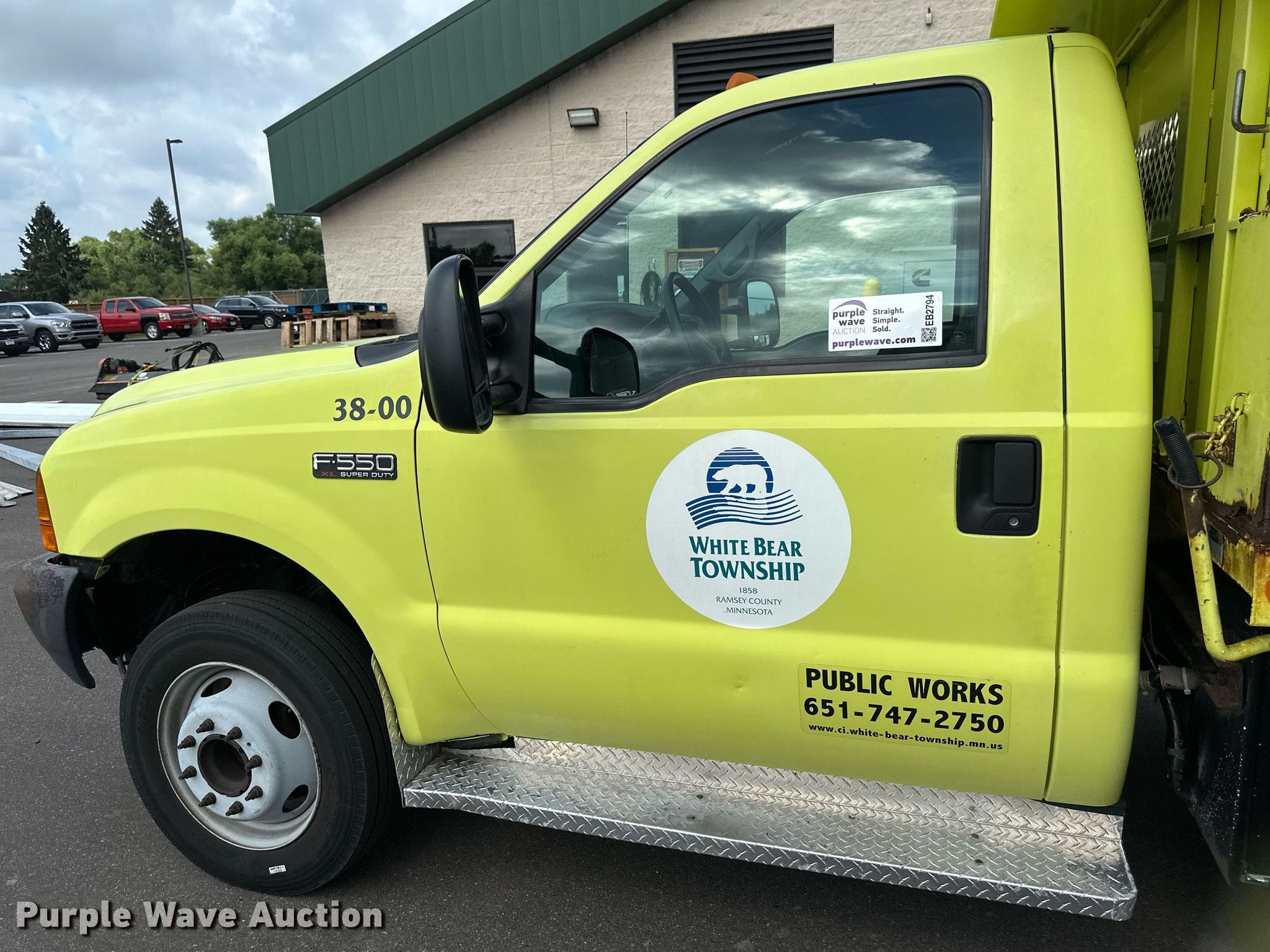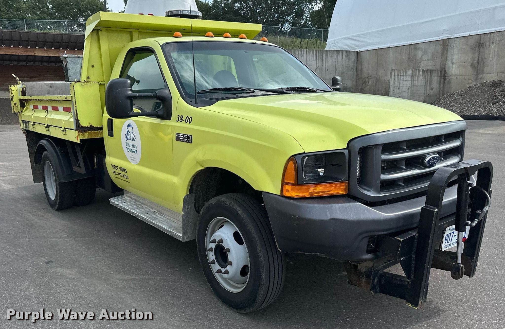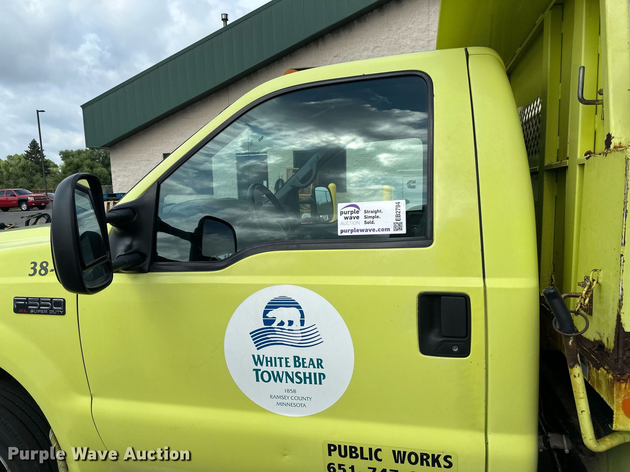 2000 Ford F550 dump truck. Miles: 104,265 on odometer, VIN: 1FDAF56F5YED73637. Engine Displacement: 7.3L, Cylinders: 8, Fuel type: Diesel. Transmission Automatic. Chassis Axles: Single, Suspension: Spring, Brakes: Hydraulic, PTO, GVWR: 17,500 lbs, Wheelbase: 141". Interior AC, Heat, Brake controller. Features Bed Dump bed, Knapheide, Length: 9', Width: 7' 10", Side height: 18", Bed type: Steel, Roll tarp, Ram: Single, End gate: Manual. Tires Size: 225/70R19.5. Minnesota title. Seller is a government entity who will be assigning and distributing the title. Please contact the seller for distribution questions. White Bear Township. White Bear Lake, MN 55110