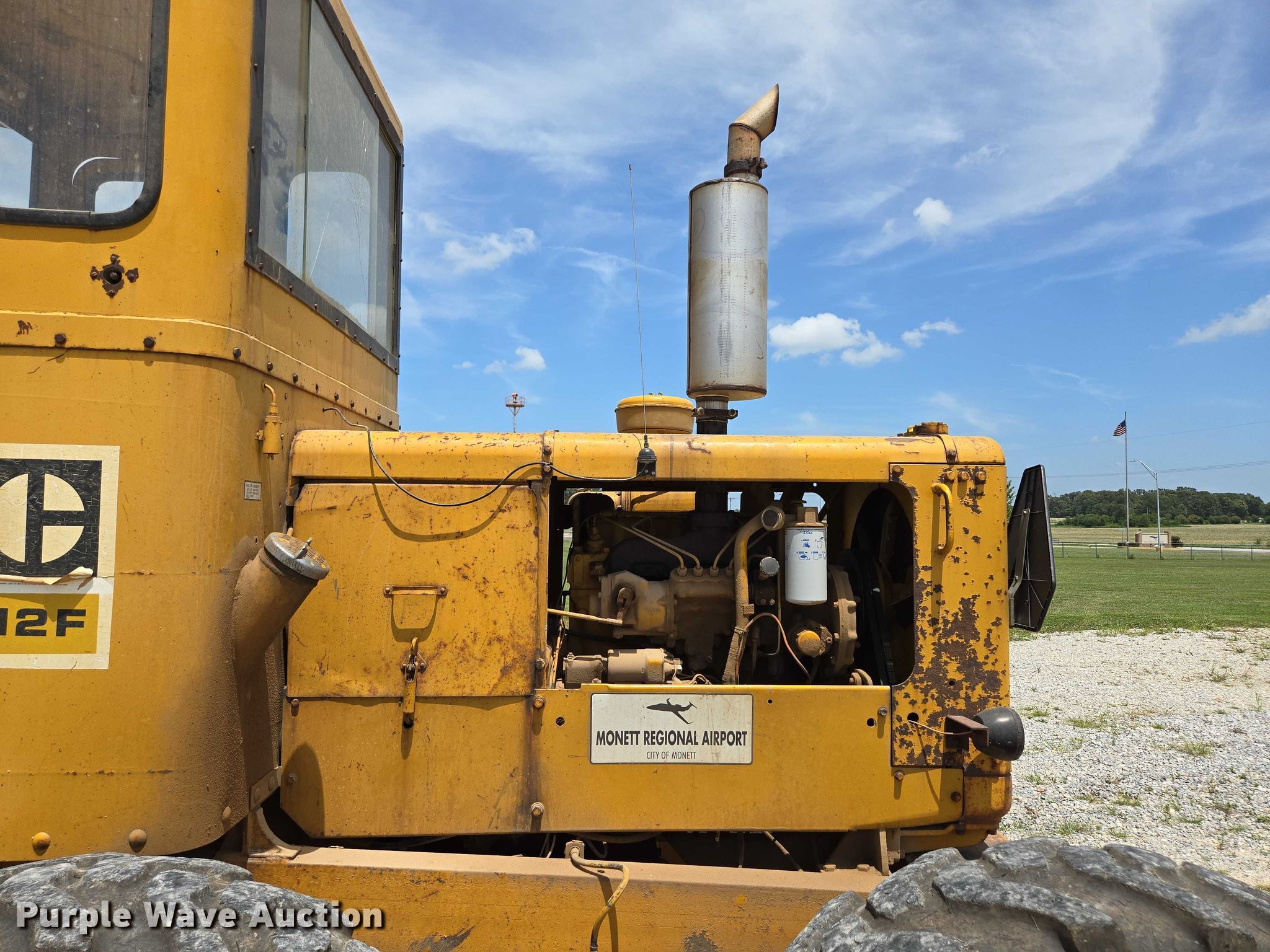 1970 Caterpillar 112F motor grader. Hours: Unknown, Serial: 89J942. Engine Caterpillar F, Serial: 89J942, Cylinders: 4, Fuel type: Diesel. Transmission Direct-drive. Operators station Enclosed cab, Heat, Hydraulic control valves: 6. Features Moldboard: Side shift, Moldboard total width: 12'. Tires Front: 13.00-24 TG, Rear: 13.00-24 G2/L2. Notes Non-operational brakes , Glass cracked. City of Monett, MO. Pierce City, MO 65723