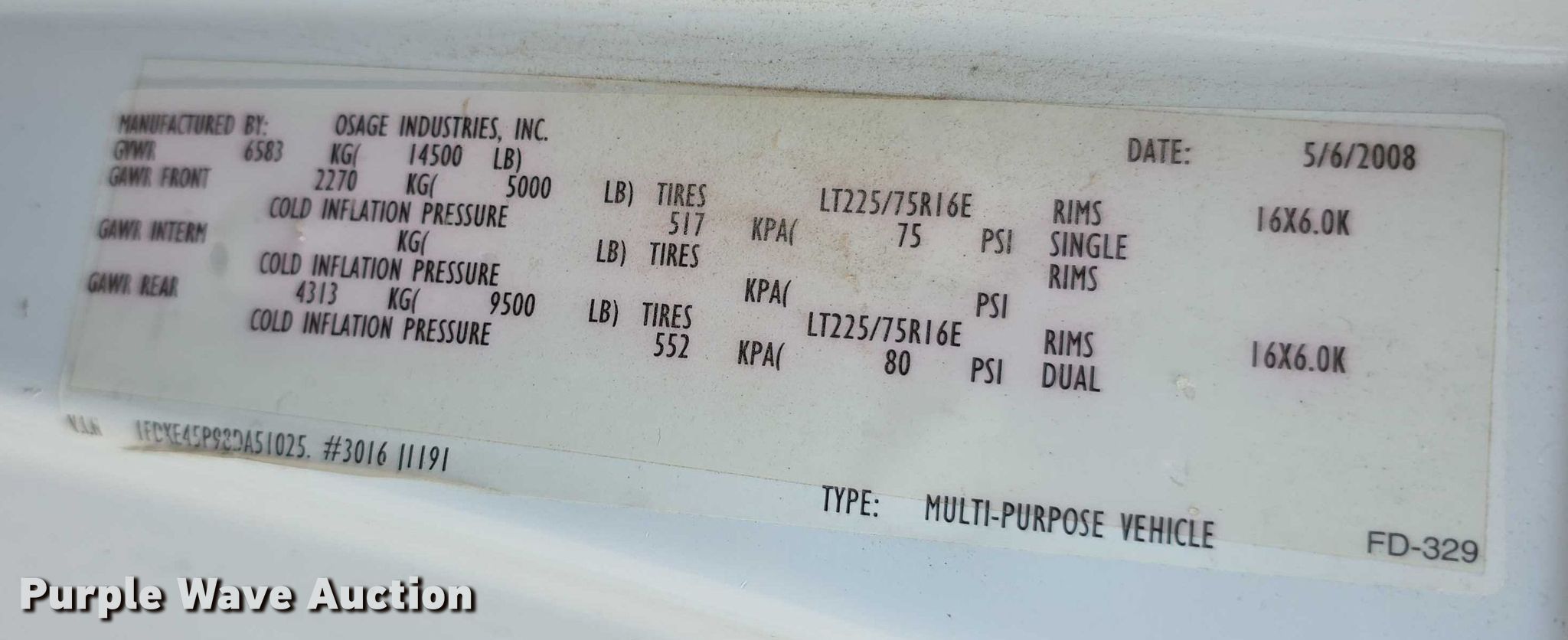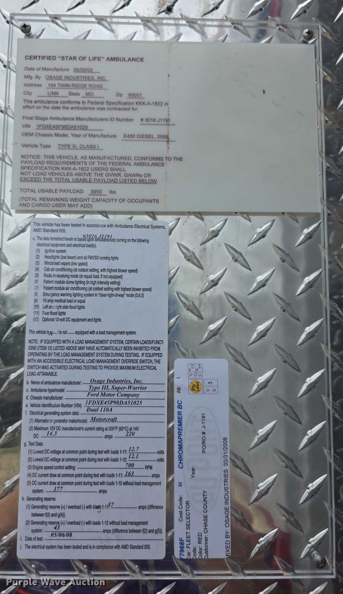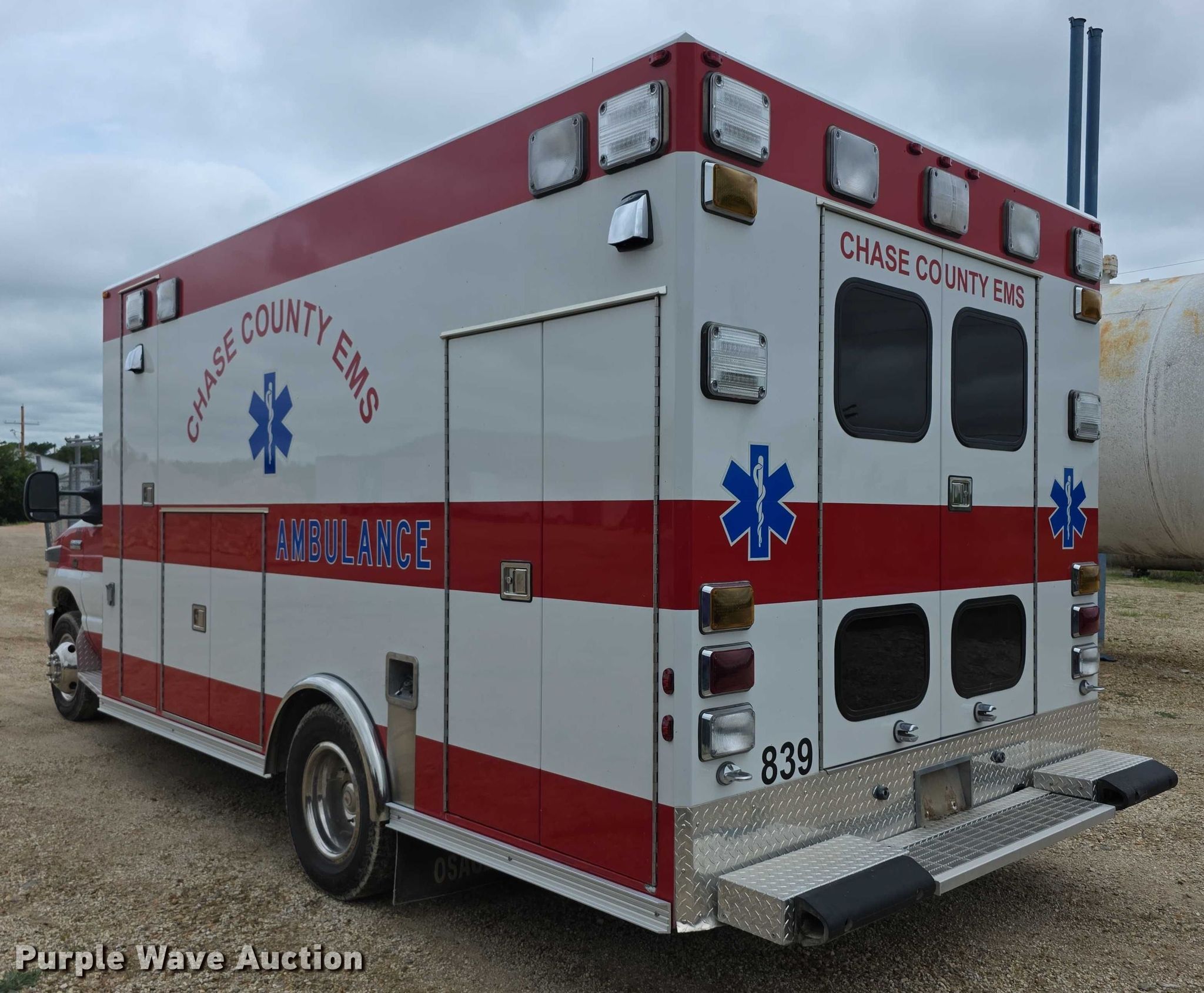 2008 Ford E450 Super Duty ambulance. Miles: 73,059 on odometer, VIN: 1FDXE45P98DA51025, Unit #: EMS839. Engine Displacement: 6.0L, Cylinders: 8, Fuel type: Diesel. Transmission Automatic. Chassis Axles: Single, Suspension: Spring, Brakes: Hydraulic, GVWR: 14,500 lbs, Wheelbase: 158". Interior AC, Heat, Power windows, Power locks, Cruise control, Auxiliary controls. Features Ambulance body Osage Industries, PA/ siren controls, Oxygen hookups. Tires Size: 225/75R16, Brand: Hankook. Notes Decals will be removed prior to auction, Owners manuals, Cardio-pulmonary resuscitation board, (4) spine boards, (2) bags. Kansas title. Title distribution may be delayed up to 14 days from verification of funds. Chase County Road and Bridge Dept.. Cottonwood Falls, KS 66845