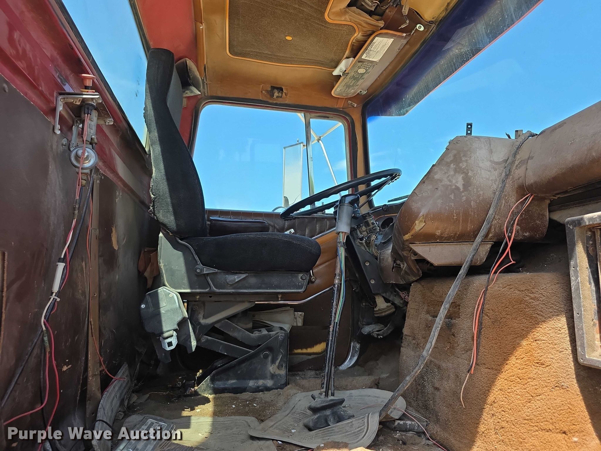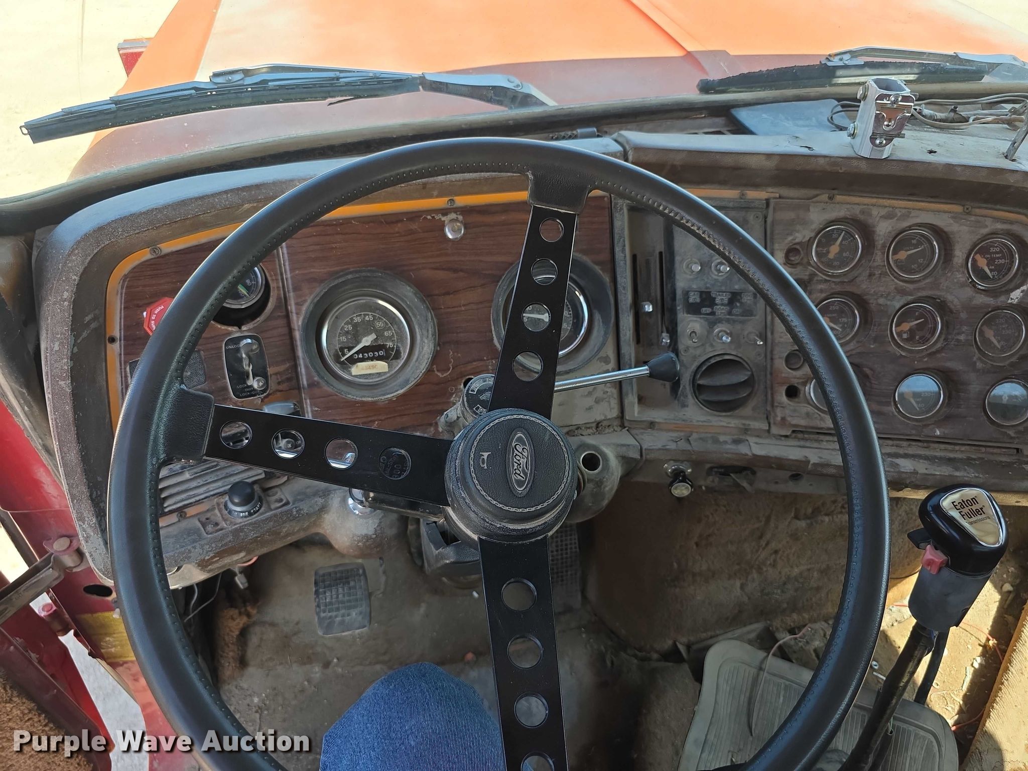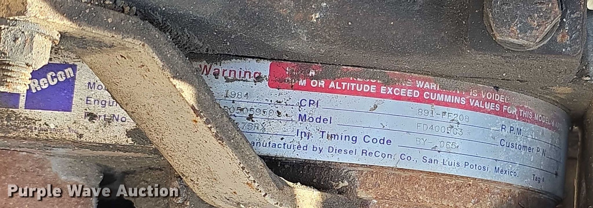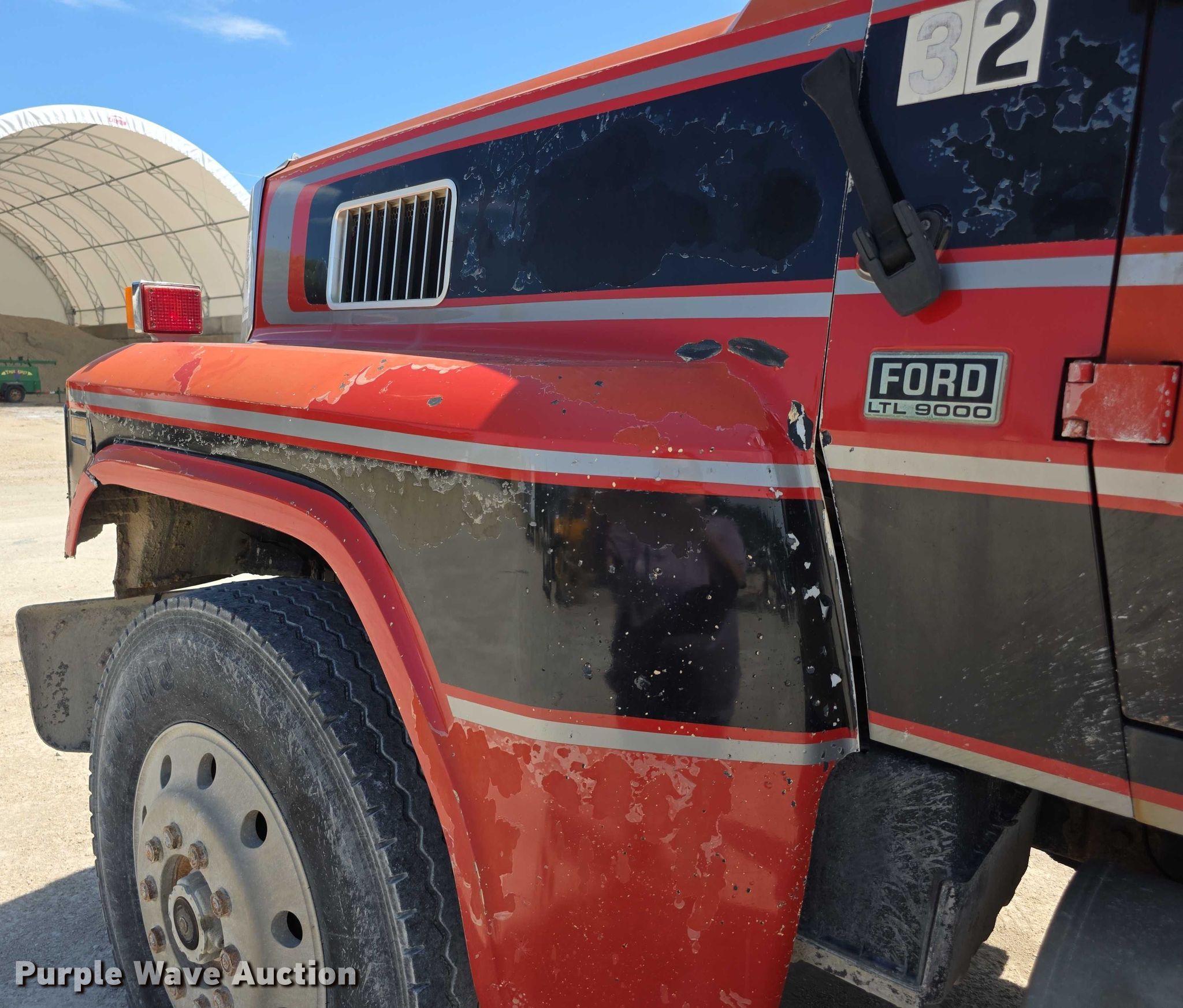 1984 ford LTL9000 semi truck. Miles: 43,030 on odometer, VIN: 1FDYA90WXEVA17449, Unit #: 32. Engine Cummins, Serial: 60505950, Displacement: 14.0L, Cylinders: 6, Fuel type: Diesel. Transmission Eaton Fuller Roadranger, Manual, Speed: 8. Chassis Axles: Tandem, Suspension: Spring, Brakes: Air, Wet kit, Truck chassis: 15', GVWR: 46,000 lbs FAWR: 12,000 lbs, RAWR: 19,000 lbs, Wheelbase: 206". Interior Heat. Features Deck plate: Steel, Fifth wheel type: Air operated, Sliding, Fuel tank: Dual. Tires Size: 11R24.5. Notes Side mirrors damaged, cracked, Fifth wheel air line issues, needs replaced. Kansas title. Title distribution may be delayed up to 14 days from verification of funds. Pottawatomie County Public Works. Westmoreland, KS 66549