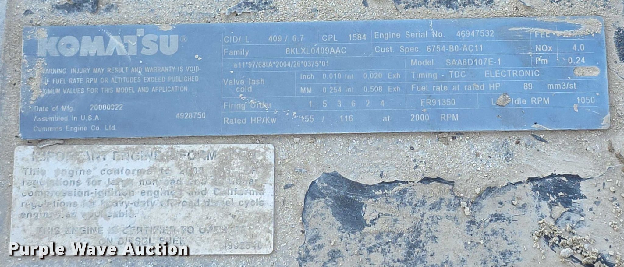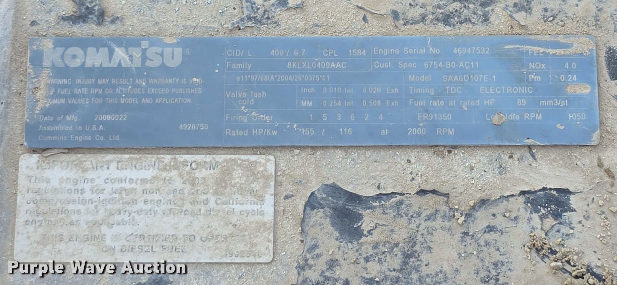 2009 Komatsu PC200LC-8 excavator. Hours: 9,178 on meter, Serial: KMTPC180J54A89331, Unit #: 1568. Engine Komatsu SAA6D107E-1, Serial: 46947532, Displacement: 6.7L, Cylinders: 6, Fuel type: Diesel, HP: 155. Operators station Enclosed cab, AC, Heat. Features Auxiliary hydraulics Two-way, Boom Standard, Stick Stick length: 10' 2", Quick coupler: Hydraulic Geith, Thumb: Hydraulic Geith, Bucket Geith, Width: 50", Teeth: 6. Tracks Width: 32", Steel, Grouser pads: Double. Notes Jump start required during on-site data collection. Pottawatomie County Public Works. Westmoreland, KS 66549