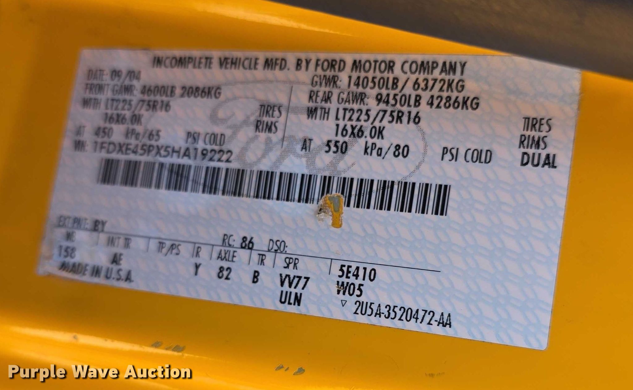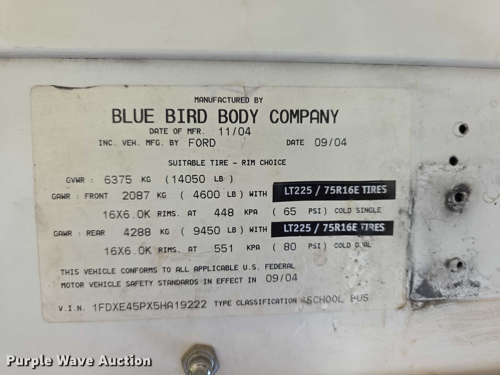 2005 Ford E450 Super Duty school bus. Miles: Unknown, VIN: 1FDXE45PX5HA19222, Unit #: 05-1. Engine Displacement: 6.0L, Cylinders: 8, Fuel type: Diesel. Transmission Automatic. Chassis Axles: Single, Suspension: Spring, Brakes: Hydraulic, GVWR: 14,050 lbs, Wheelbase: 156". Interior Heat, Heated mirrors, Cruise control, Passengers: 29. Tires Size: 225/75R16, Brand: Hercules. Notes Dead battery, Decals will be painted over prior to auction, Unit must be towed or hauled , Non-operational unit. Kansas title. Mileage has not been verified. Odometer discrepancy will be marked on the title. Title distribution may be delayed up to 14 days from verification of funds. Brookville, KS 67425