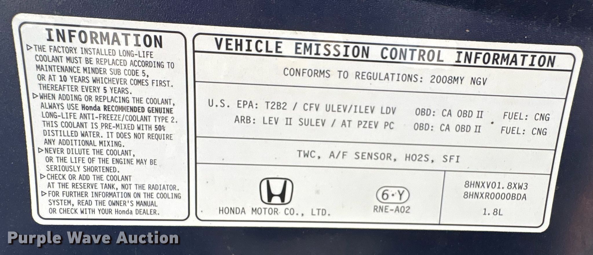2008 Honda Civic. Miles: 48,081 on odometer, VIN: 1HGFA46548L001133, Unit #: 202. Engine Displacement: 1.8L L4 SOHC, Cylinders: 4, Fuel type: CNG. Transmission Automatic. Interior AC, Heat, Power windows, Power locks, Cruise control. Tires Size: 195/65R15. Notes CNG tank removed , Battery missing, Unknown operating condition. Oklahoma title. Seller is a government entity who will be assigning and distributing the title. Please contact the seller for distribution questions. Title distribution may be delayed up to 30 days from verification of funds. City of Tulsa. 108 N Trenton Ave. Tulsa, OK 74120