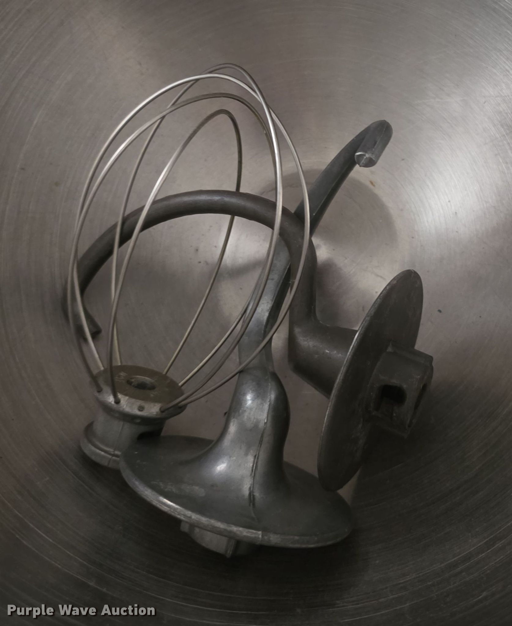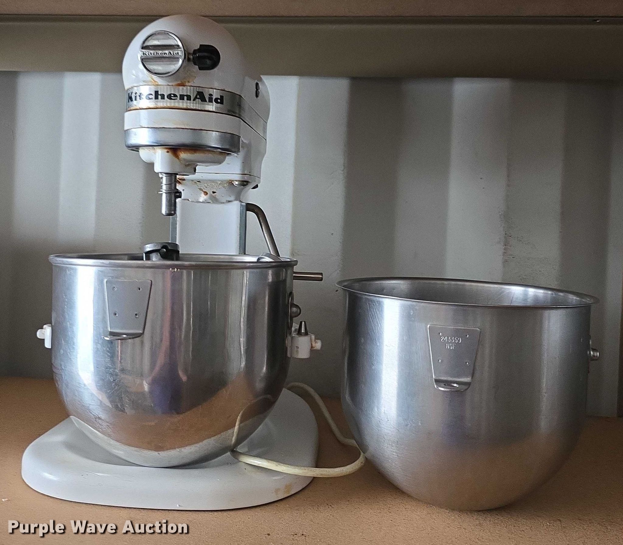 Purple Wave is selling a used Restaurant Equip. in Kansas. This item is a Kitchen Aid mixer with the following: Whip, (2) bowls, (2) bread hooks, (3) pans, Non-operational unit