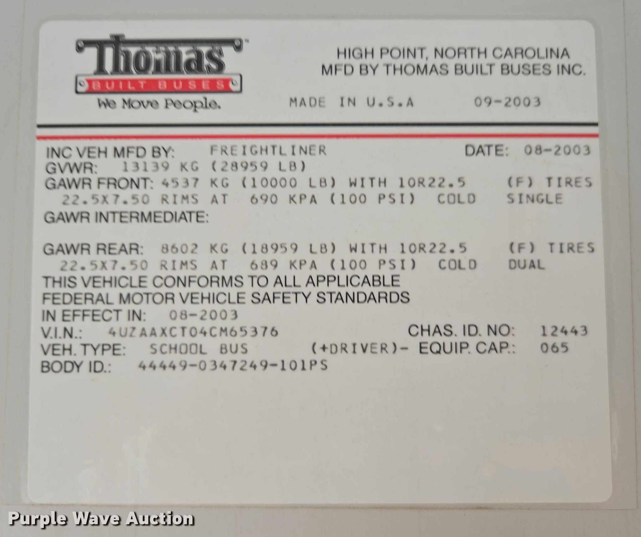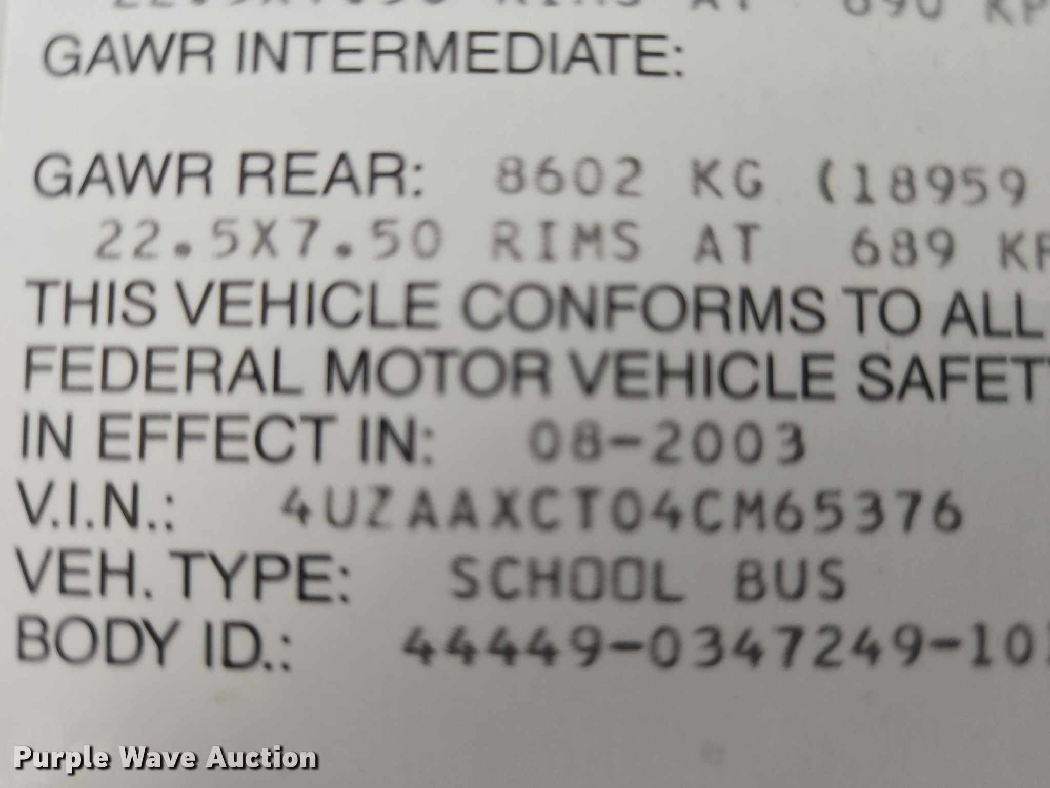 Purple Wave is selling a used Bus in Iowa. This item is a 2004 Freightliner 101PS school bus with the following: Miles: 182,152 on odometer, Hours: 8,898 on meter, VIN: 4UZAAXCT04CM65376