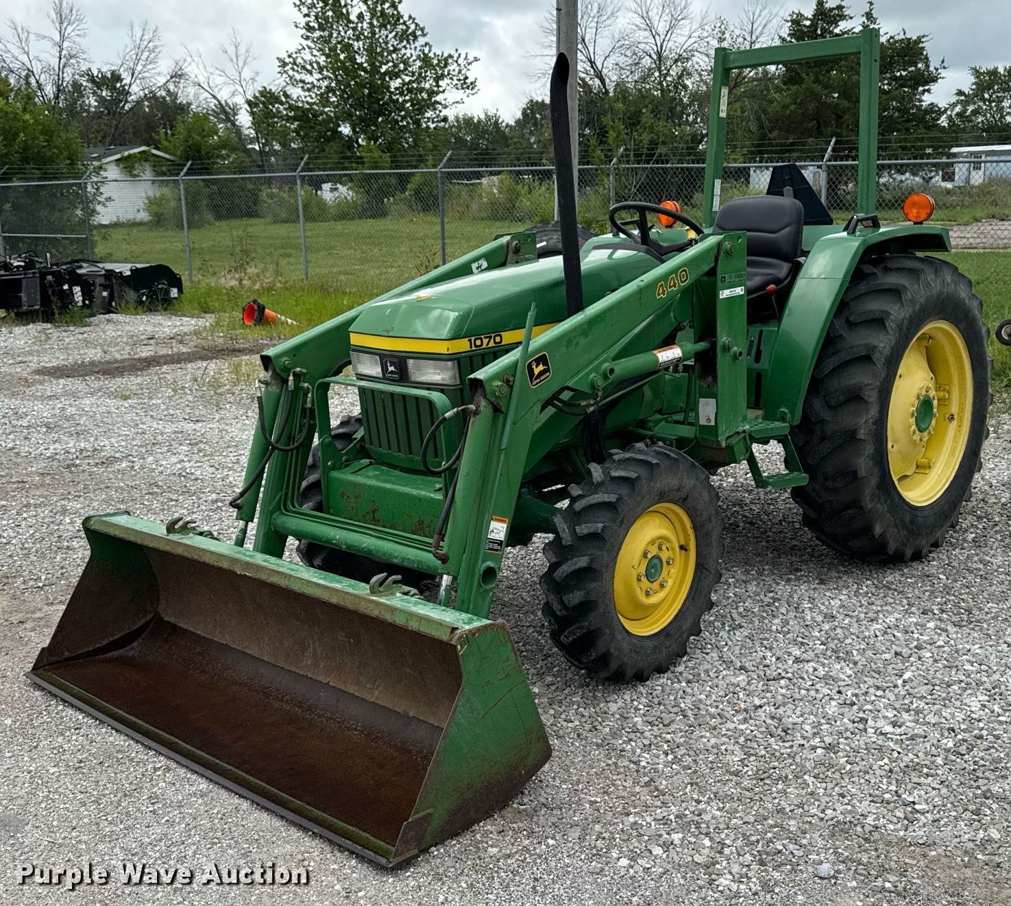 1997 John Deere 1070 MFWD tractor. Hours: 1,208 on meter, Serial: M01070A161243. Engine John Deere 4TN84-RJK, Serial: CH4048D016227, Cylinders: 4, Fuel type: Diesel. Transmission Manual, 6F - 2R, Differential lock. Features PTO: 540, Top link, Loader John Deere 440, Quick attach, Controls: Joystick, Bucket Width: 75".. Tires Front: 8-16, Rear: 13.6-28. Item unavailable for removal until August 29th, 2025. City of Kirksville. Kirksville, MO 63501