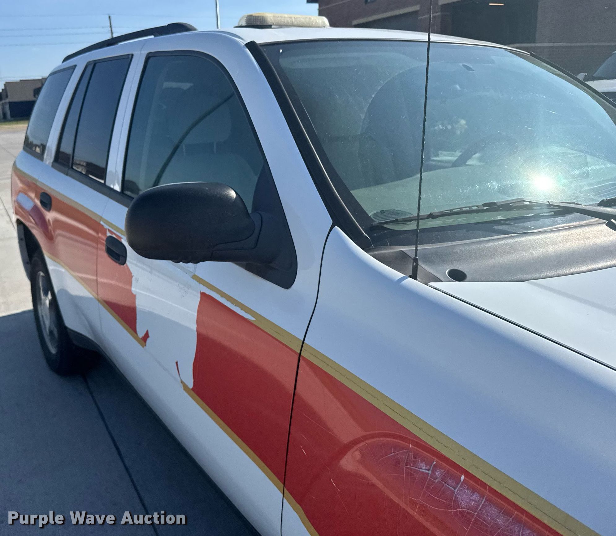 2008 Chevrolet Trailblazer SUV. Miles: 96,983 on odometer, Miles or hours may vary, unit still in use, VIN: 1GNDT13SX82213833. Engine Displacement: 4.2L L6 DOHC, Cylinders: 6, Fuel type: Gas. Transmission Automatic, Four wheel drive. Interior AC, Heat, Power windows, Power locks, Cruise control. Tires Size: 245/65R17. Notes Lights and sirens disconnected, Hail damage. Kansas title. Title distribution may be delayed up to 14 days from verification of funds. City of Hays Fire Dept, Training Facility. Hays, KS 67601