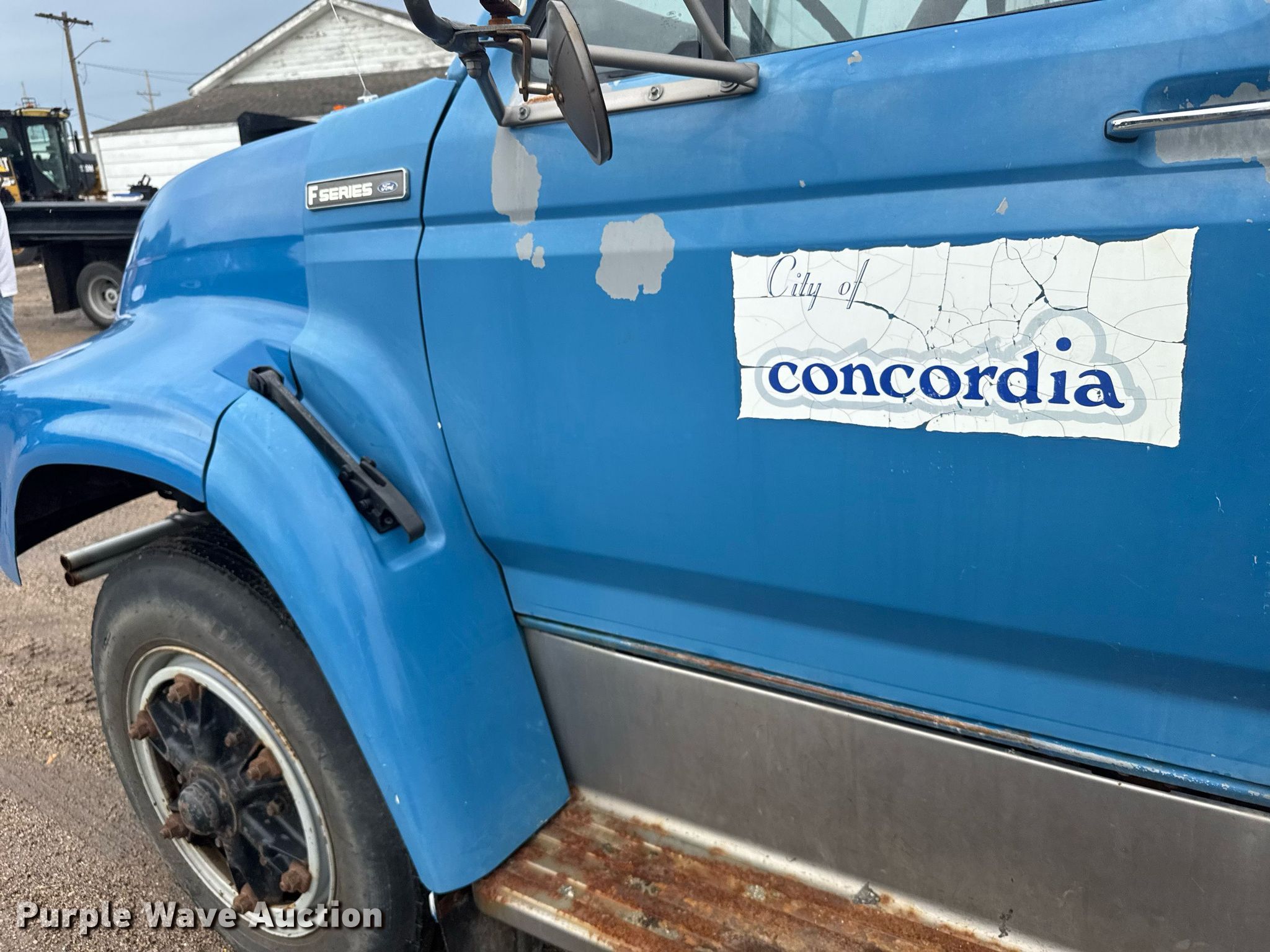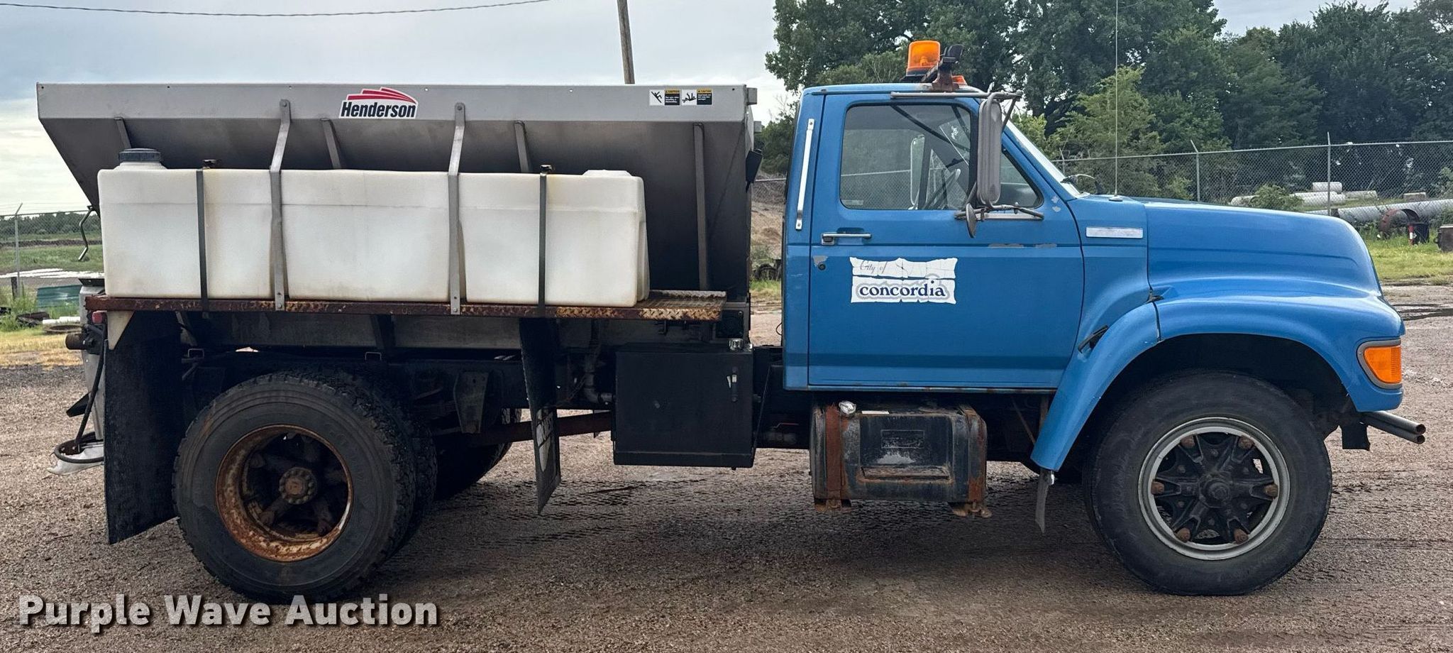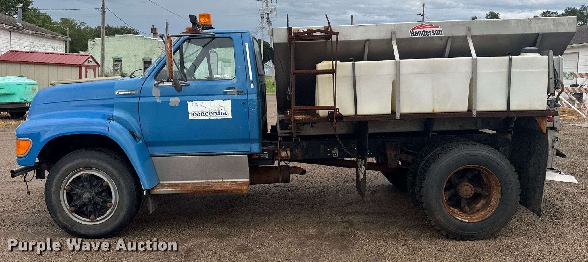 1995 Ford F700 flatbed truck. Miles: 43,065 on odometer, VIN: 1FDPF70J1SVA32388. Engine Ford, Displacement: 7.0L, Cylinders: 8, Fuel type: Gas. Transmission Automatic. Chassis Axles: Single, Suspension: Spring, Brakes: Hydraulic, PTO. Interior AC, Heat, Auxiliary controls. Features Bed Henderson WSHX70X50X304SS, Serial: WSH-24584, Length: 11' 2", Width: 84", Spreader Henderson.. Tires Front: 9R22.5, Rear: 10R22.5. Notes Brake issues. Kansas title. Title distribution may be delayed up to 14 days from verification of funds. City of Concordia, KS. Concordia, KS 66901