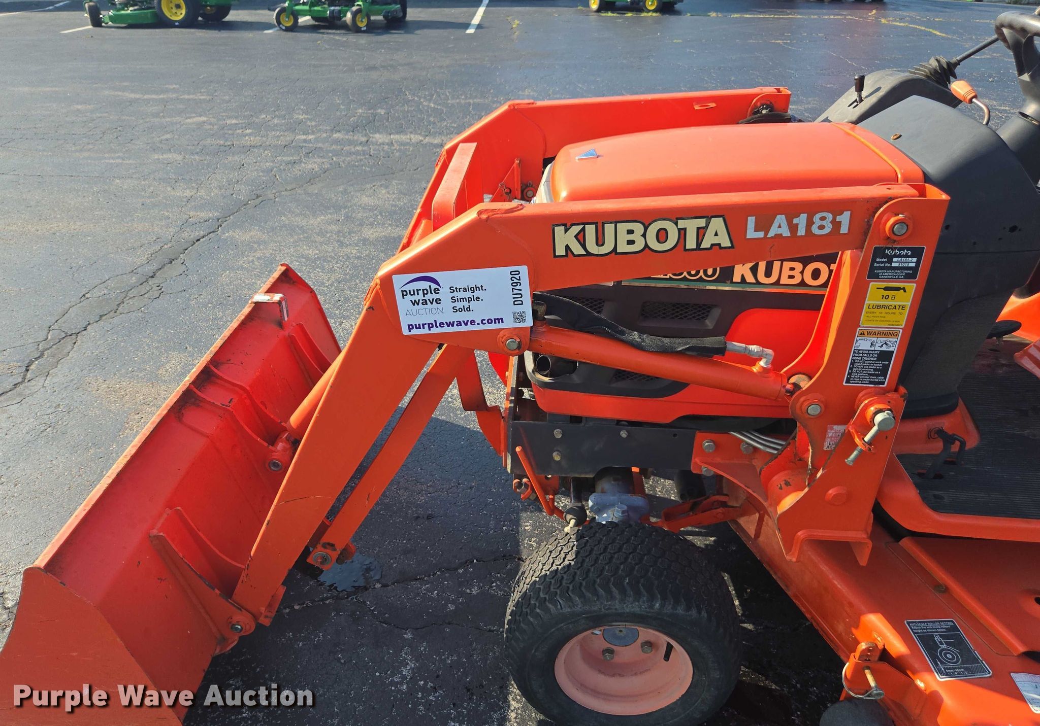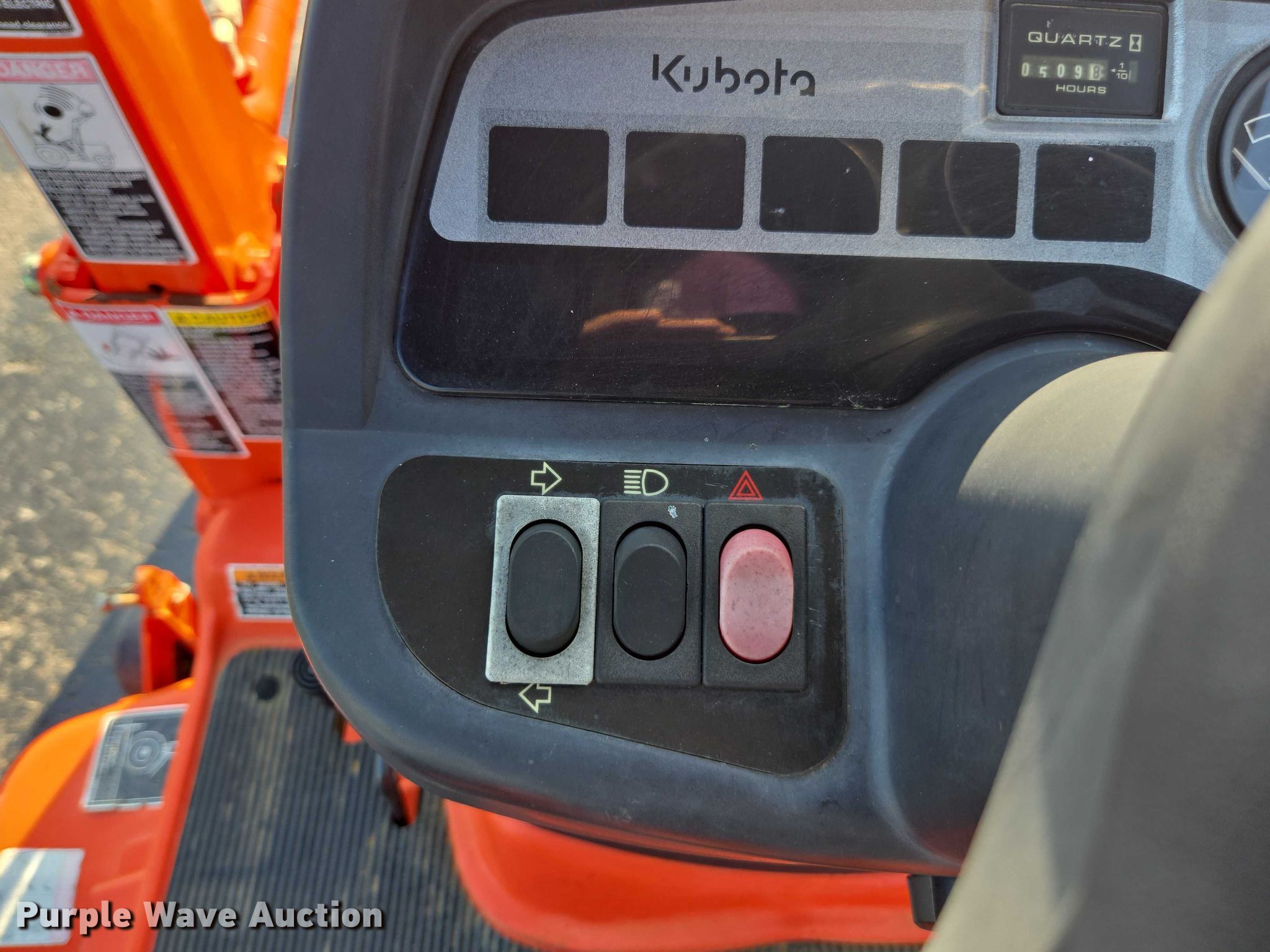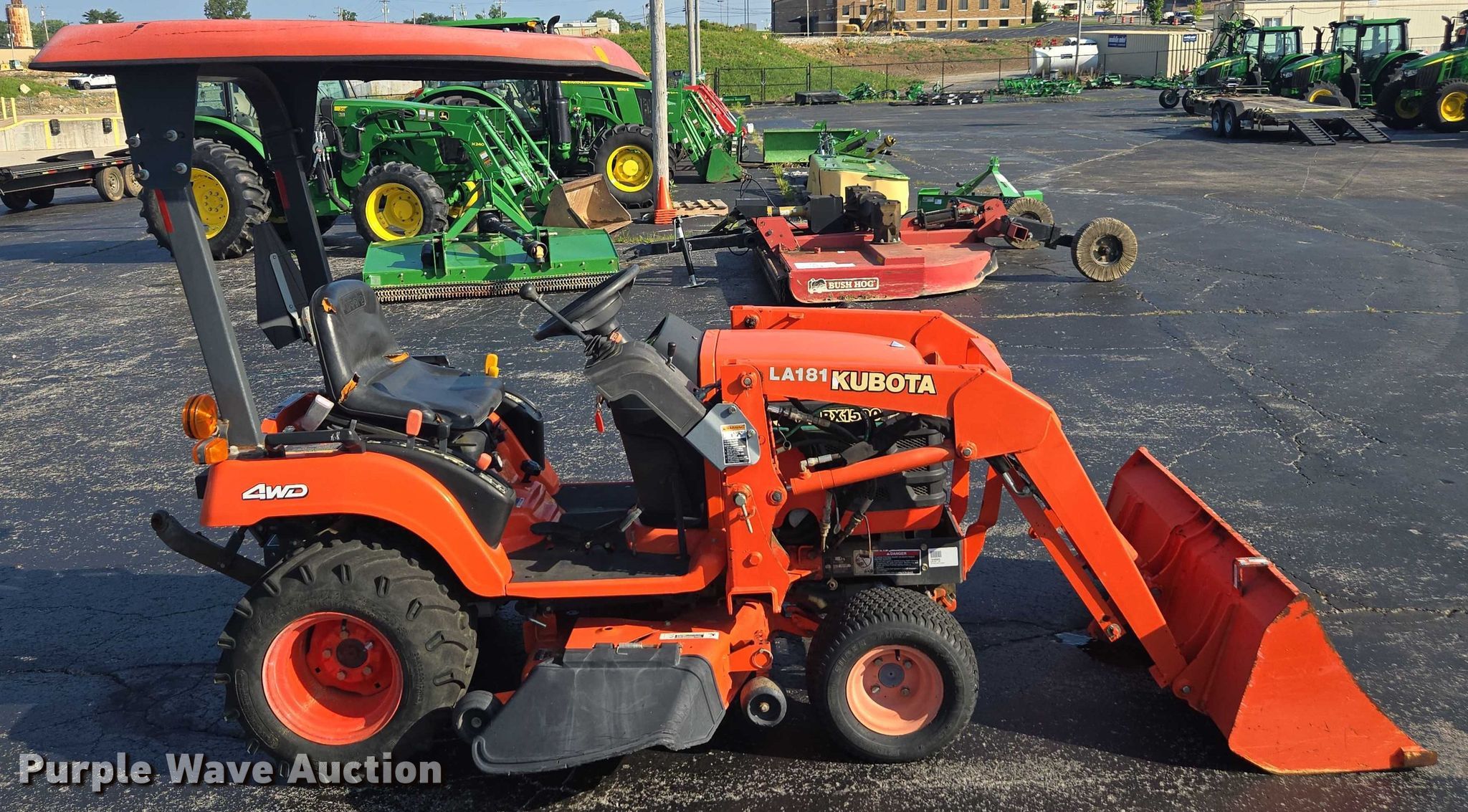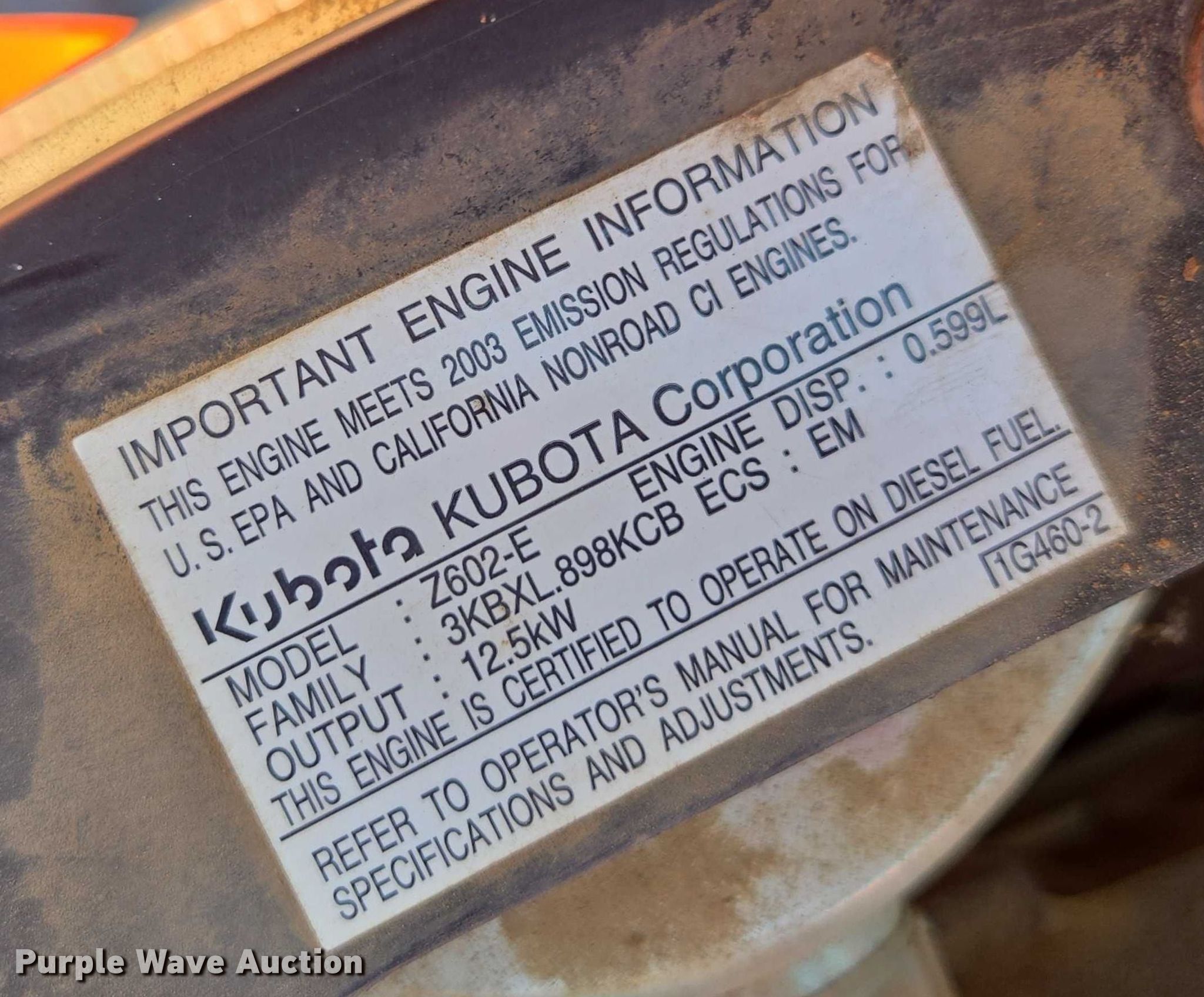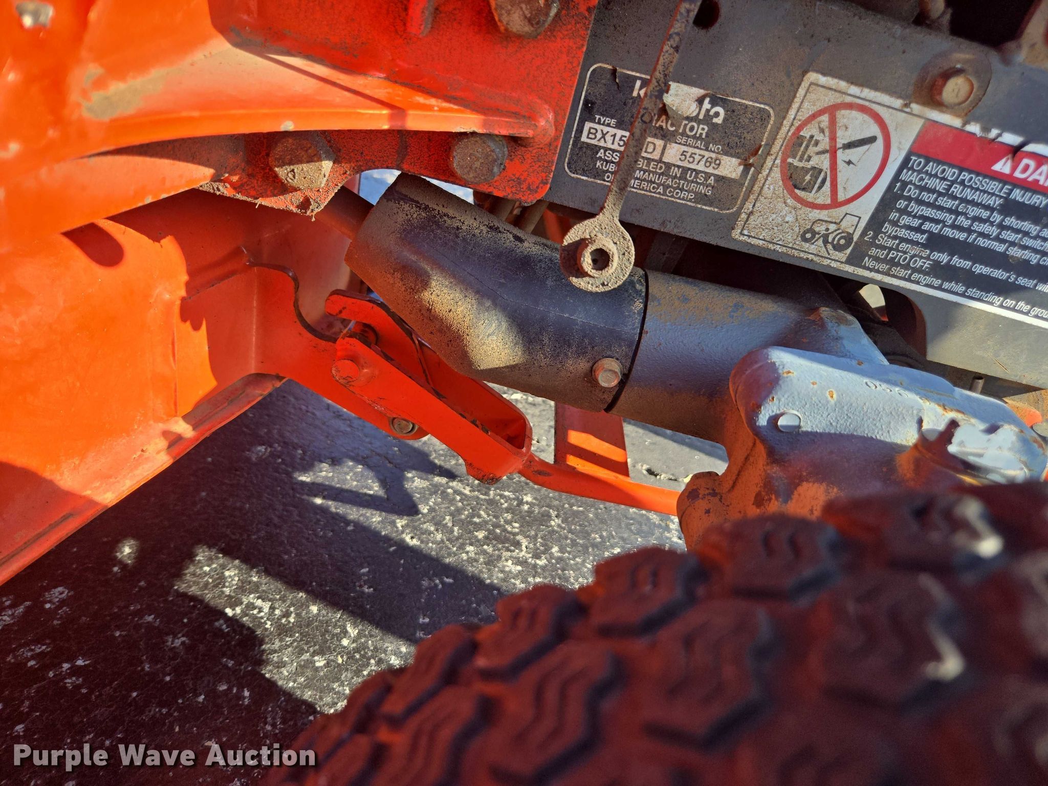 2005 Kubota BX1500D tractor. Hours: 510 on meter, Serial: 557-69, Unit #: 1040505. Engine Kubota Z602-E, Displacement: 0.599L, Cylinders: 2, Fuel type: Diesel. Transmission Hydrostatic, Differential lock. Features PTO: 540, Three point, Loader Kubota LA181, Controls: Joystick, Bucket Width: 47", Mower deck Width: 48". Tires Front: 16x7.50-8, Rear: 24x12-12. Notes Dead battery, Hydraulic leak. TriGreen Equipment. Crossville, TN 38555