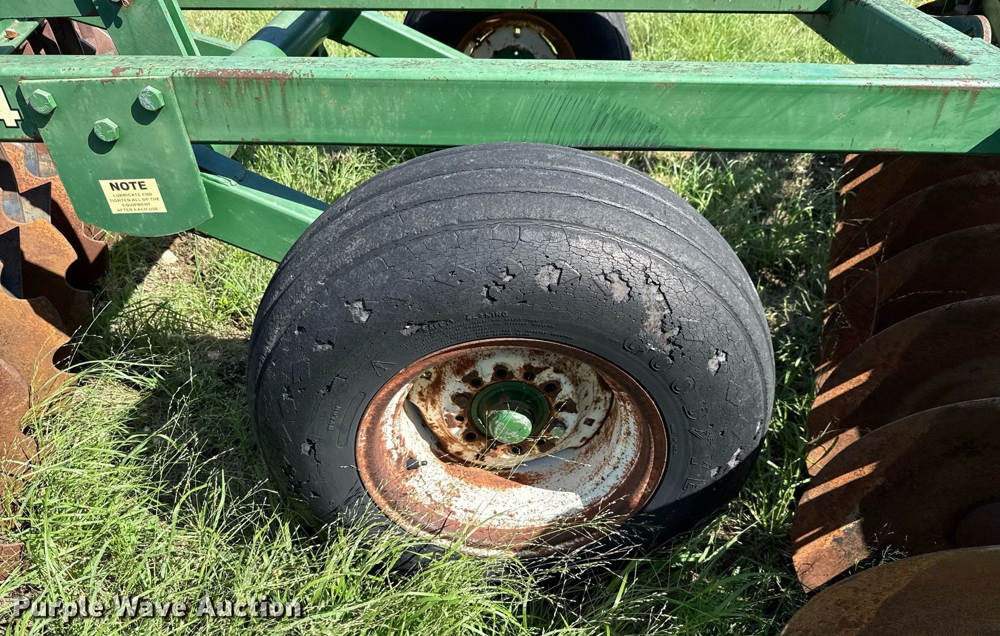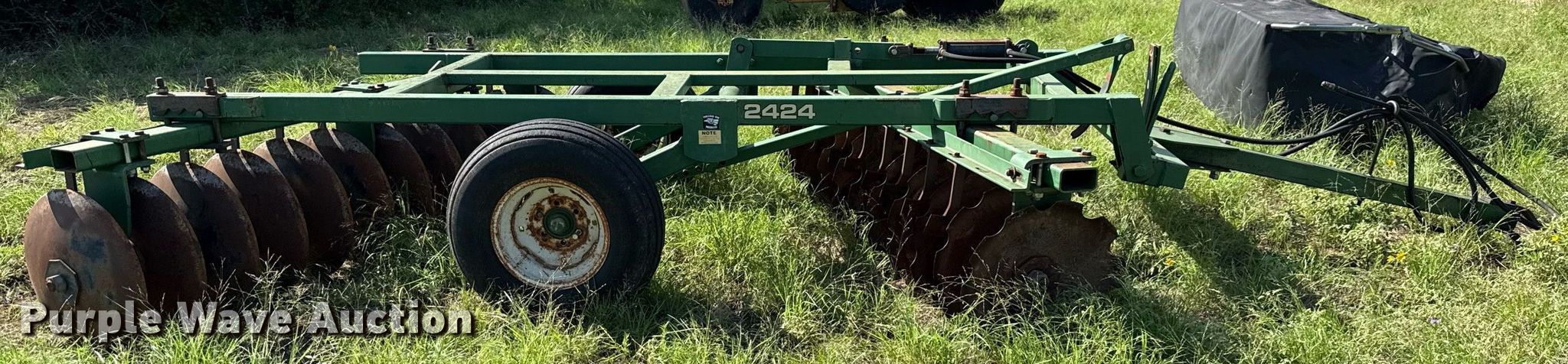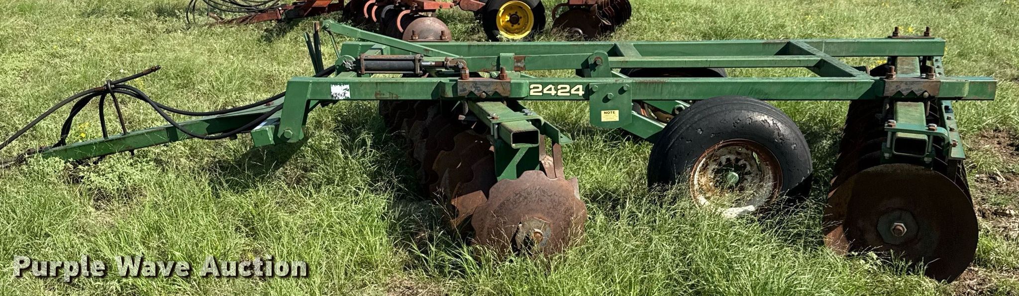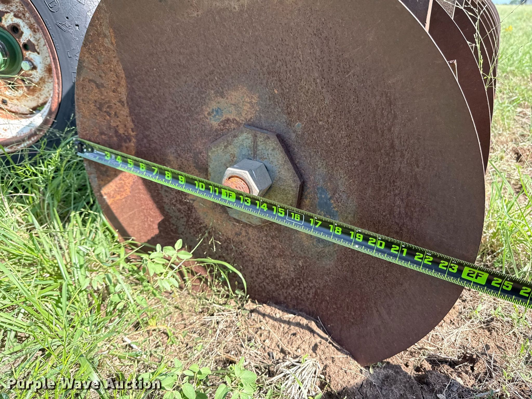 off-set disk. Overall width: 9'. Features Front blades Diameter: 23", Spacing: 8", Rear blades Diameter: 24", Spacing: 9", Disk scrapers, Operation Hydraulic lift. Tires Tire size: 11L-15.5L. Notes Spring broken, Non-operational unit. Hico, TX 76457