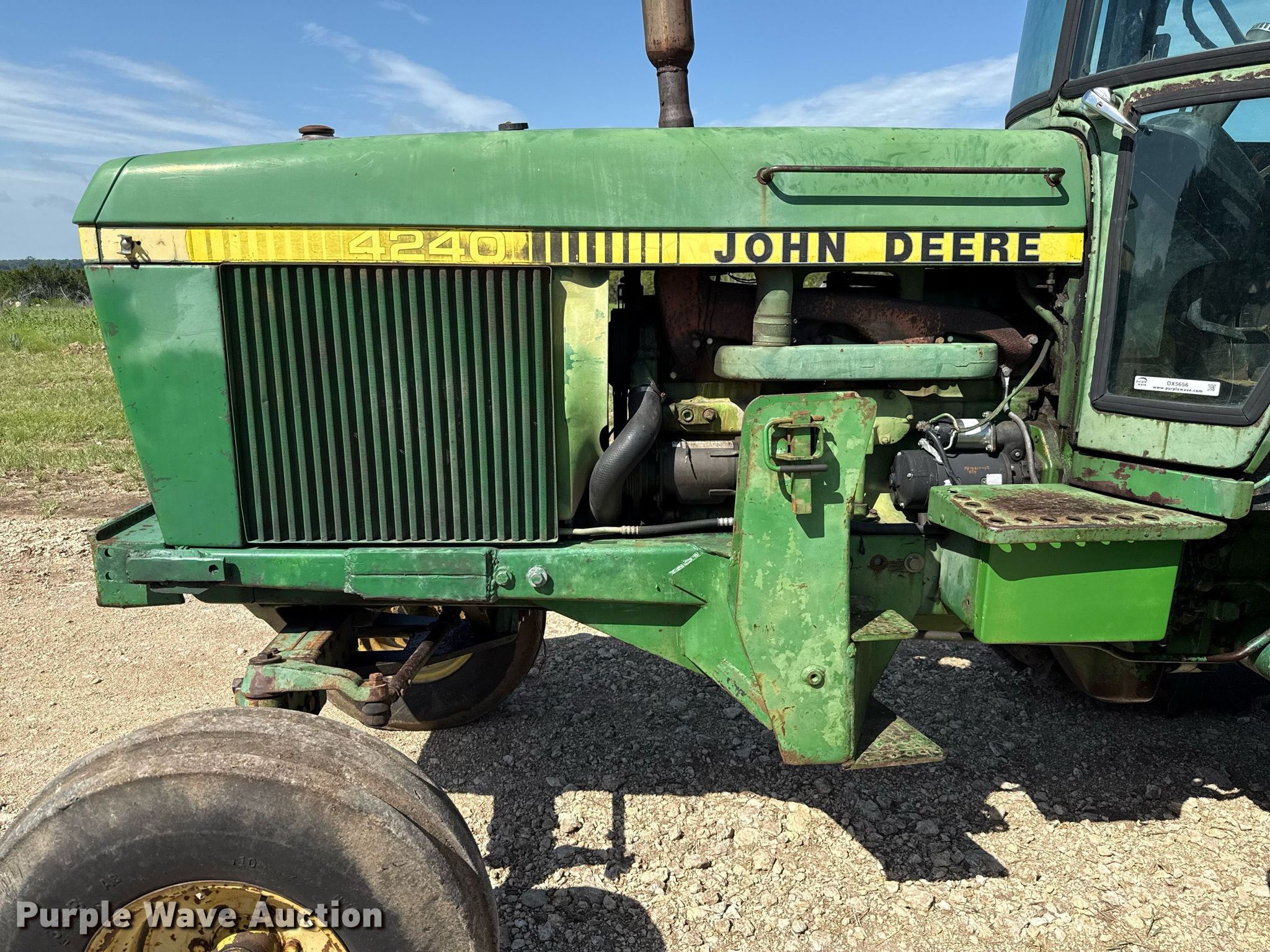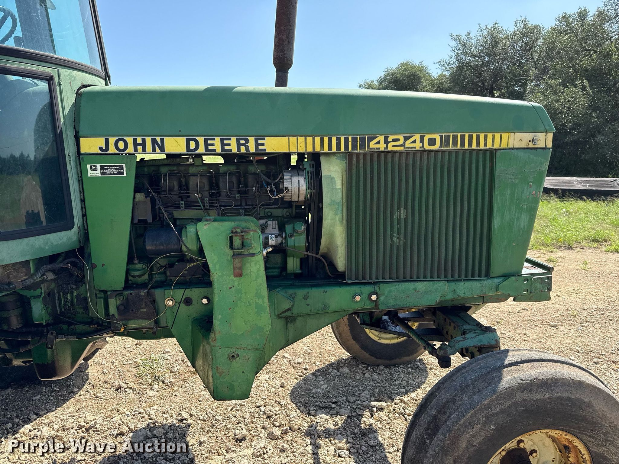 John Deere 4240 tractor. Hours: 2,221 on meter. Engine John Deere, Cylinders: 6, Fuel type: Diesel. Transmission Quad-range, 16F - 8R. Operators station AC, Heat. Features PTO: 540, 1000, Three point, Seven pin outlet, Hydraulic remote sets Rear: 3, Power beyond (hydraulics). Tires Front: 10.00-16, Rear: 20.8-38. Notes Serial plate missing, Kill switch cable issues, Non-operational climate control. Hico, TX 76457