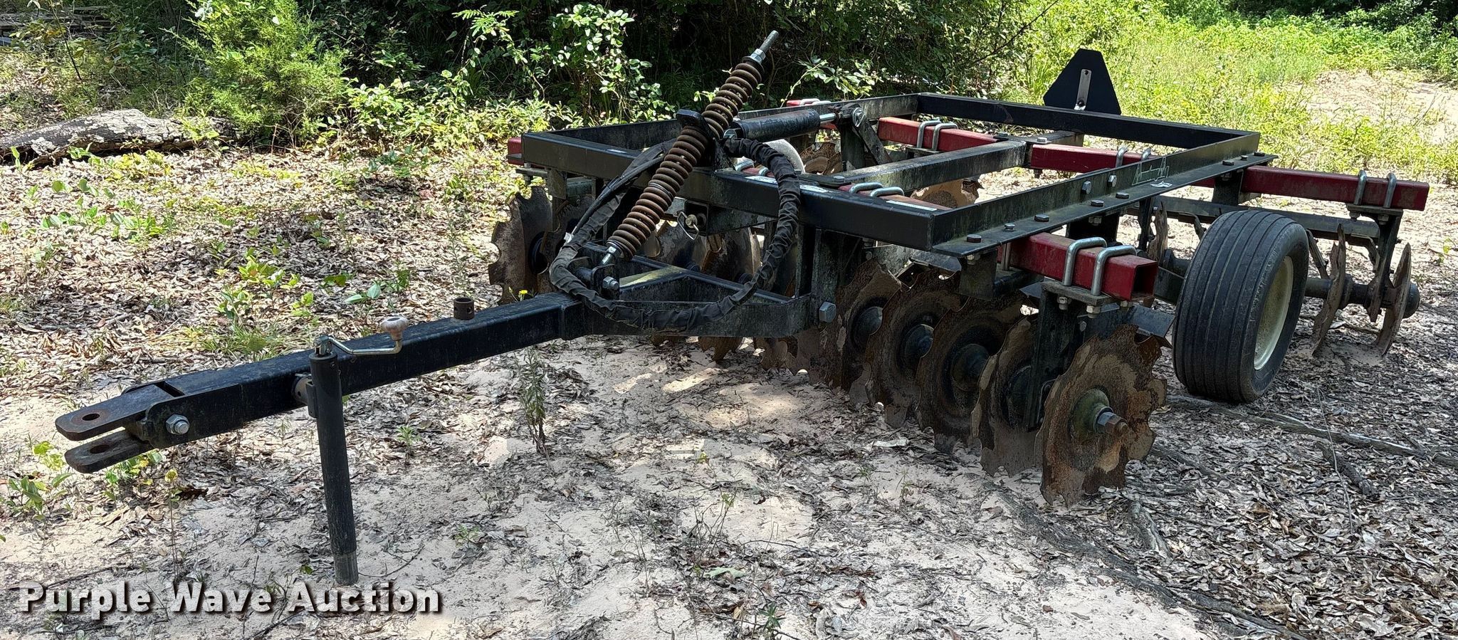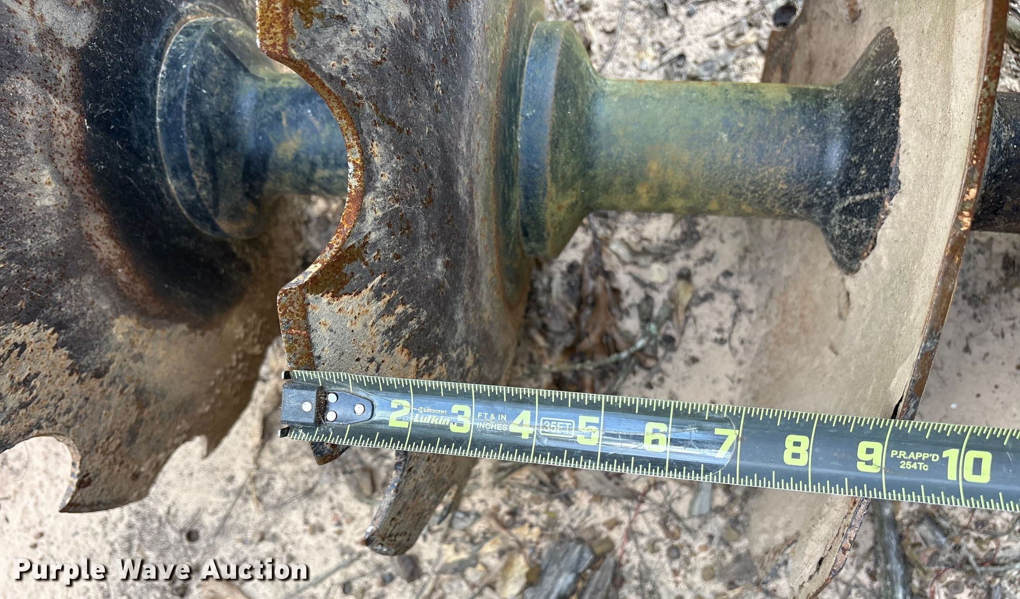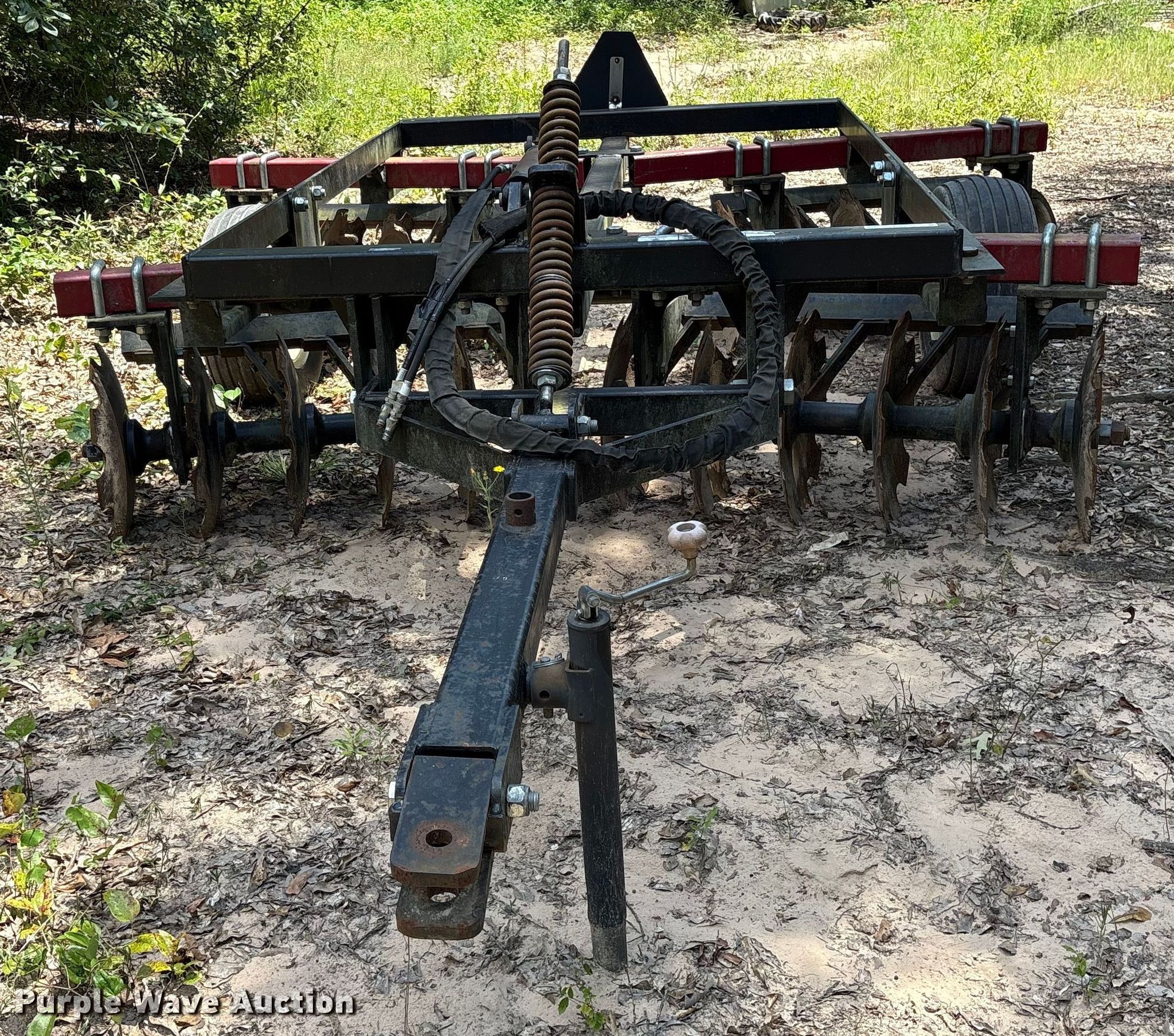 Armstrong Ag tandem disk. Overall width: 10' 6", Serial: 09499. Features Front blades Diameter: 22", Spacing: 9", Rear blades Diameter: 22", Spacing: 9", Disk scrapers, Operation Hydraulic lift, Hitch: Pin. Tires Tire size: 11L-15, Gauge wheels Size: 11L-15. Daingerfield, TX 75638