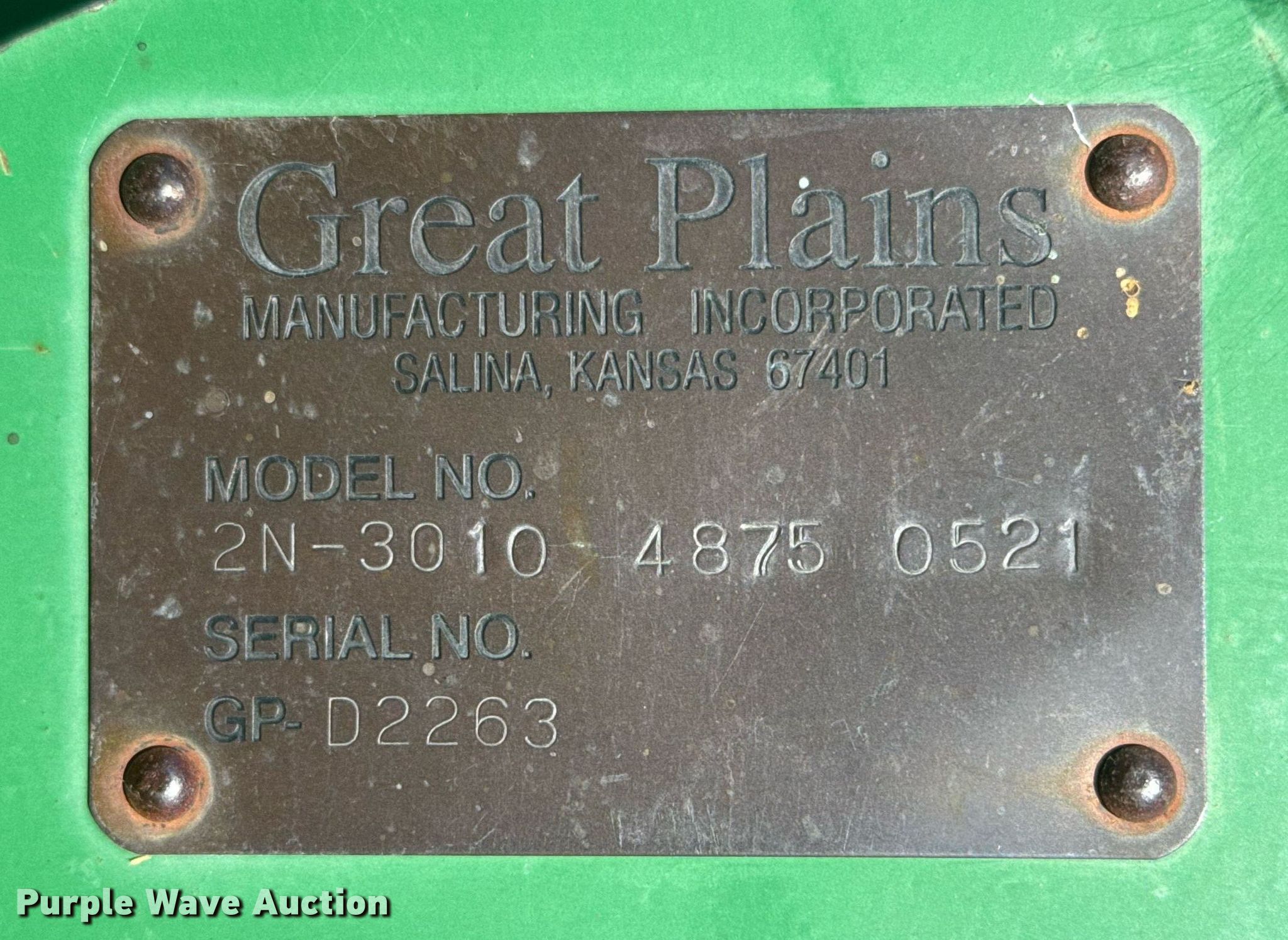 2006 Great Plains 2N-3010 grain drill. Width: 30', Row units: 48, Row spacing: 7", Serial: GP-D2263, Insurance salvage unit claim #: 5-801102. Features Frame Fold type: Wing, Seed delivery Bulk fill system, Row units Meter drive: Ground, Down pressure: Spring, No-till coulters, Disk openers: Double, Closing system: Single Type: Rubber, Fertilizer/ insecticide Fertilizer Liquid capacity: 300 gallons.. Tires Transport tire size: 12.5L-15 Quantity: 4, Drive/ outside tire size: 12.5L-15 Quantity: 4. Buyer is responsible for all aspects of loadout and removal. Oklahoma Farm Bureau Insurance. Laverne, OK 73848