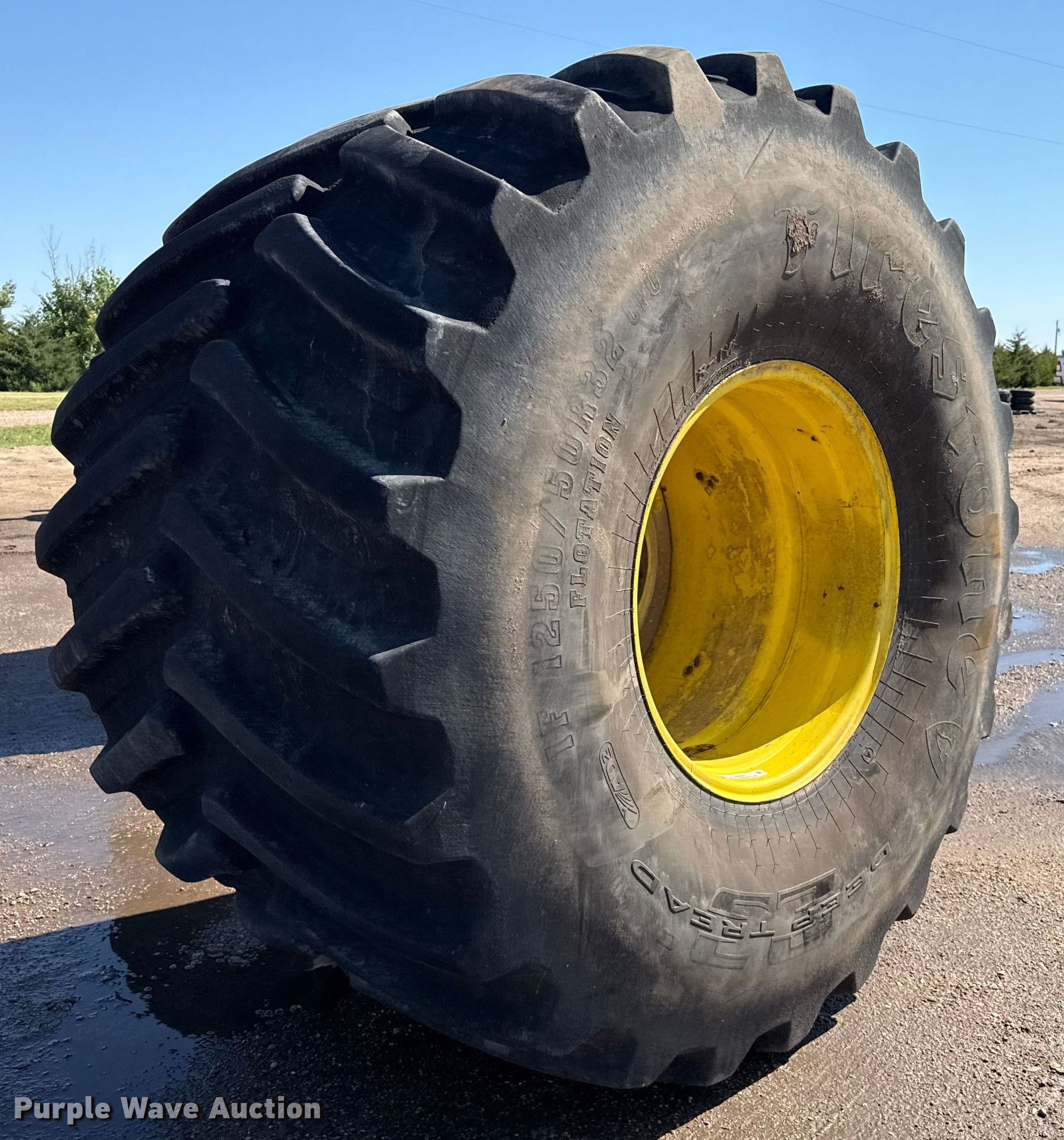 Purple Wave is selling a used Industrial Tires or Tracks in Kansas. This item is a (2) 1250/50R32 flotation tires and wheels with the following: Removed from John Deere S series combine