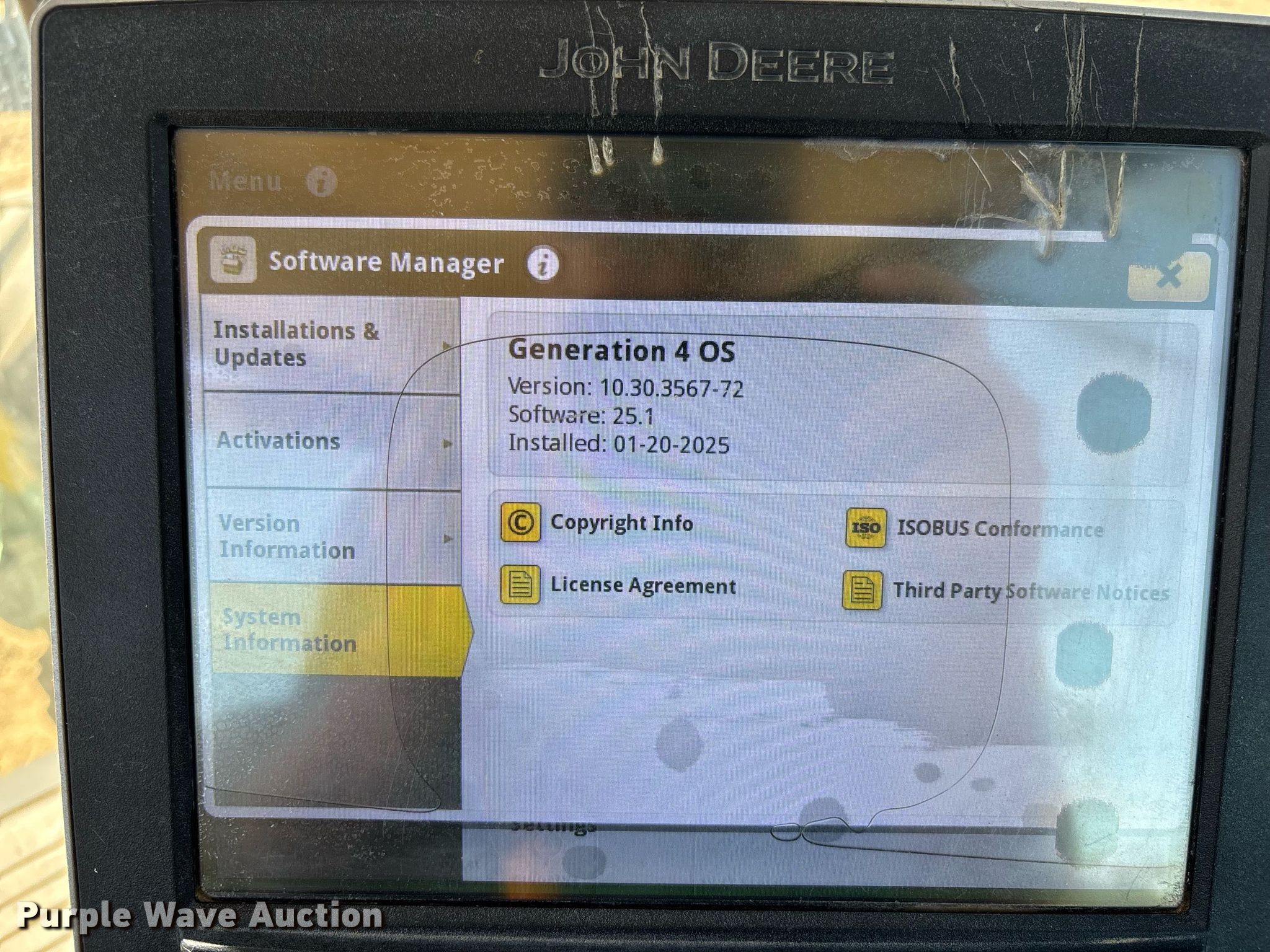2016 John Deere 8245R MFWD tractor. Hours: 7,148 on meter, Serial: 1RW8245RPGP110385. Engine John Deere 60903W464A, Serial: GJDXL09.0308, Displacement: 9.0L, Cylinders: 6, Fuel type: Diesel. Transmission Powershift, Differential lock. Operators station AC, Heat, Display John Deere Generation 4 OS, Auto steer, Ground radar. Features PTO: 1000, Three point Top link, Quick attach, Seven pin outlet, ISOBUS outlet, Hydraulic remote sets Rear: 4, Power beyond (hydraulics), Suitcase weights: 21. Tires Front: 480/70R34, Rear: 520/85R46, Wheel weights: 4, Duals. Pacific Ag Rentals. Merced, CA 95341