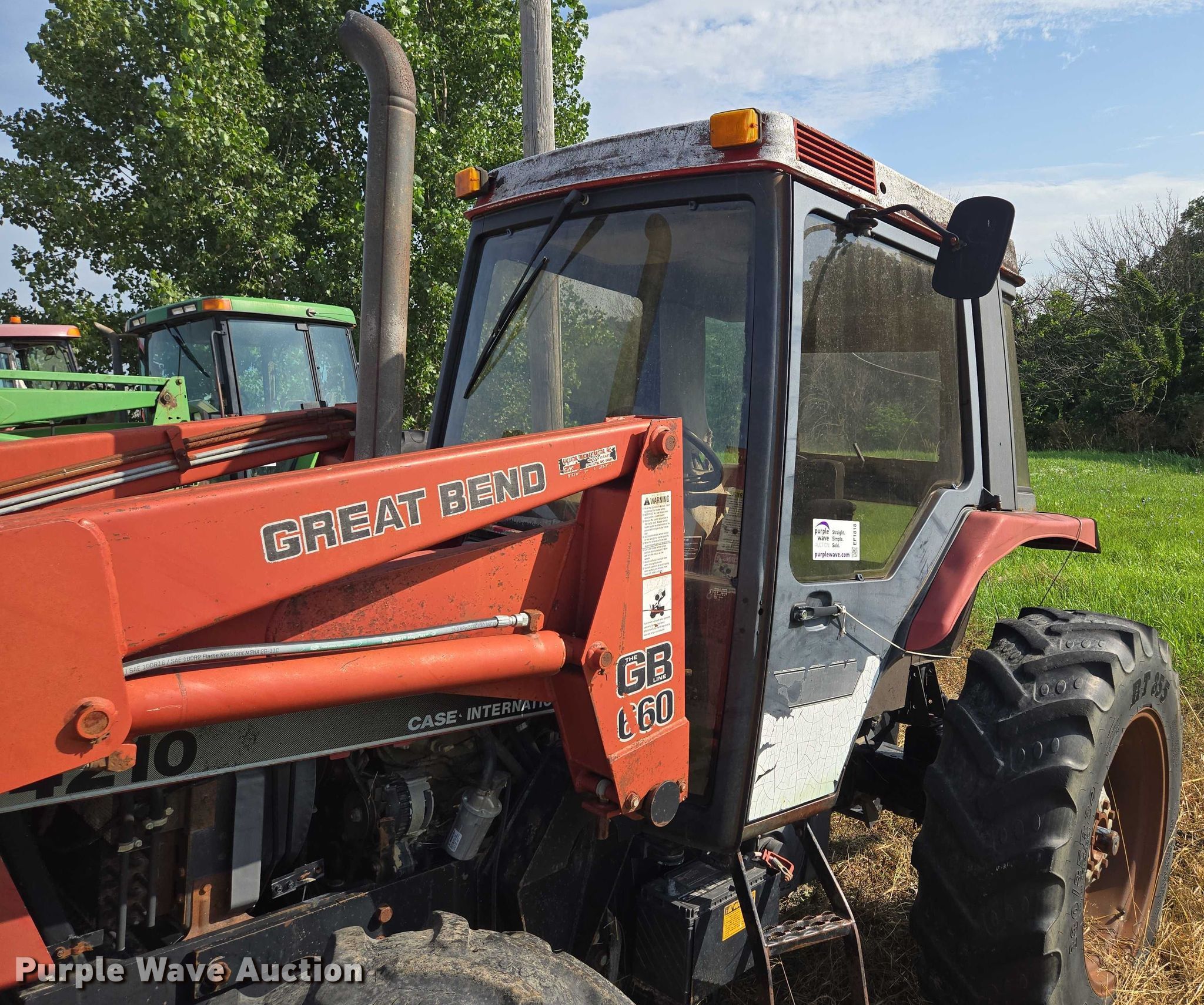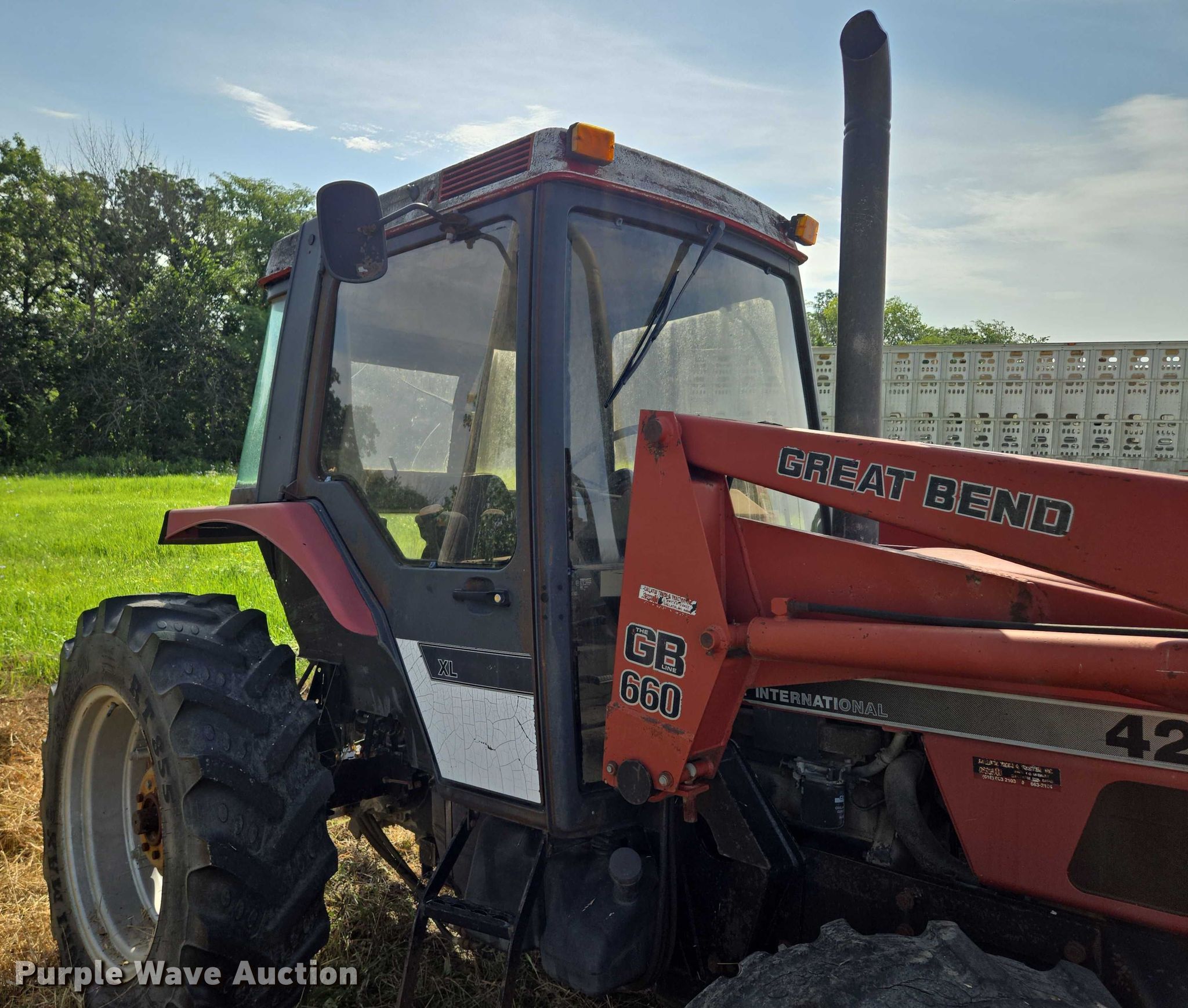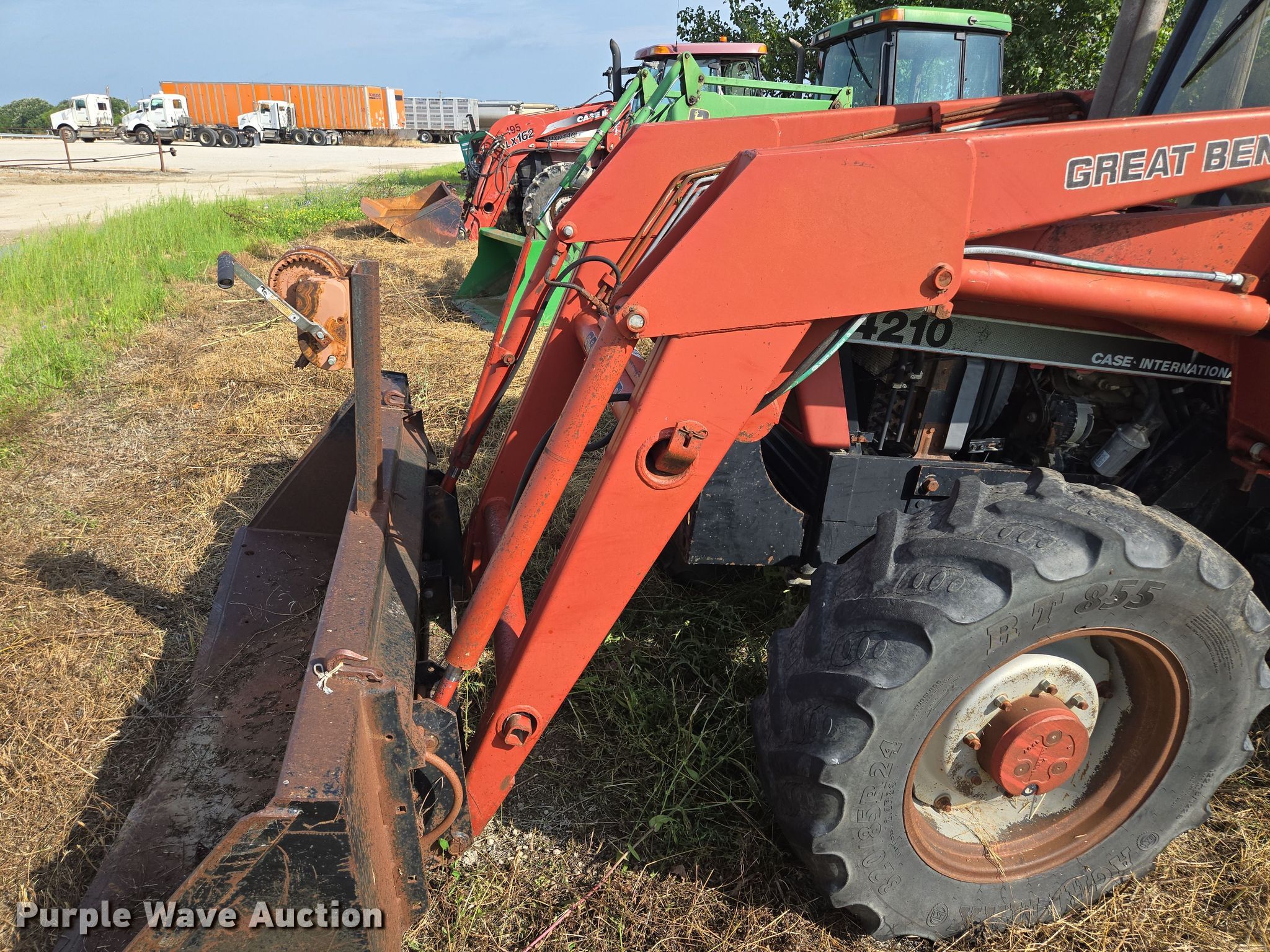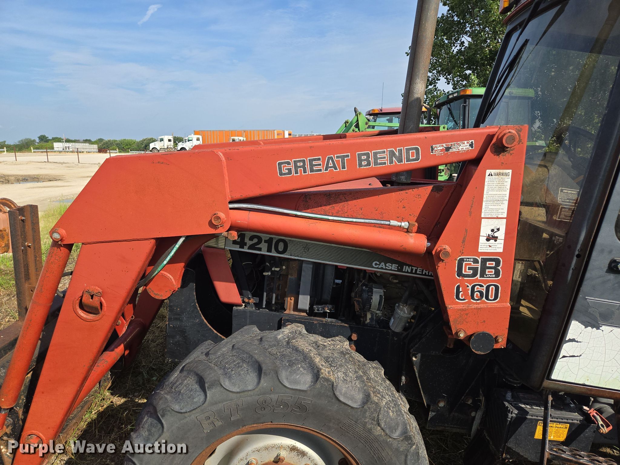 Case IH 4210 MFWD tractor. Hours: Unknown. Engine Cylinders: 4, Fuel type: Diesel. Transmission Powershift, 16F - 8R, Differential lock. Operators station AC, Heat. Features PTO: 1000, Three point, Seven pin outlet, Hydraulic remote sets Rear: 2, Loader Great Bend 660, Controls: Two-lever, Bucket Width: 84".. Tires Front: 320/85R24, Rear: 380/85R30. Notes Glass cracked, Dead battery, Battery terminal damaged, Unknown operating condition of AC and heat, Bucket damage, bent, Non-operational unit. Princeton, MO 64673