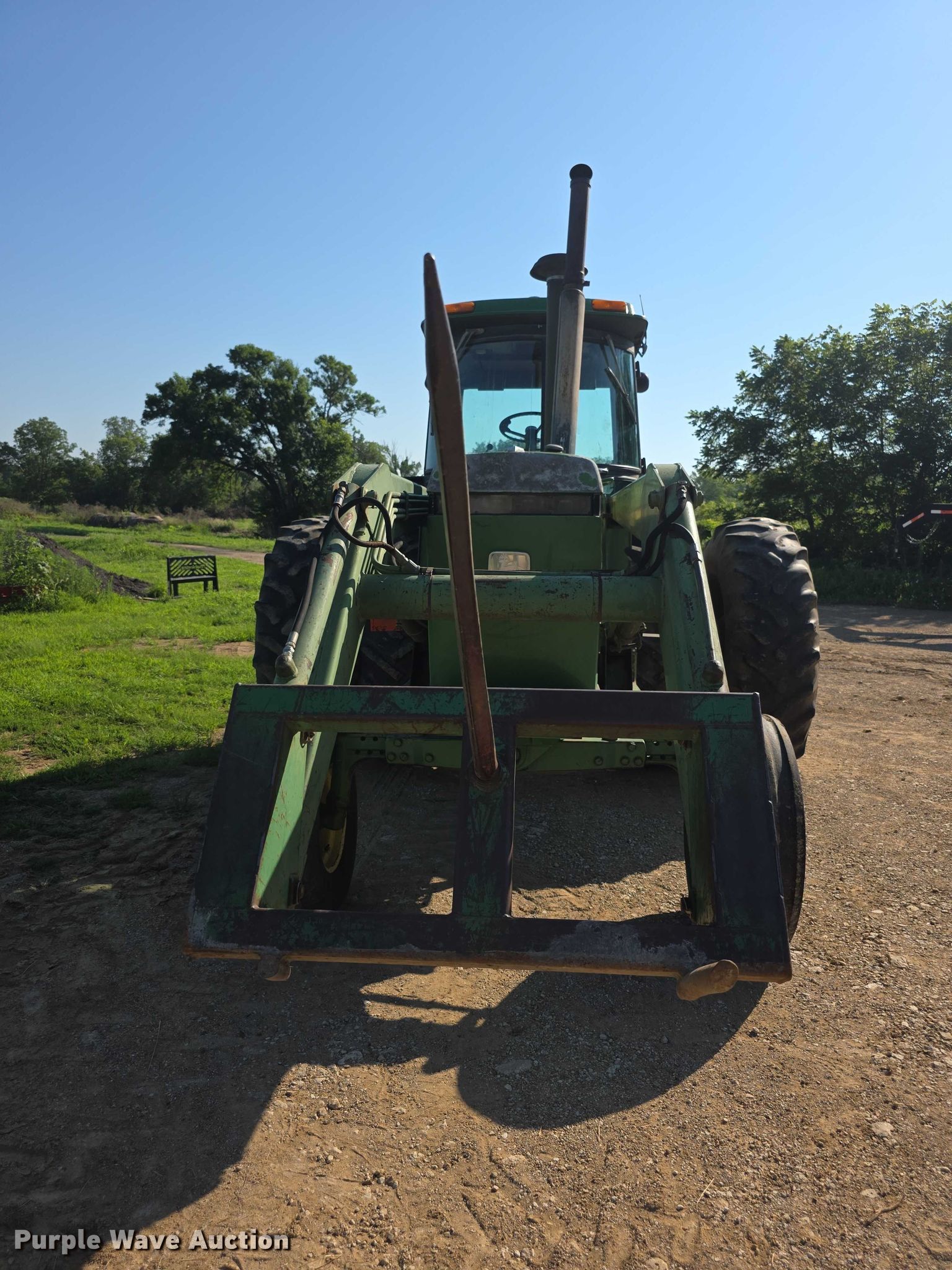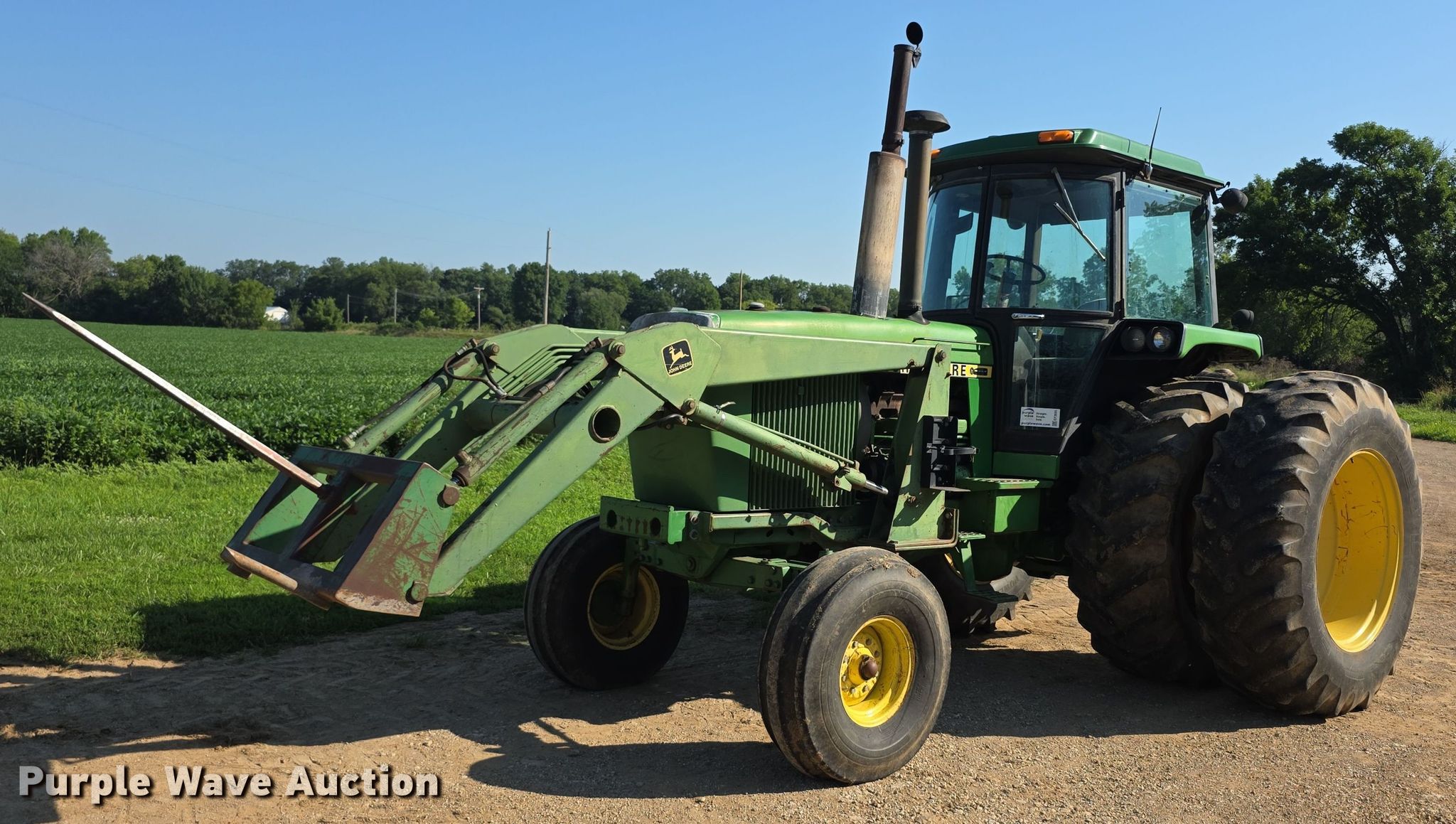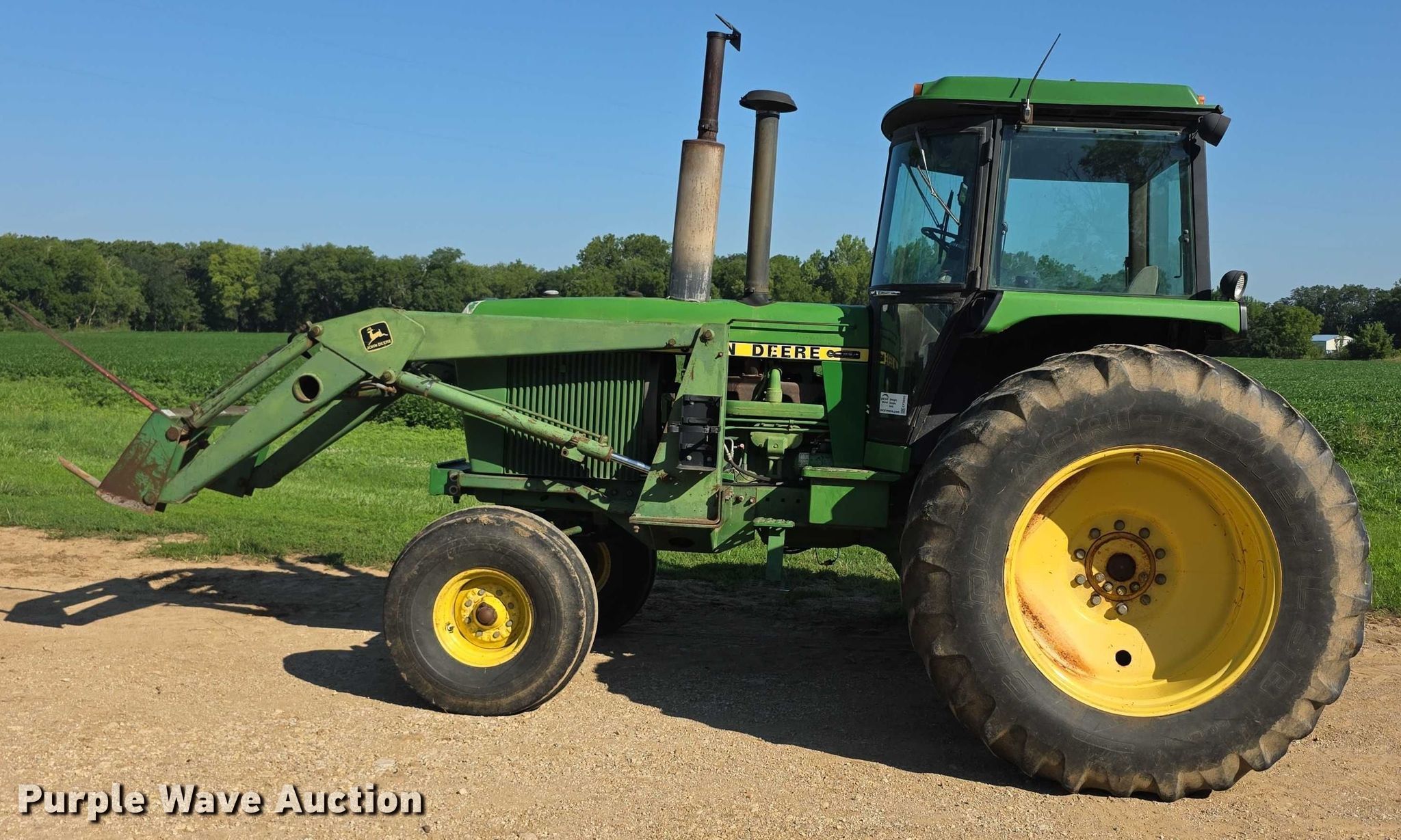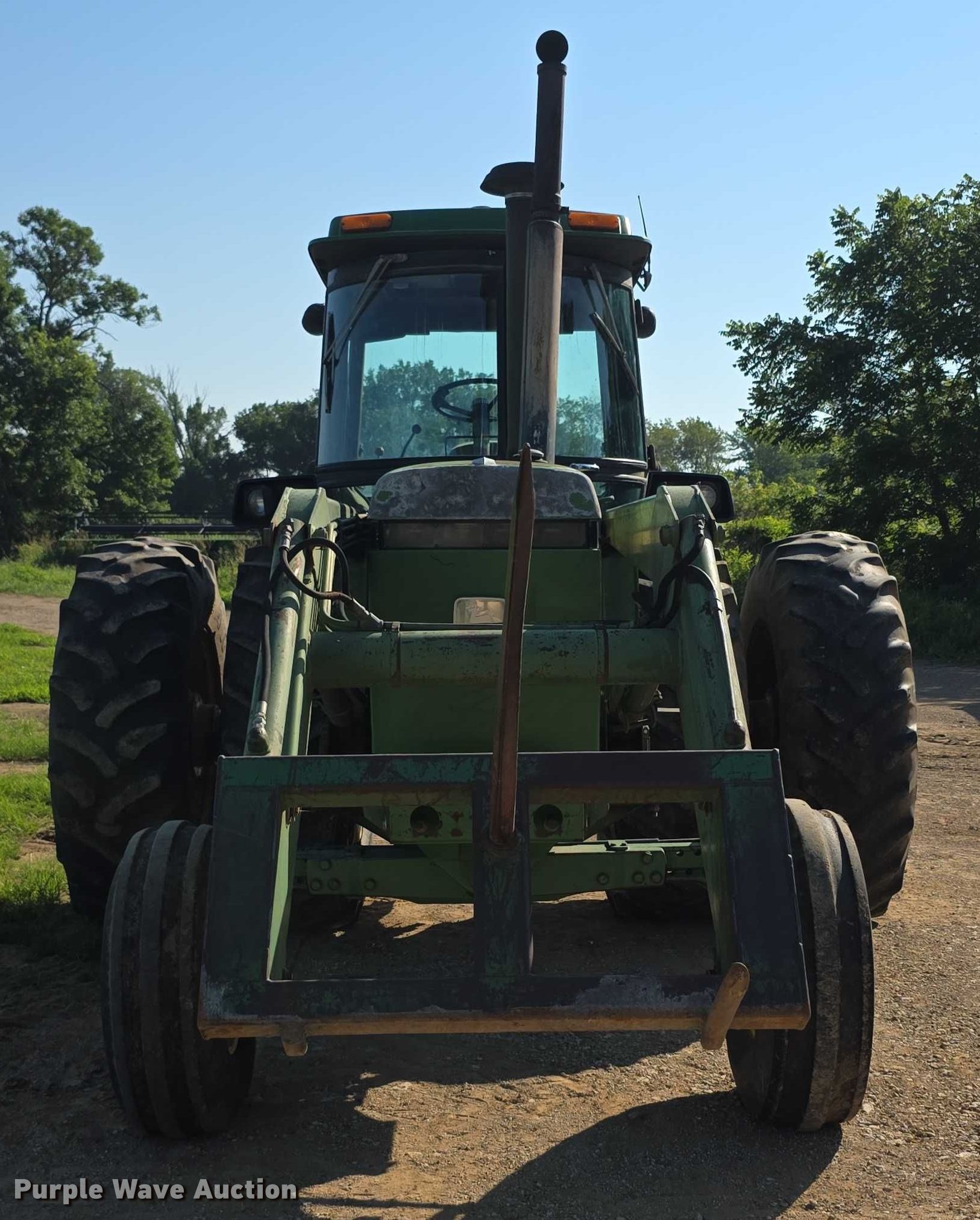 1985 John Deere 4450 tractor. Hours: 5,085 on meter, Serial: RW4450H020505. Engine John Deere, Serial: RG6466T298173, Cylinders: 6, Fuel type: Diesel. Transmission Quad-range, 16F - 6R, Differential lock. Operators station AC, Heat. Features PTO: 540, Three point Top link, Seven pin outlet, Hydraulic remote sets Rear: 2, Loader John Deere, Bale spear, Controls: Joystick. Tires Front: 11.00-16, Rear: 20.8-38, Duals. Manhattan, KS 66502
