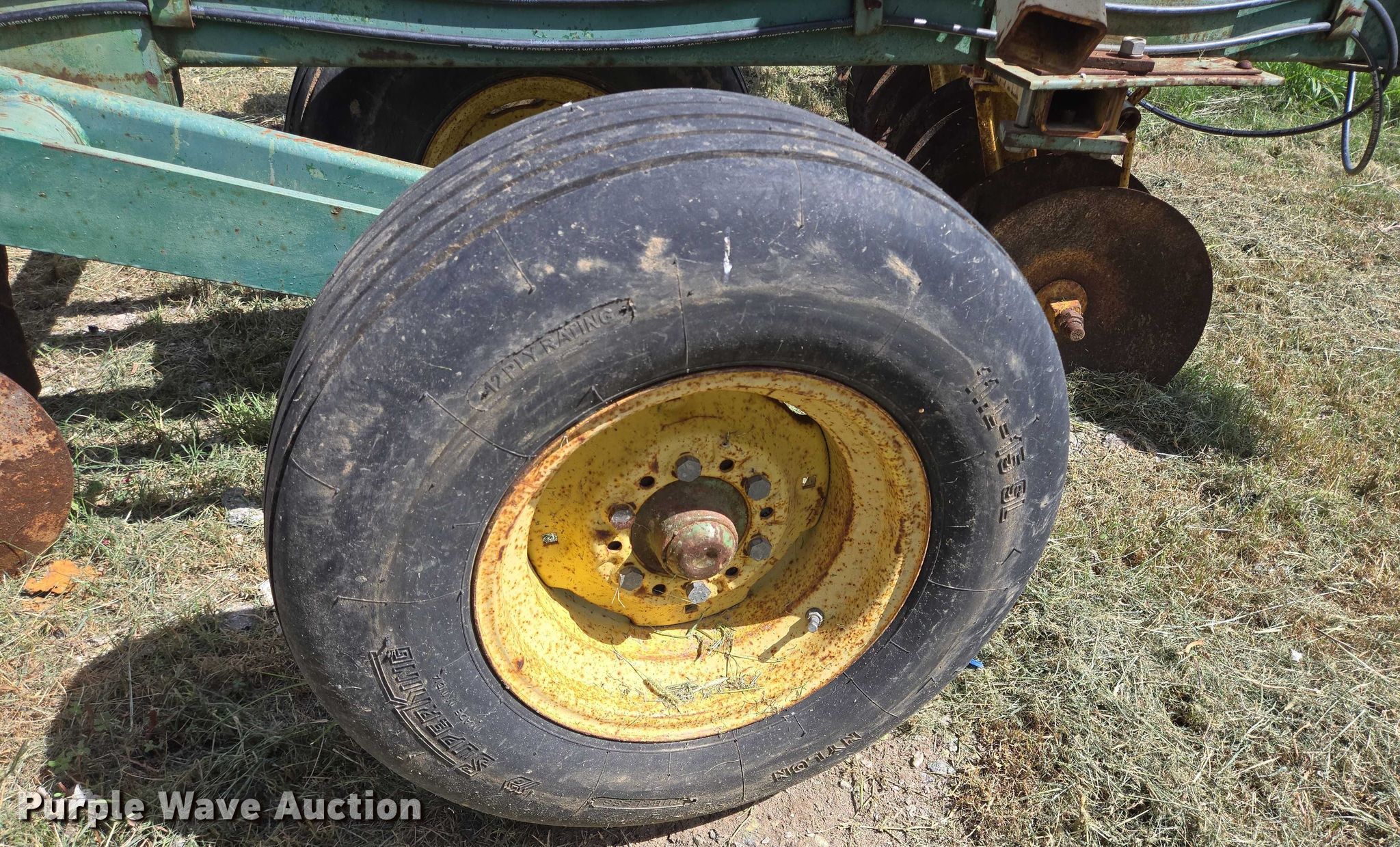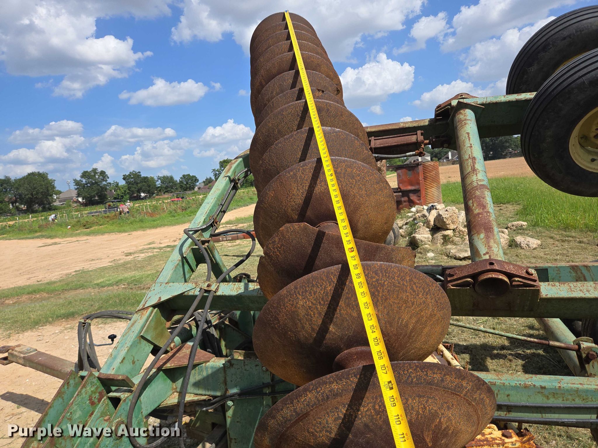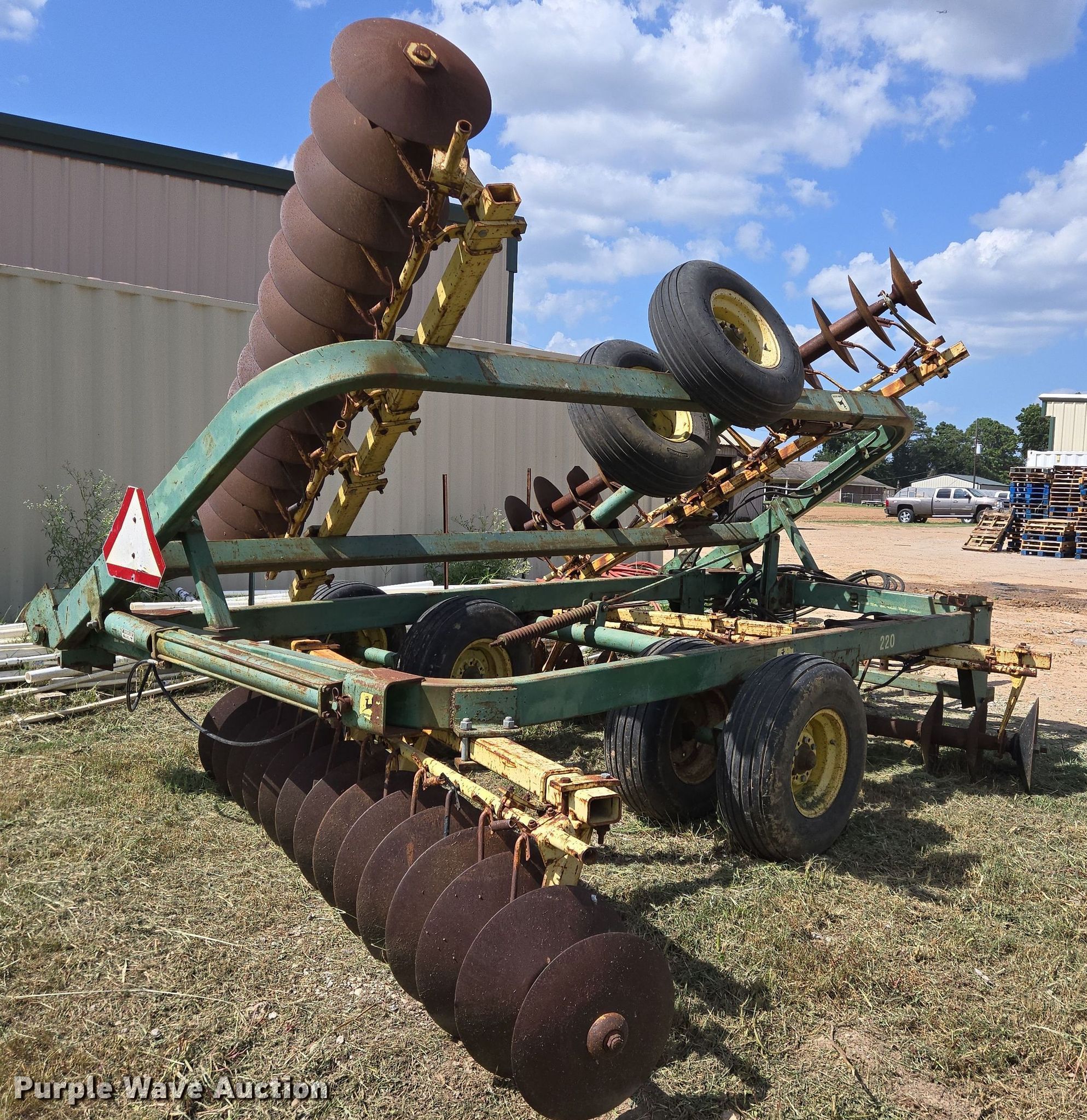 John Deere off-set disk. Overall width: 20'. Features Front blades Diameter: 20", Spacing: 9", Rear blades Diameter: 20", Spacing: 9", Operation Hydraulic fold. Tires Tire size: 11.L-15 SL. Atkinson and Son Farms. Spring, TX 77388