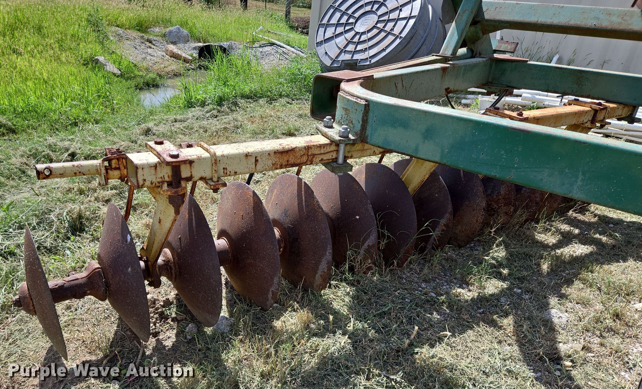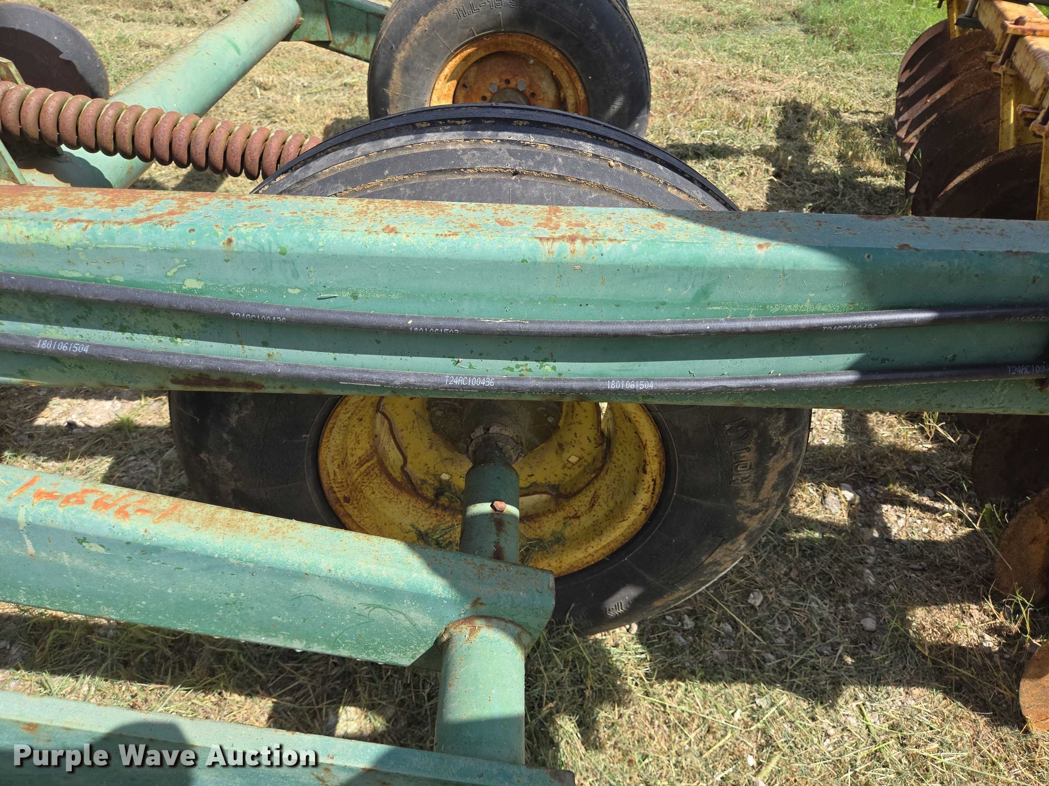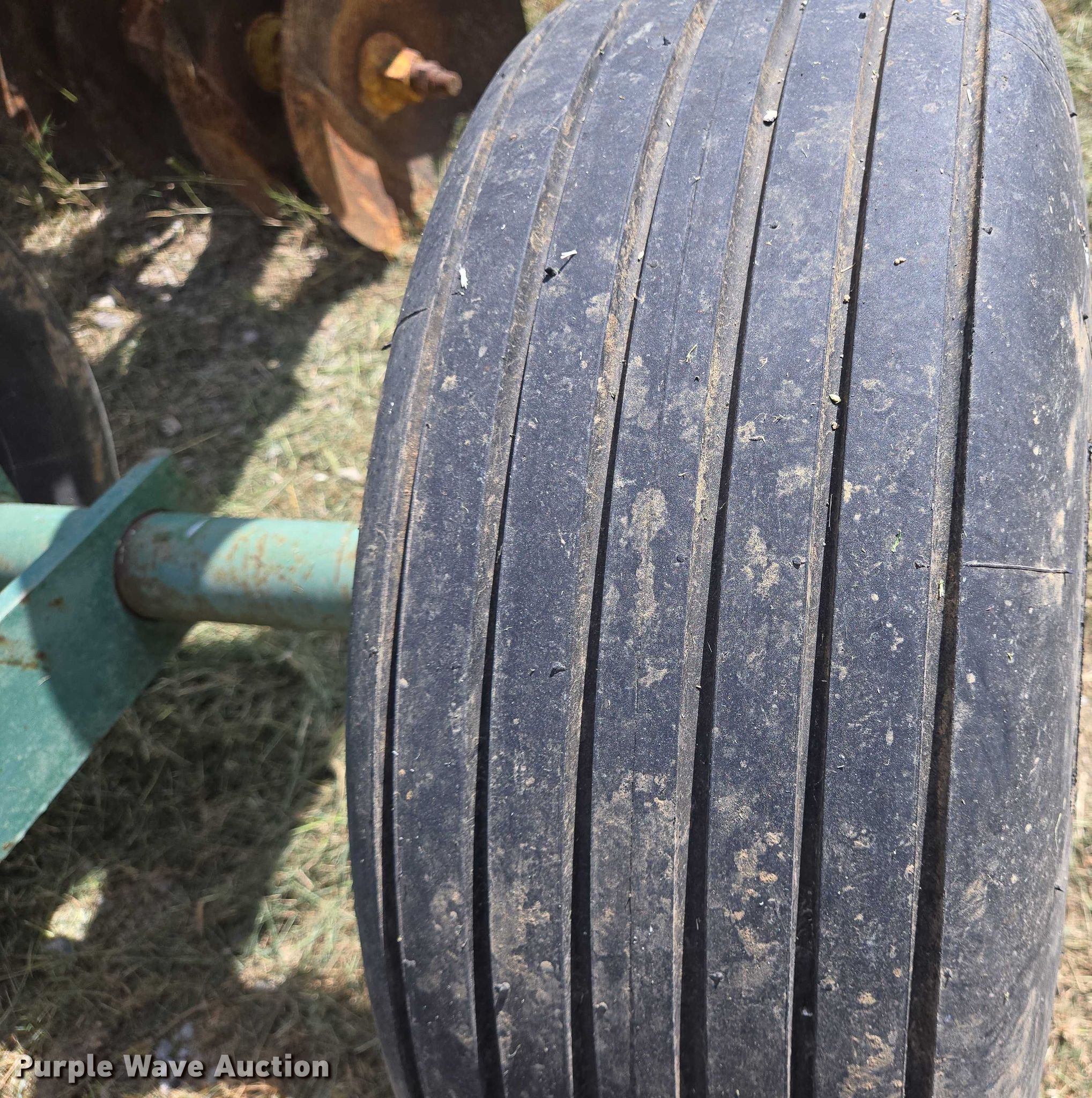 John Deere off-set disk. Overall width: 20'. Features Front blades Diameter: 20", Spacing: 9", Rear blades Diameter: 20", Spacing: 9", Operation Hydraulic fold. Tires Tire size: 11.L-15 SL. Atkinson and Son Farms. Spring, TX 77388