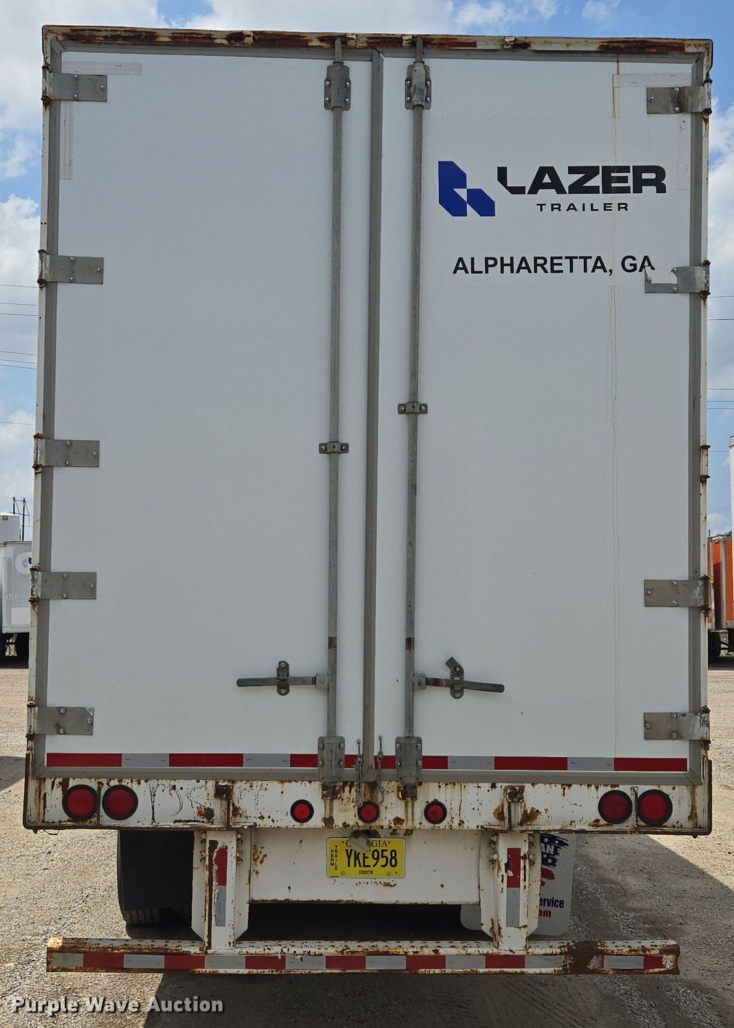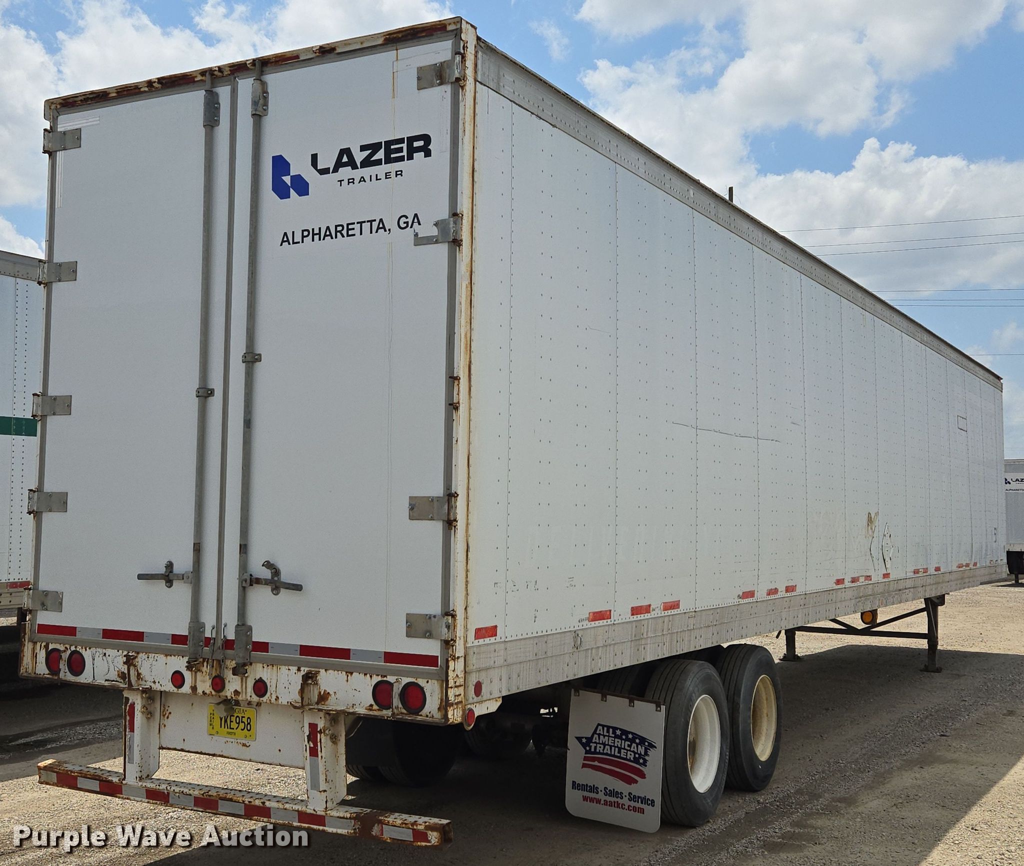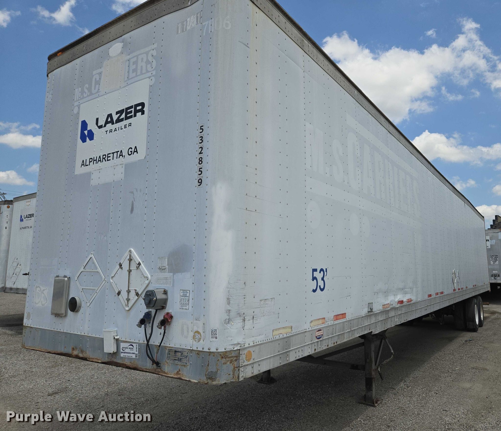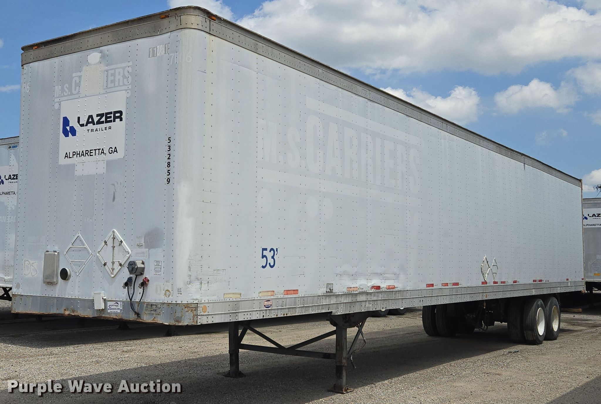 2000 Lufkin TFV-IPST dry van trailer. VIN: 1L01A5322Y1140859. Dimensions Overall Length: 53', Width: 102". Features Deck type: Wood, E-track rail system. Chassis Landing gear: Dual, Suspension: Air, Brakes: Air, Axles: Tandem Sliding, GVWR: 65,000 lbs. Tires Steel wheels, Size: 295/75R22.5. Georgia title. Title distribution may be delayed up to 14 days from verification of funds. Lazer Trailers. 3414 Gardner Avenue. Kansas City, MO 64120