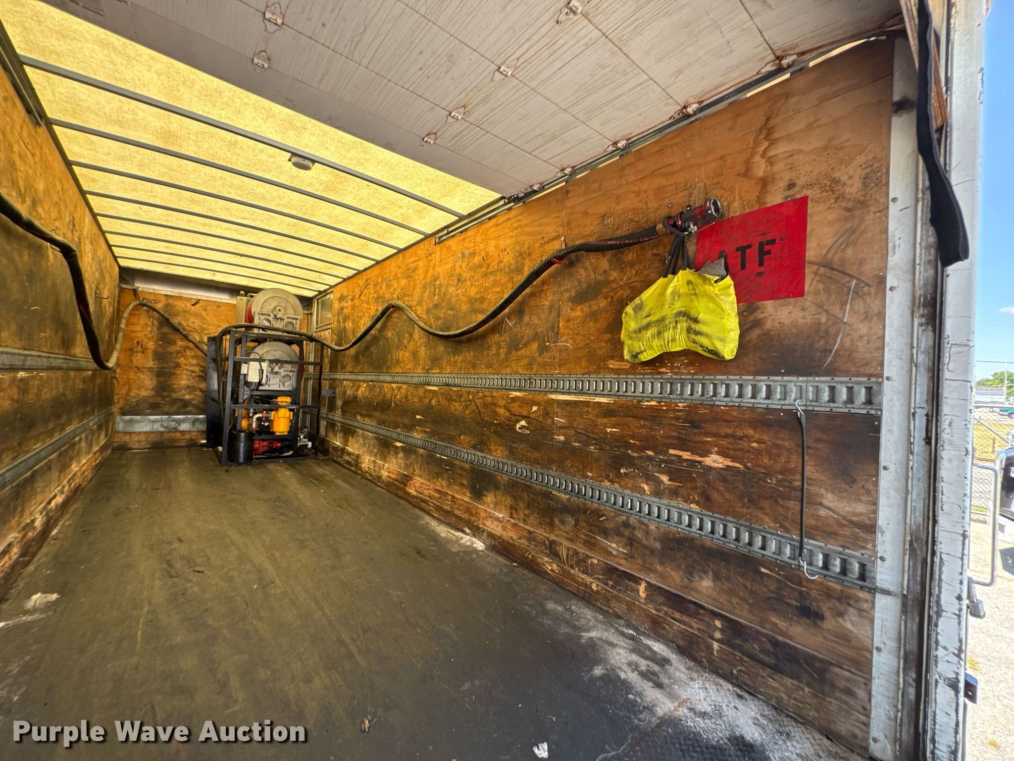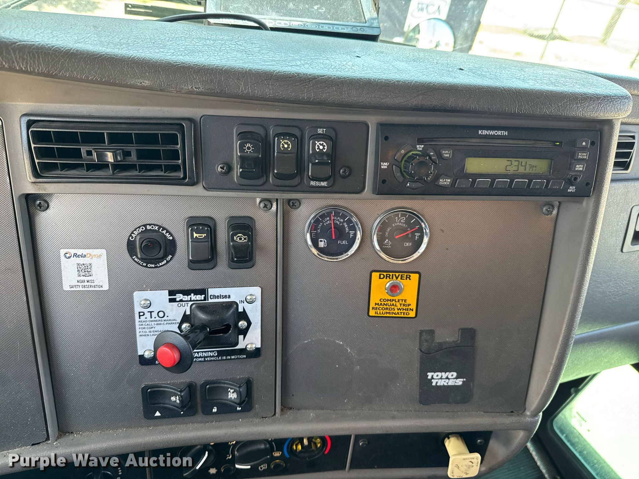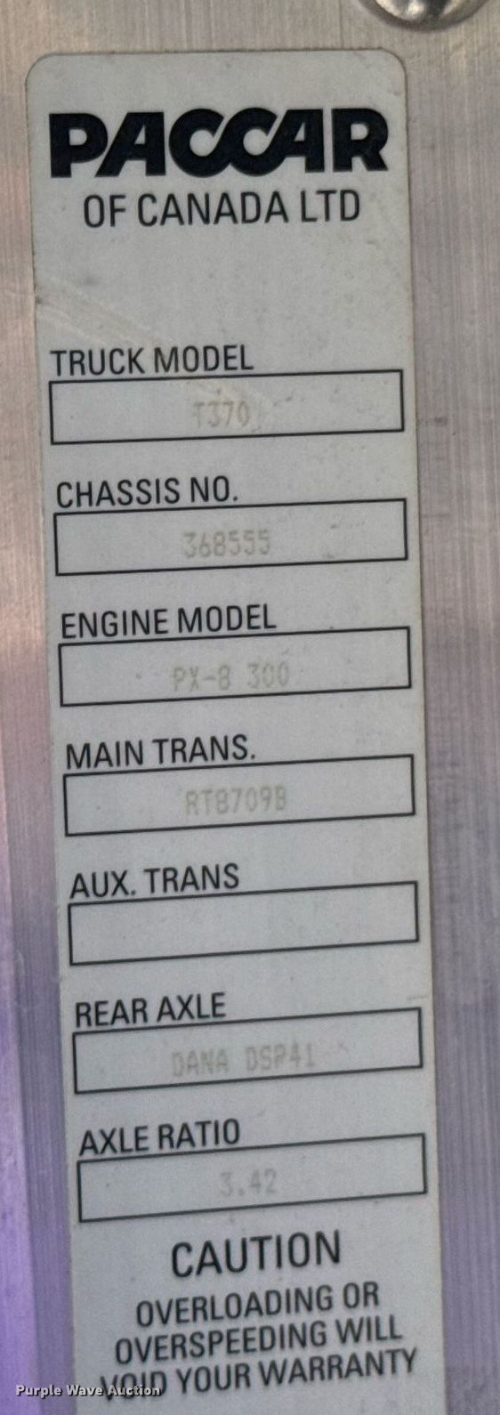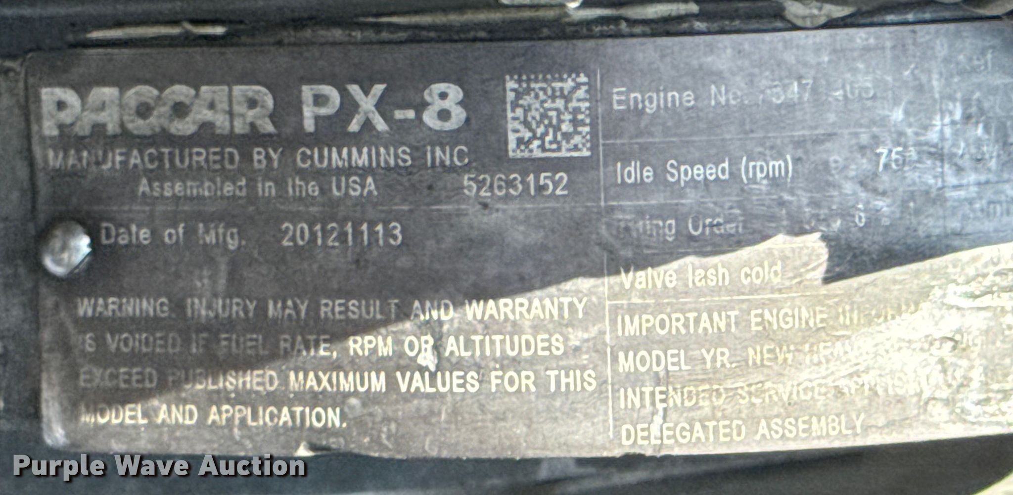 2013 Kenworth T370 box truck. Miles: 352,279 on odometer, Hours: 12,142 on meter, VIN: 2NKHLN9XXDM368555. Engine Paccar PX-8, Displacement: 8.3L, Cylinders: 6, Fuel type: Diesel. Transmission Eaton Fuller, Manual, Speed: 9. Chassis Axles: Tandem, Suspension: Air, Brakes: Air, GVWR: 54,600 lbs. Interior AC, Heat, Power windows, Power locks, Cruise control. Features Bed Box bed, Length: 26' 6", Width: 102", Height: 12' 9", E-track rail system, Floor: Wood, End gate lift Maxon, Capacity: 5,000 lbs, PTO, Pump GPM: 100, (2) Hannay hose reels Approx. 75' of 1 1/2" diameter hose, (2) Lectro Count LCR 600 monitors. Tires Front: 295/75R22.5, Rear: 275/80R22.5. Notes GPS and dashcam will be removed prior to auction, Non-operational backup camera, Engine issues Unit must be towed or hauled. Nebraska title. Title distribution may be delayed up to 30 days from verification of funds. Reladyne. Joplin, MO 64801