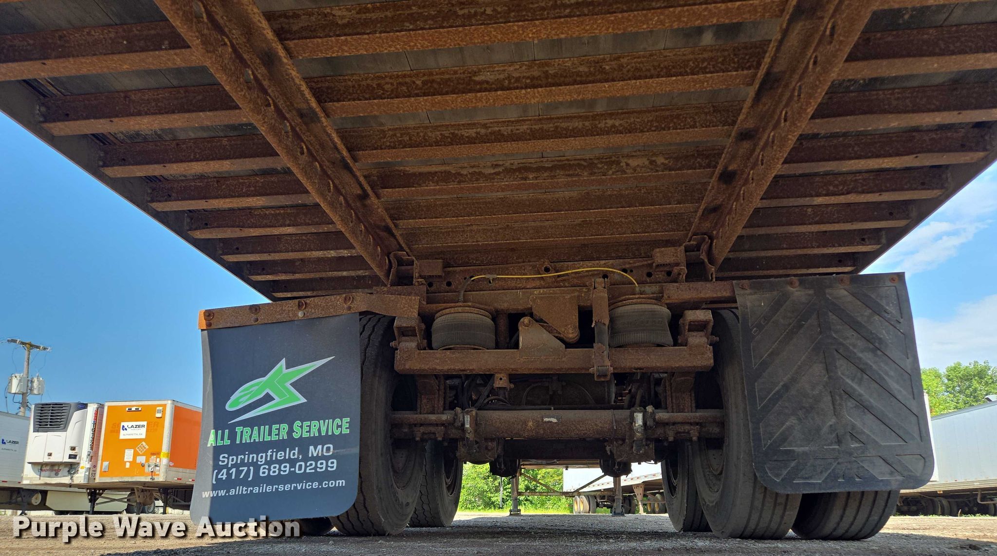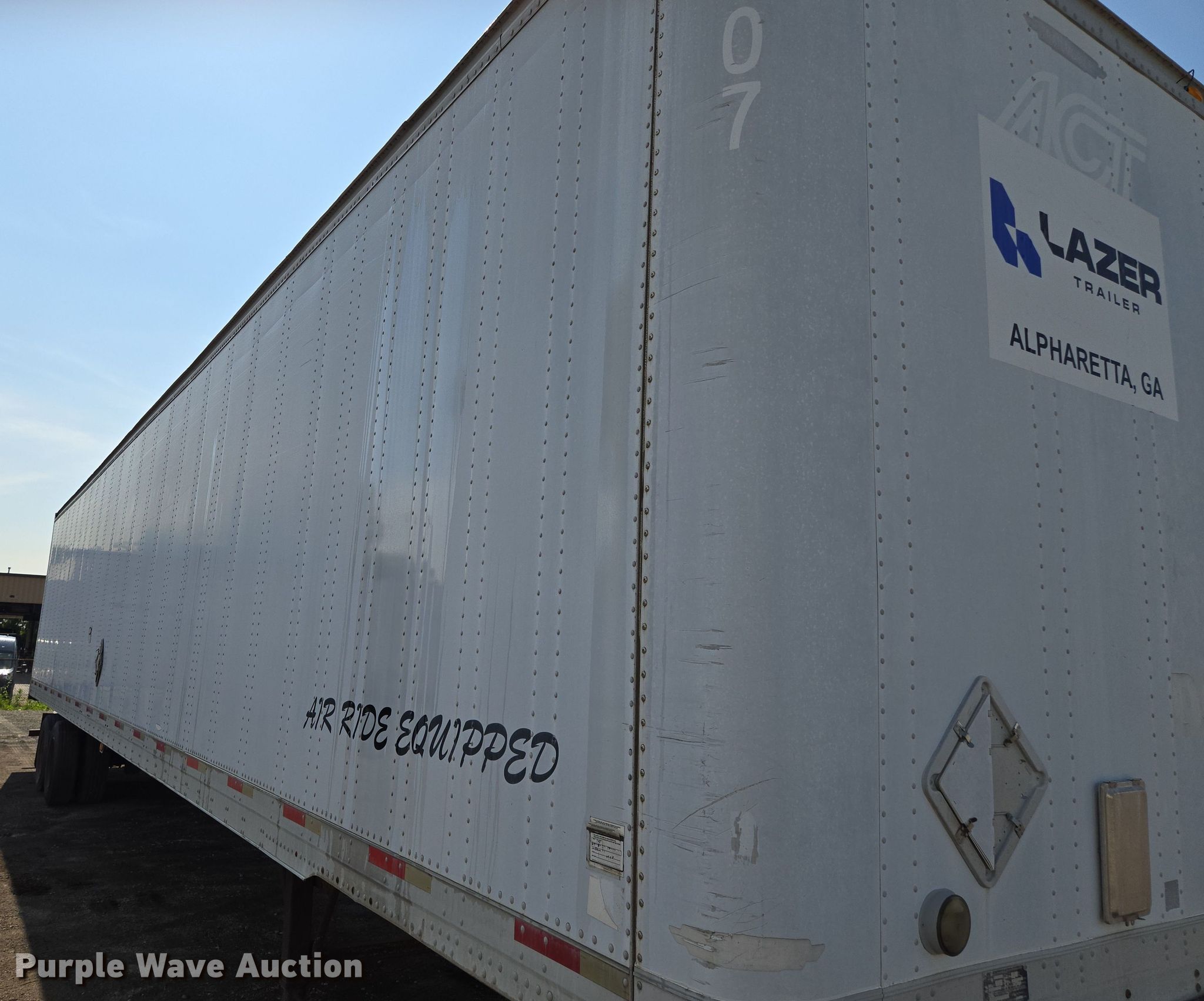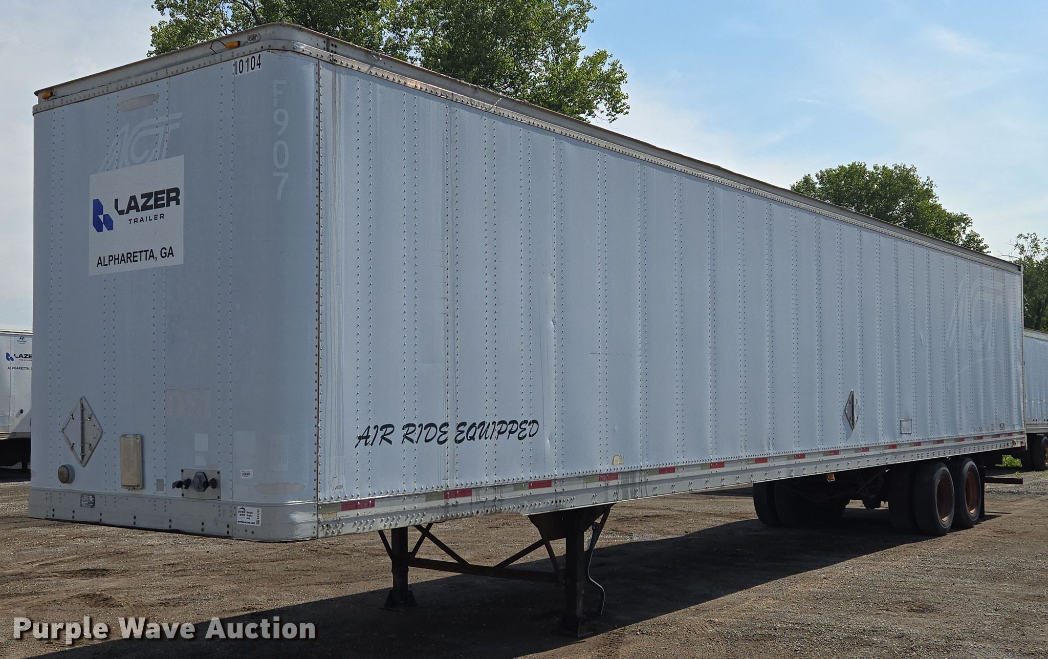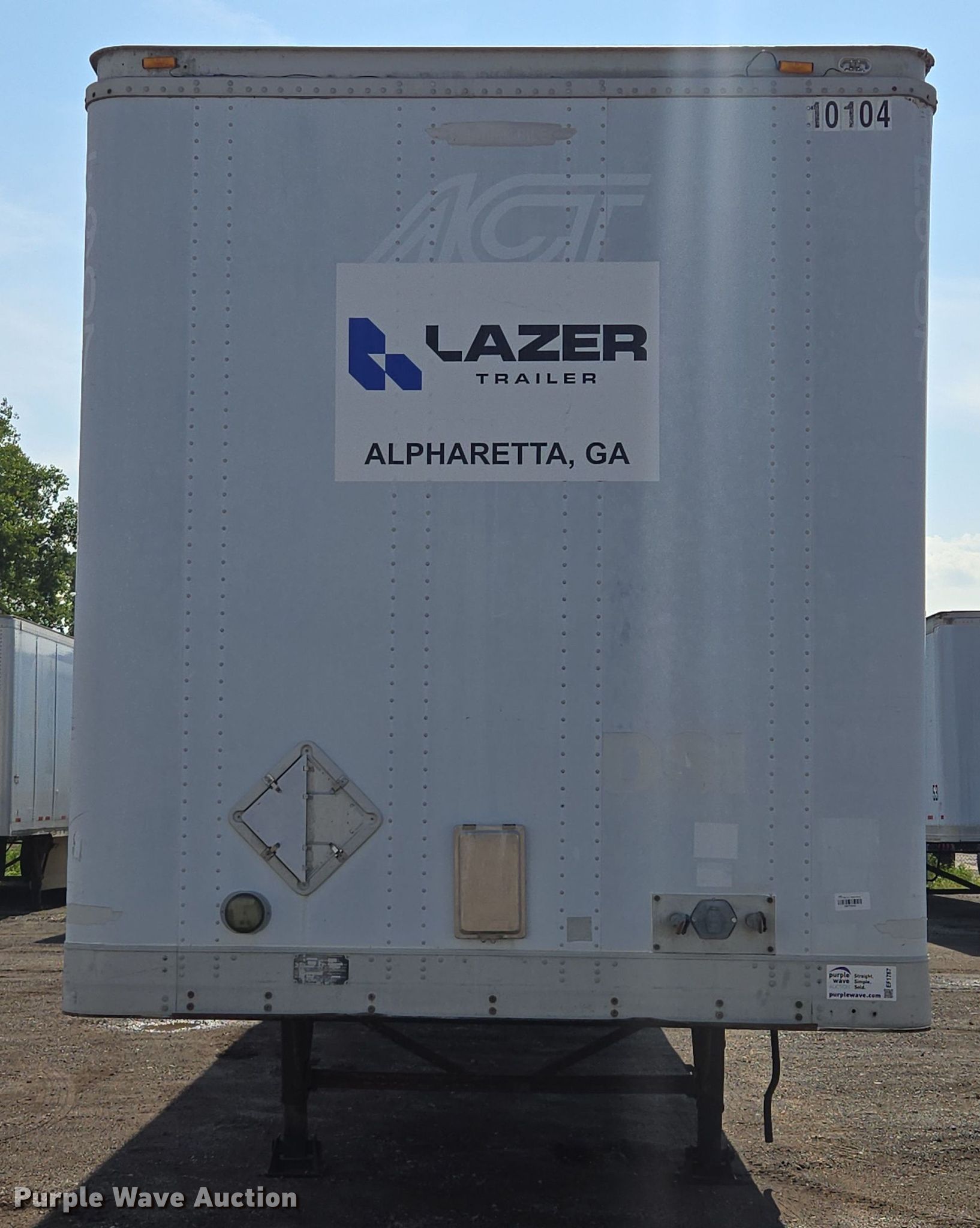 2001 Trailmobile dry van trailer. VIN: 1PT01JAH118001197, Unit #: 10104. Dimensions Overall Length: 53', Width: 102". Features Deck type: Wood. Chassis Landing gear: Dual, Suspension: Air, Brakes: Air, Axles: Tandem Sliding, GVWR: 65,000 lbs. Tires Steel wheels, Size: 295/75R22.5. Notes Frame damage, rust. Georgia title. Title distribution may be delayed up to 14 days from verification of funds. Lazer Trailers. 3414 Gardner Avenue. Kansas City, MO 64120