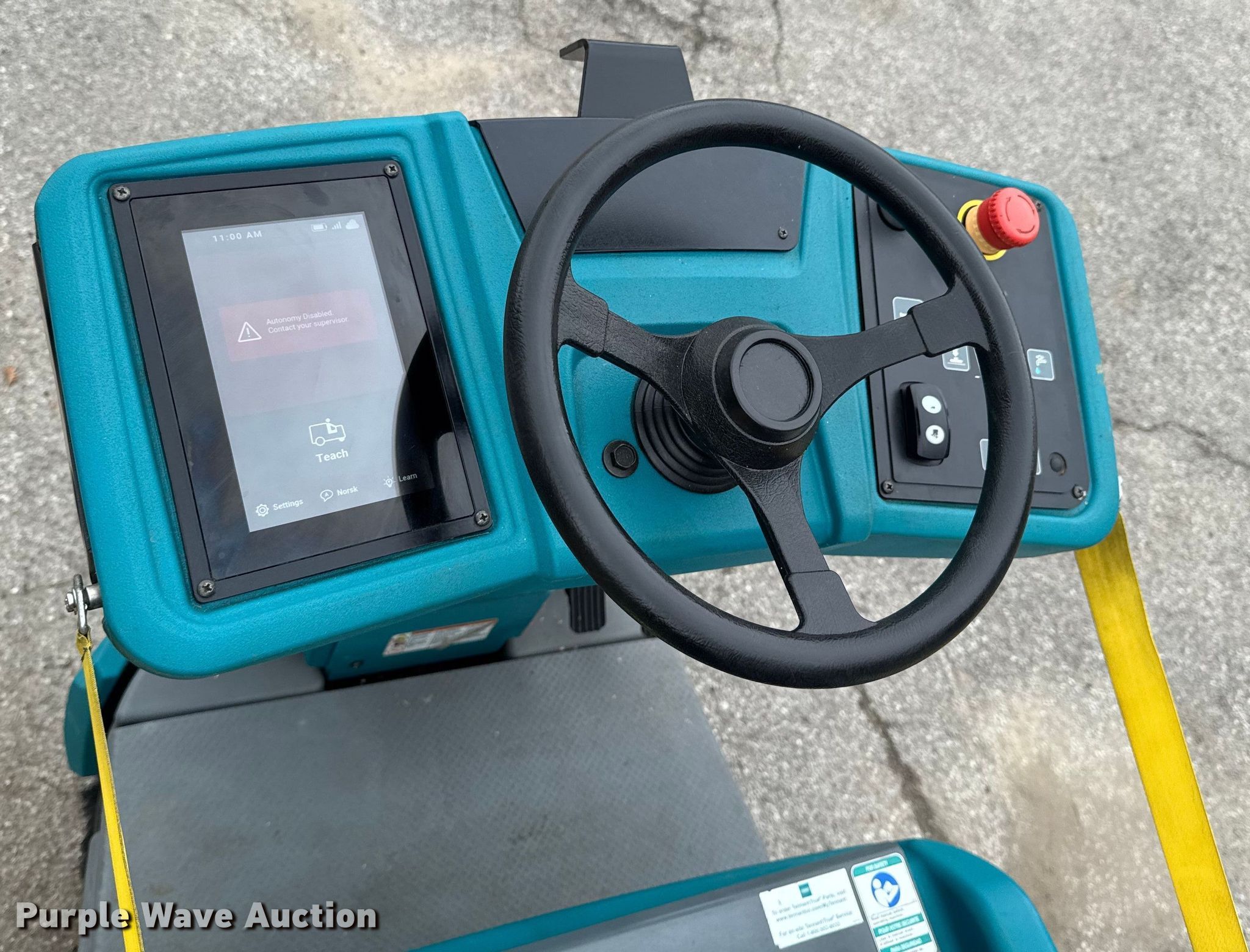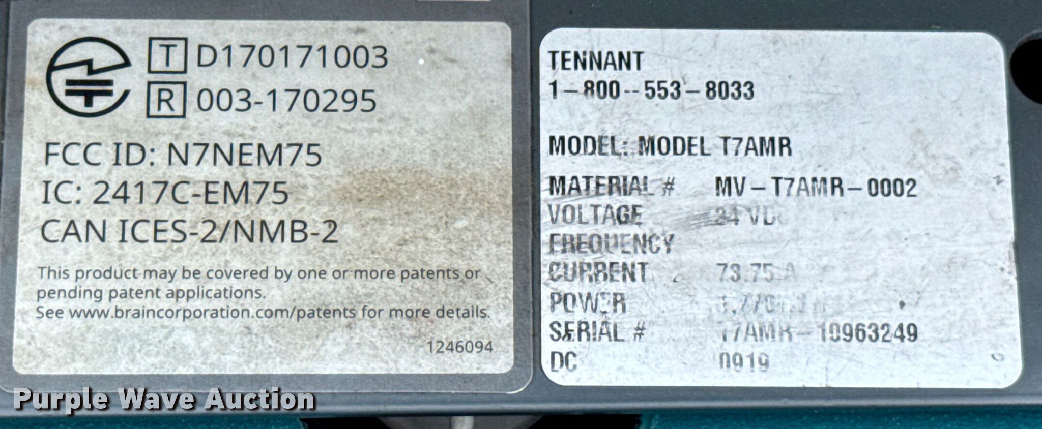 2019 Tennant T7AMR floor scrubber. Hours: 4,248 on meter, Serial: T7AMR-10963249. Electric motor Volts: 24. Transmission Hydrostatic. Operators station Video monitoring system. Features BrainOS3 automatic sweeper system, Sweeper bed type: Vacuum, Broom Width: 24", Water spray system. Tires Size: 225x80. Notes Warning indicator: Autonomy Disabled, Battery charger included. Collinsville, OK 74021
