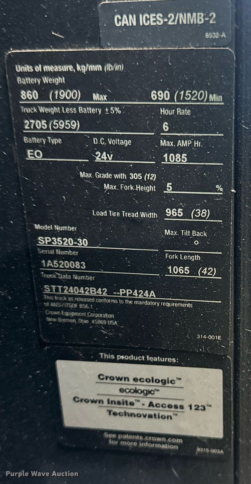 2018 Crown SP3520-30 order picker. Hours: 419 on meter, Miles or hours may vary, unit still in use, Serial: 1A520083, Unit #: SFS1611. Electric Motor Volts: 24. Transmission Electric drive. Features Maximum lift capacity: 3,000 lbs, Maximum lift height: 240", Collapsed mast height: 107", Mast stages: 3, Fork length: 42". Tires Solid. Ferguson. Appleton, WI 54911