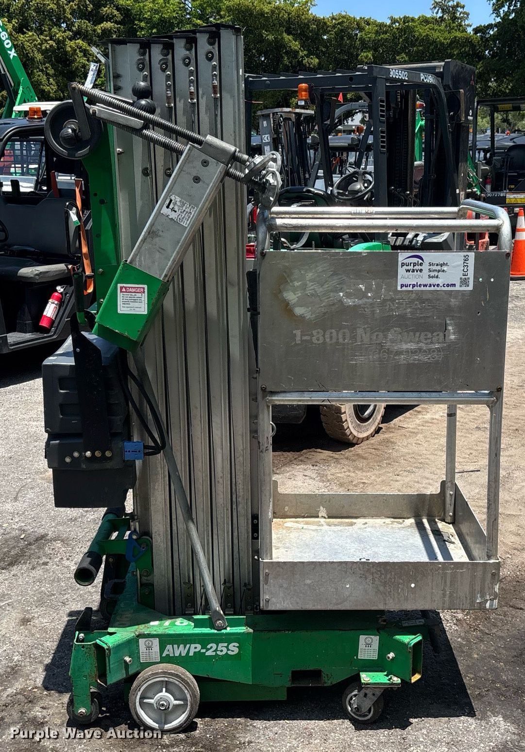2016 Genie AWP-25S vertical lift. Serial: AWP16-84350. Electric Motor HP: 2.4, Volts: 12. Features Maximum lift capacity: 350 lbs, Maximum lift height: 24' 11", Platform: 27" L x 26" W, AC power outlet, Controls: Platform, Ground. Tires Solid. Notes Dead battery. Sunbelt Rentals. West Palm Beach, FL 33407